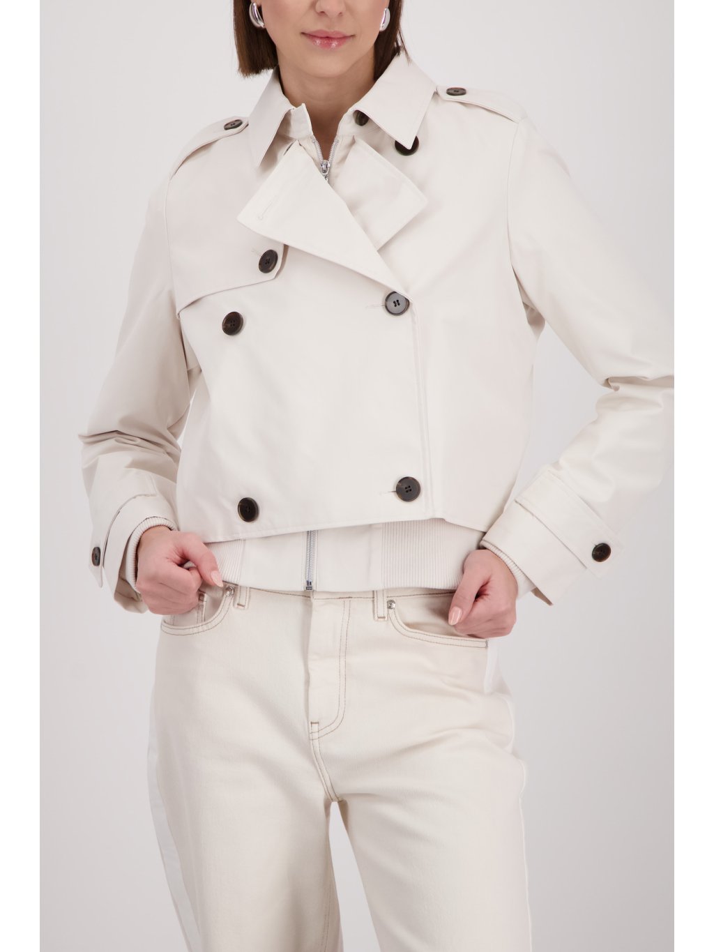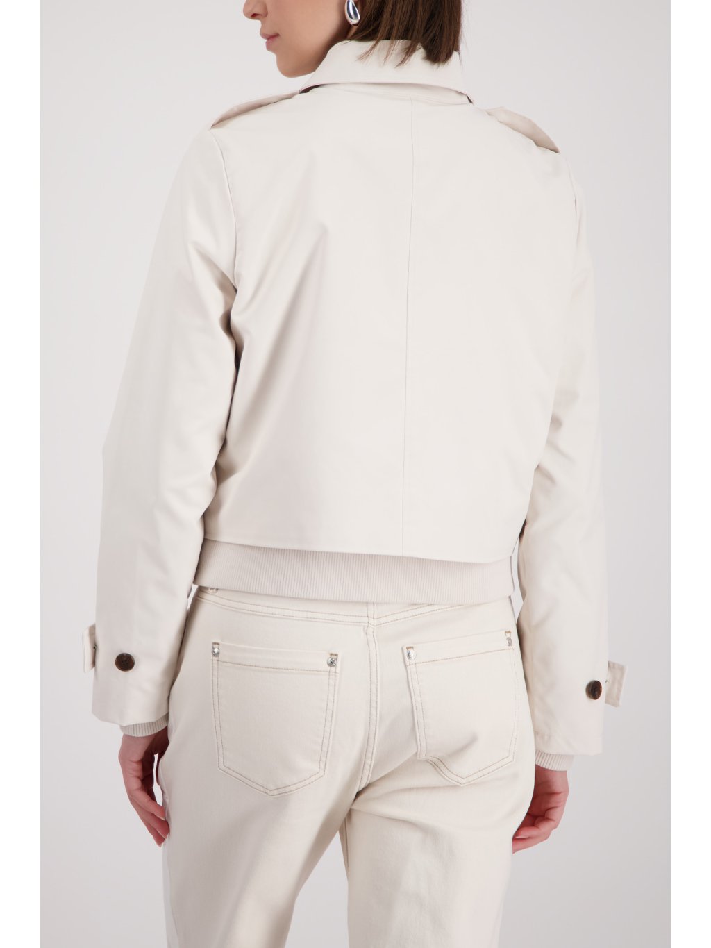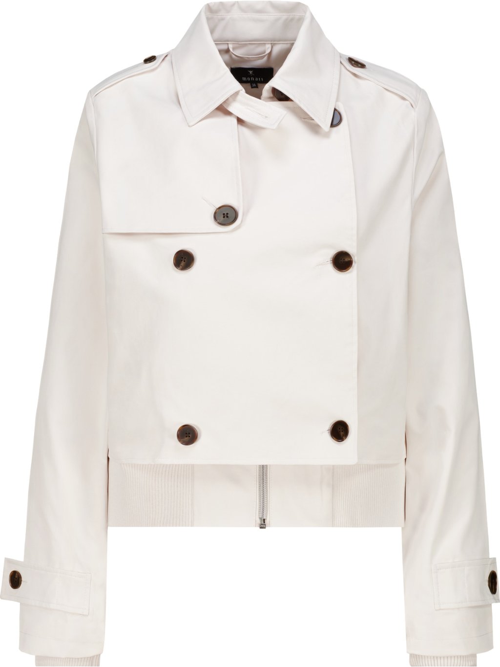 Dámská bunda Monari Elegantní dámská bunda Monari zaujme na první pohled svým moderním a nadčasovým designem. Světlý odstín dodává modelu jemný a sofistikovaný vzhled, který se snadno kombinuje s různými styly oblečení. Bunda Monari má klasický límec a dvojřadé zapínání na knoflíky, které je doplněno skrytým zipem pro větší praktičnost. Stylovým detailem jsou kontrastní knoflíky, ozdobné klopy a dekorativní prvky na rukávech. Spodní část bundy je doplněna pružným lemem, který zajišťuje pohodlí při nošení a dodává modelu moderní siluetu. Díky svému elegantnímu střihu je bunda Monari ideální volbou pro každodenní nošení i pro formálnější příležitosti. Skvěle se hodí k džínům, kalhotám i šatům a vytvoří stylový outfit pro různé příležitosti.