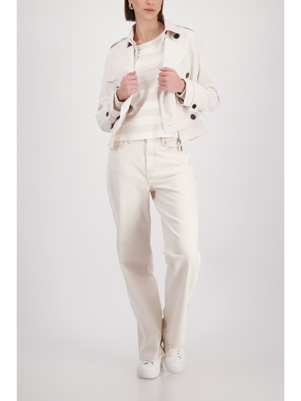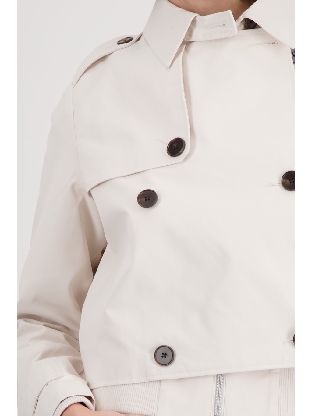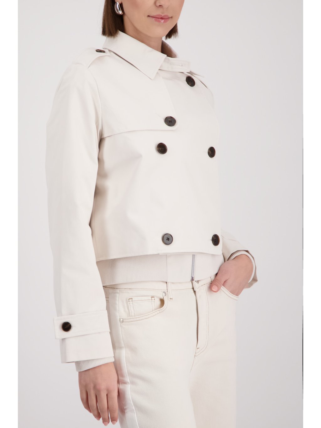 Dámská bunda Monari Elegantní dámská bunda Monari zaujme na první pohled svým moderním a nadčasovým designem. Světlý odstín dodává modelu jemný a sofistikovaný vzhled, který se snadno kombinuje s různými styly oblečení. Bunda Monari má klasický límec a dvojřadé zapínání na knoflíky, které je doplněno skrytým zipem pro větší praktičnost. Stylovým detailem jsou kontrastní knoflíky, ozdobné klopy a dekorativní prvky na rukávech. Spodní část bundy je doplněna pružným lemem, který zajišťuje pohodlí při nošení a dodává modelu moderní siluetu. Díky svému elegantnímu střihu je bunda Monari ideální volbou pro každodenní nošení i pro formálnější příležitosti. Skvěle se hodí k džínům, kalhotám i šatům a vytvoří stylový outfit pro různé příležitosti.