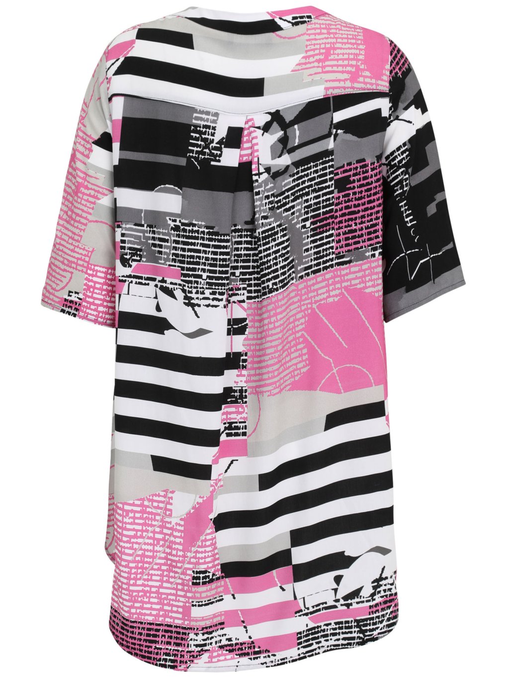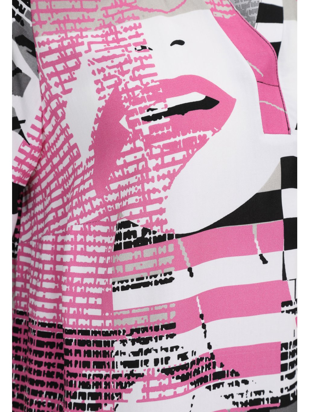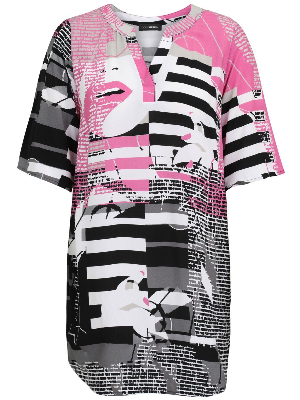 Model, který nepřehlédnete. Tato halenka Doris Streich zaujme moderním grafickým potiskem v kombinaci černé, bílé, šedé a výrazné růžové. Abstraktní motiv s pruhy a stylizovaným portrétem dodává modelu originální, módní charakter a dělá z něj statement kousek každého outfitu. Volnější střih zajišťuje maximální pohodlí a příjemné nošení po celý den. Výstřih do jemného „V“ opticky prodlužuje krk a působí velmi žensky. Rukávy v délce k loktům dodávají modelu lehkost a zároveň lichotí paži. Prodloužená délka je ideální i pro ženy, které preferují zakrytí oblasti boků. Halenka Doris Streich se skvěle kombinuje s černými kalhotami, úzkými džínami i elegantními letními kalhotami. Stačí zvolit jednoduché doplňky a nechat vyniknout samotný design. Pokud hledáte výrazný a přitom pohodlný kousek do šatníku, Doris Streich je sázka na jistotu. Značka Doris Streich je známá důrazem na kvalitní materiály, perfektní střihy a originální potisky – a tento model je toho jasným důkazem.Doplňkové parametry