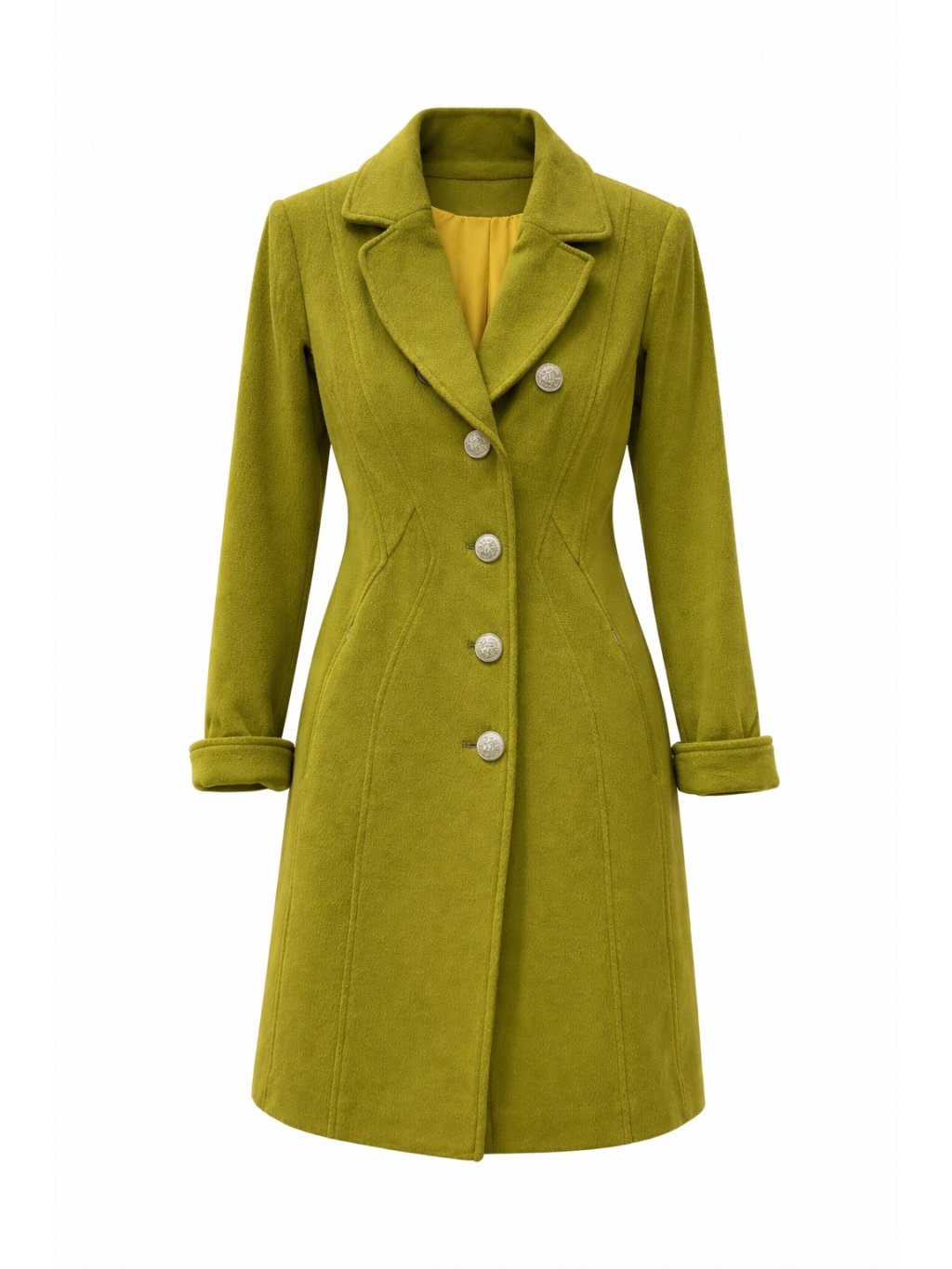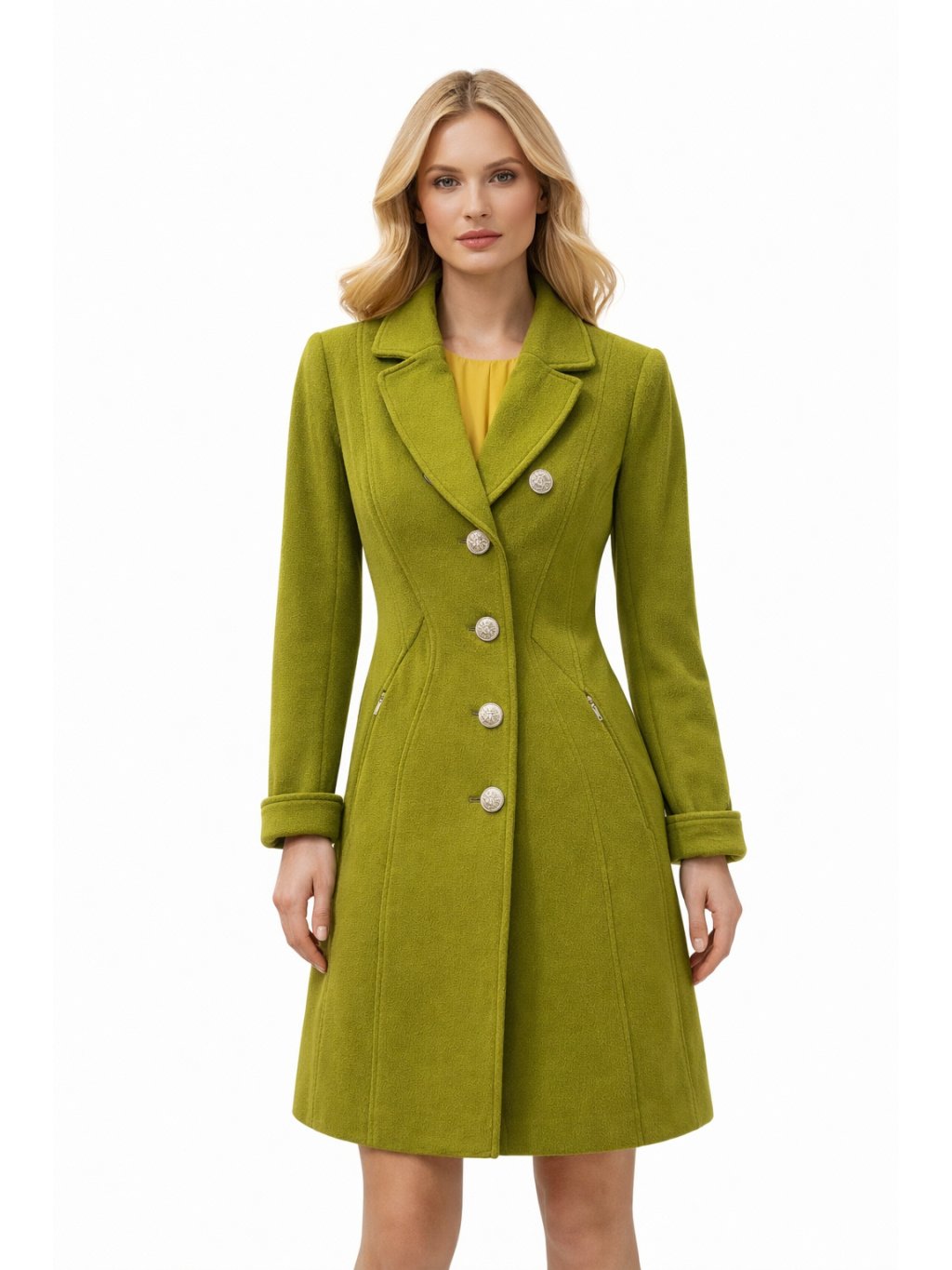 Dámský kabát v olivově zeleném odstínu z jemně vlněného materiálu s elegantním projmutým střihem, který krásně zvýrazní siluetu. Klasický límec a výrazné ozdobné knoflíky dodávají kabátu nadčasový a ženský vzhled.Doplňkové parametry