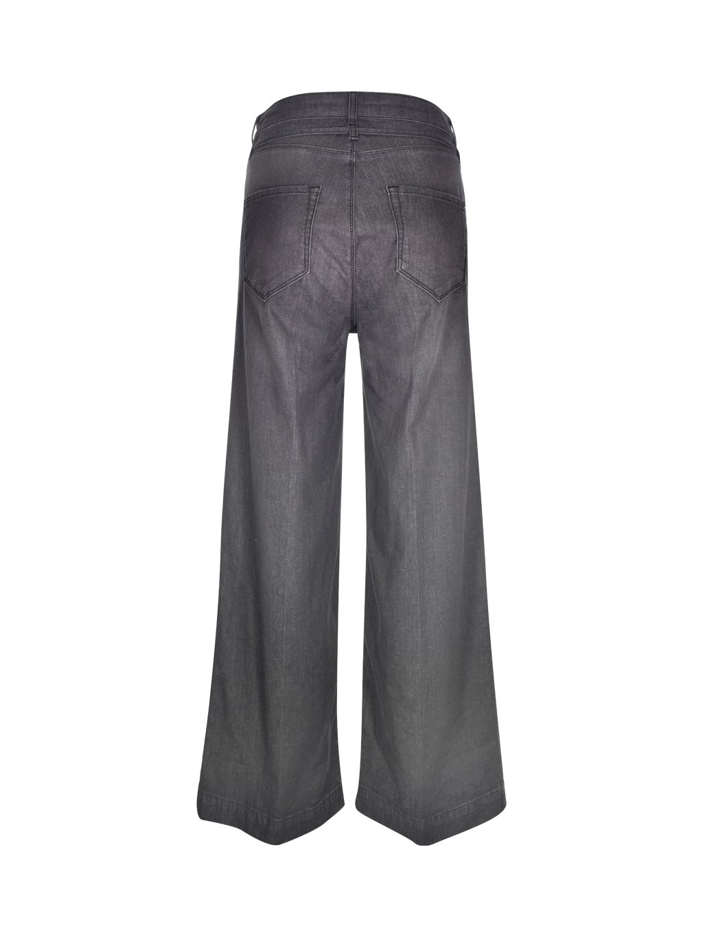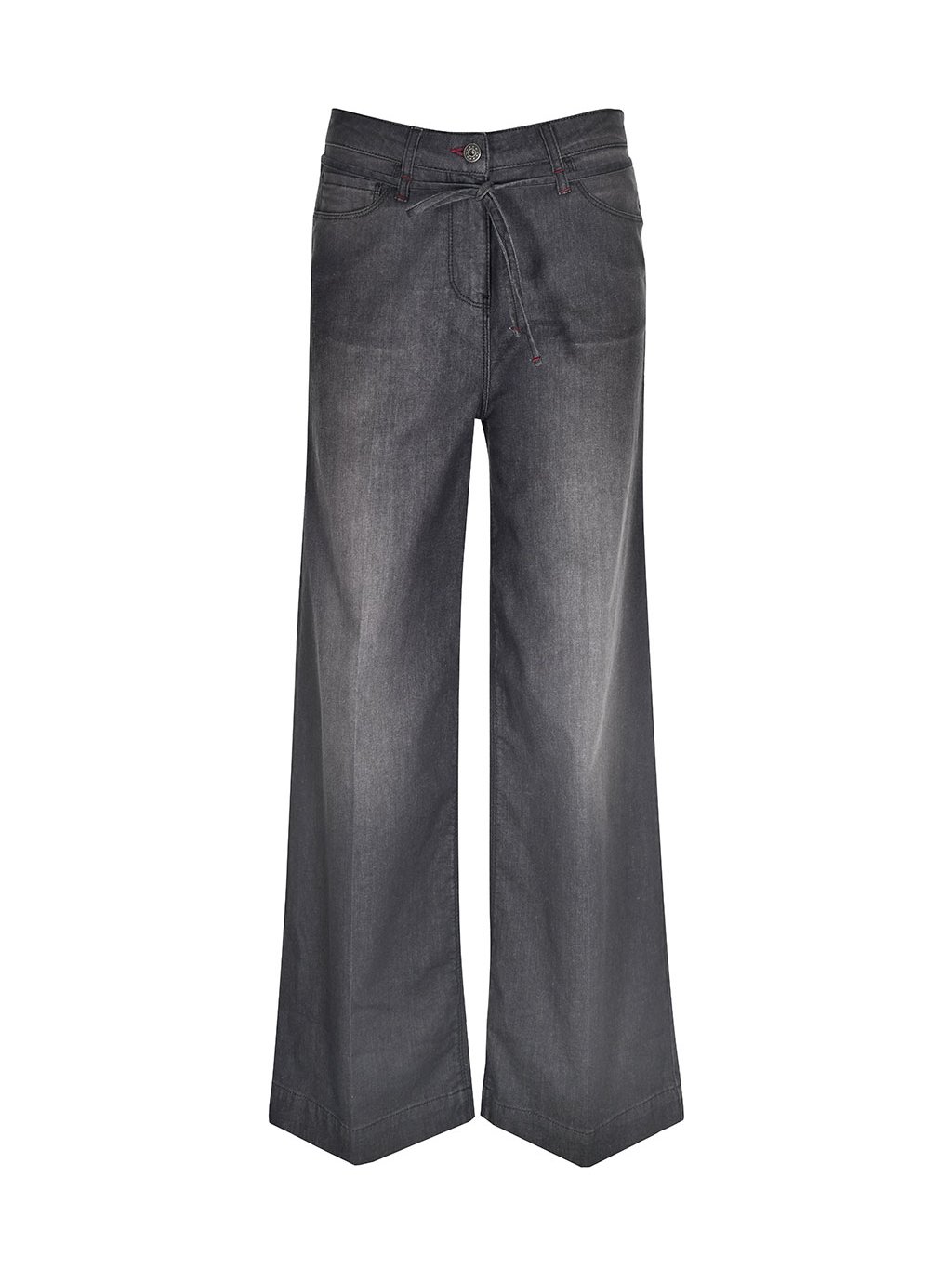 Dámské kalhoty v moderní šedočerné barvě s džínovým vzhledem. Mají rovnou, širokou nohavici a v pase jsou ozdobené stylovou šňůrkou pro pohodlné a ležérní nošení.