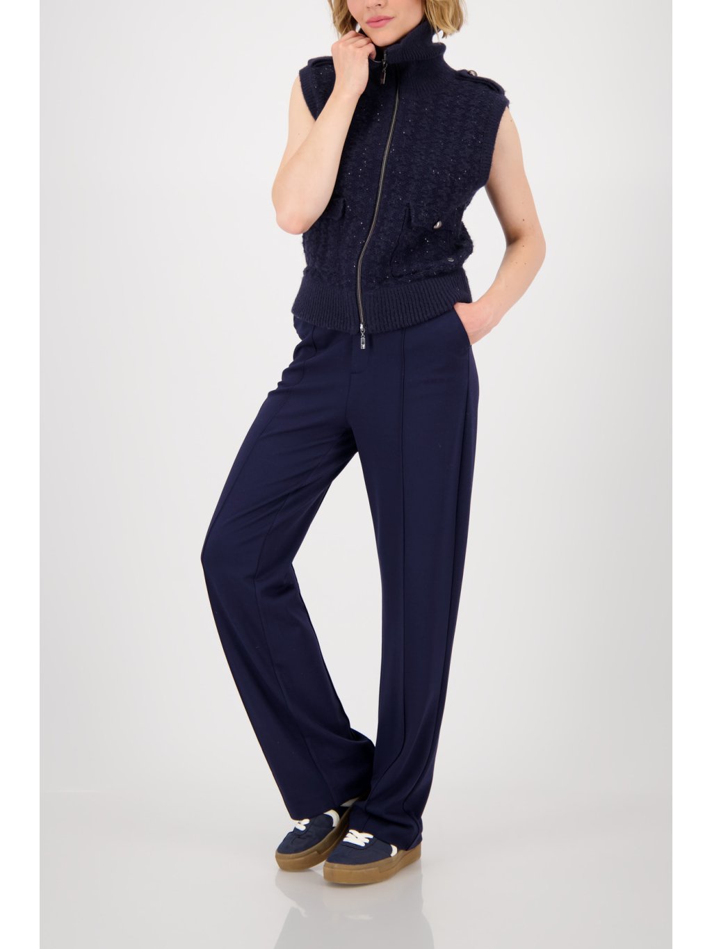 Dámské společenské kalhoty s puky působí elegantně a opticky prodlouží vaši siluetu. Jsou ideální volbou do práce, na formální příležitosti i večerní setkání.
