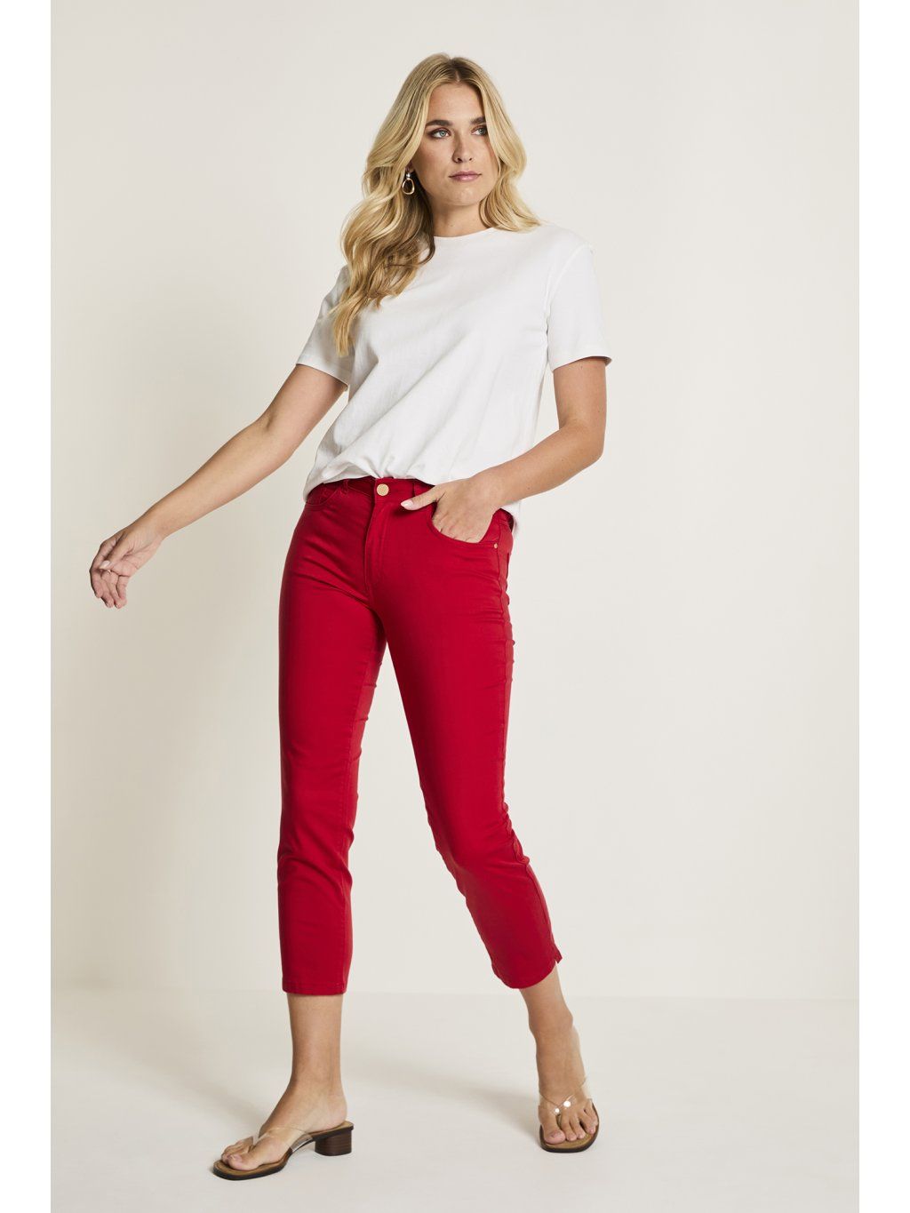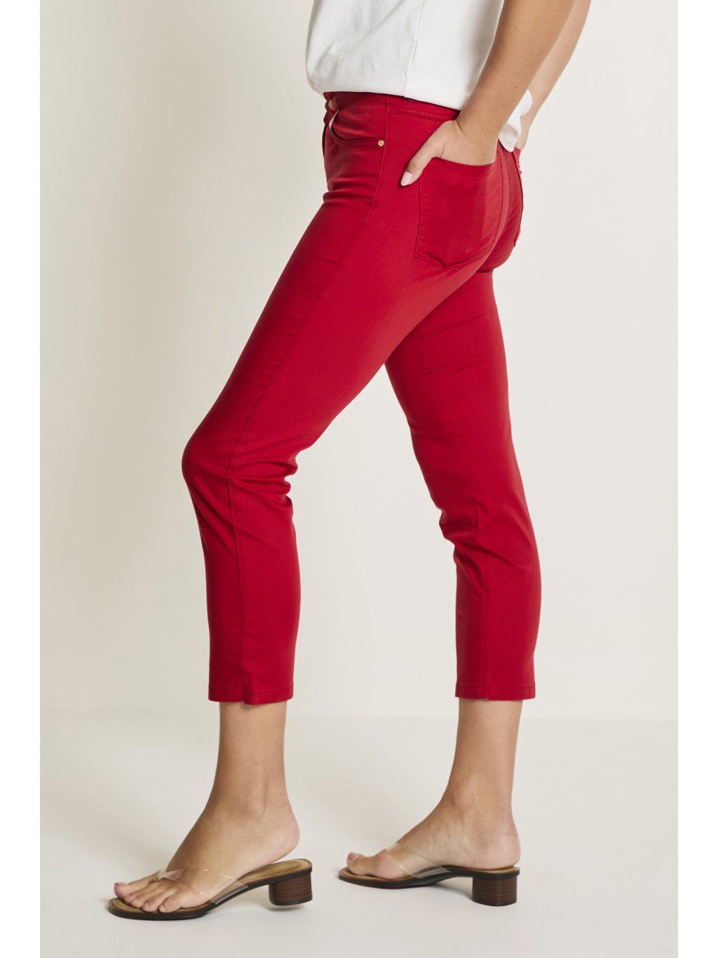 Červené kalhoty Para-Mi model Capri zaujmou svěží barvou a moderním střihem. Kalhoty Para-Mi jsou vyrobeny z kvalitní kombinace bavlny a Tencelu, která zajišťuje příjemný pocit na těle, prodyšnost a lehkost. Model Para-Mi je v délce 7/8, což z nich dělá ideální volbu pro teplejší dny a stylové letní outfity. Pohodlný a elegantní kousek pro každodenní nošení, ve kterém se budete cítit skvěle po celý den.