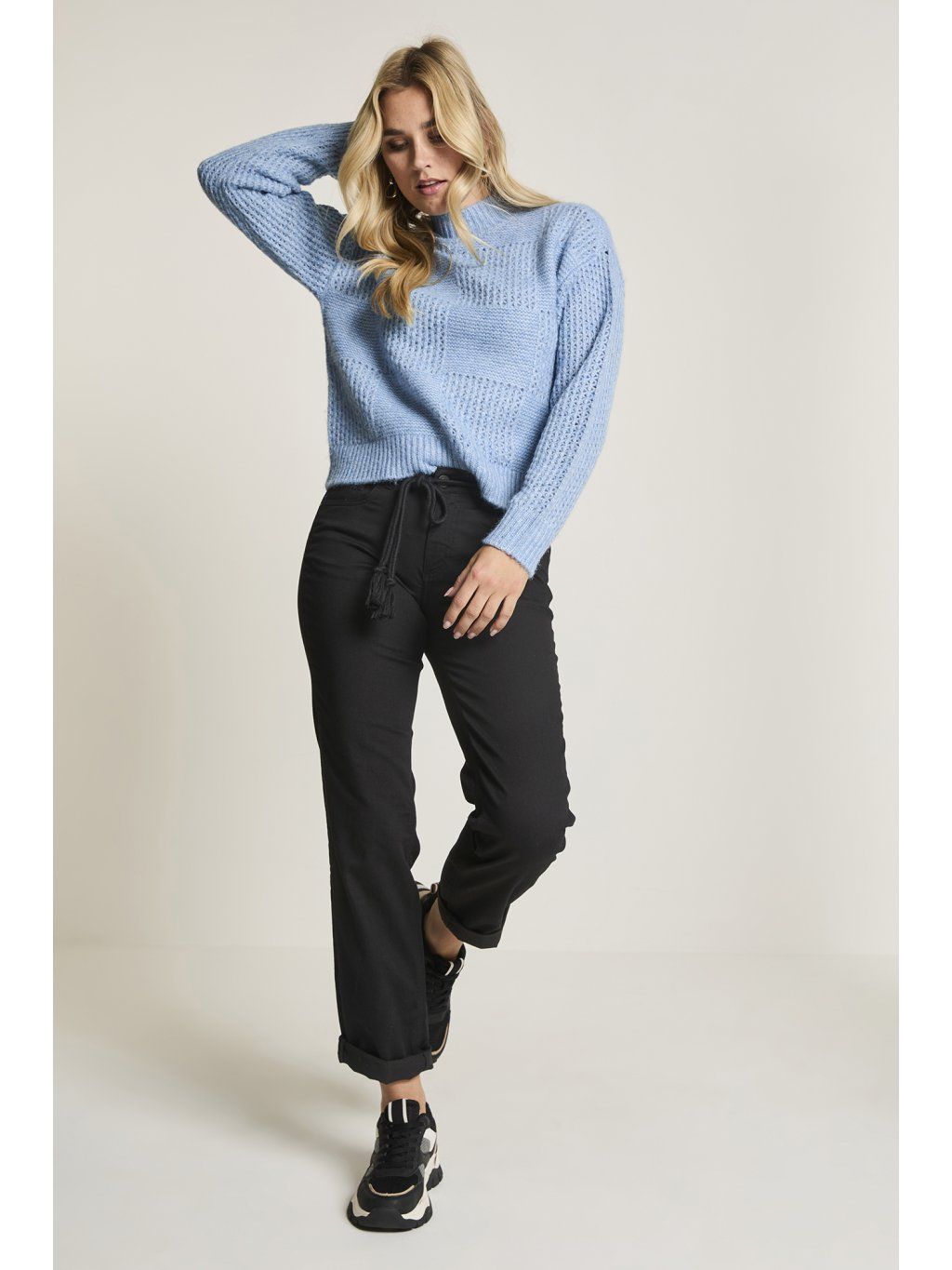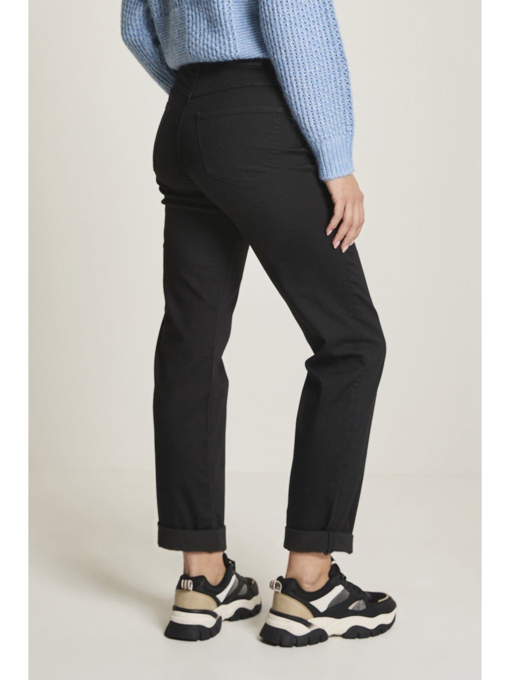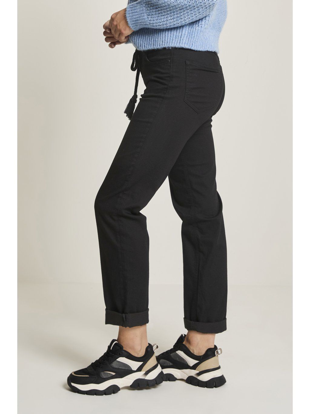Stylové černé džínové kalhoty s klasickým 5kapsovým střihem, které zaujmou na první pohled netradičním detailem – v pase je ozdobná šňůrka s lurexem, která nahradí klasický pásek a dodá outfitu jemný lesk a ženský šmrnc. Díky příjemnému a pružnému materiálu se skvěle nosí po celý den – ať už do práce, na kávu s kamarádkou nebo na víkendový výlet.