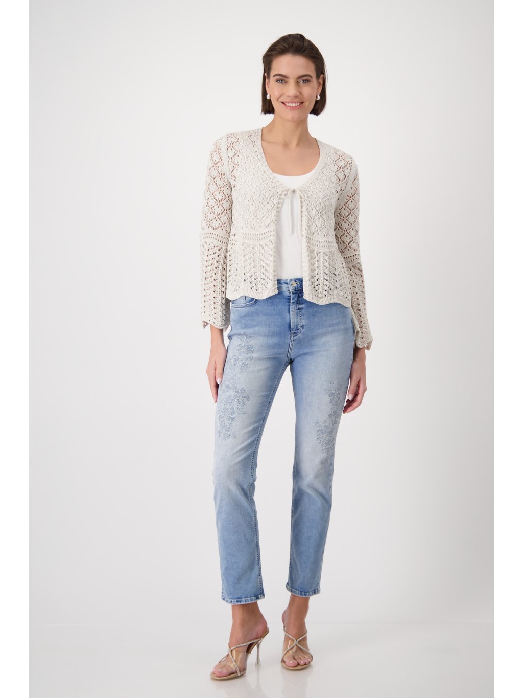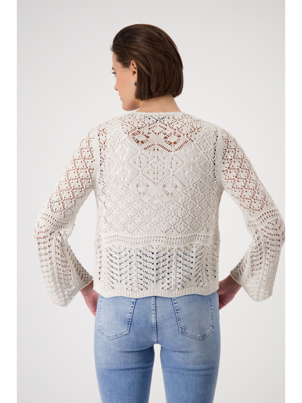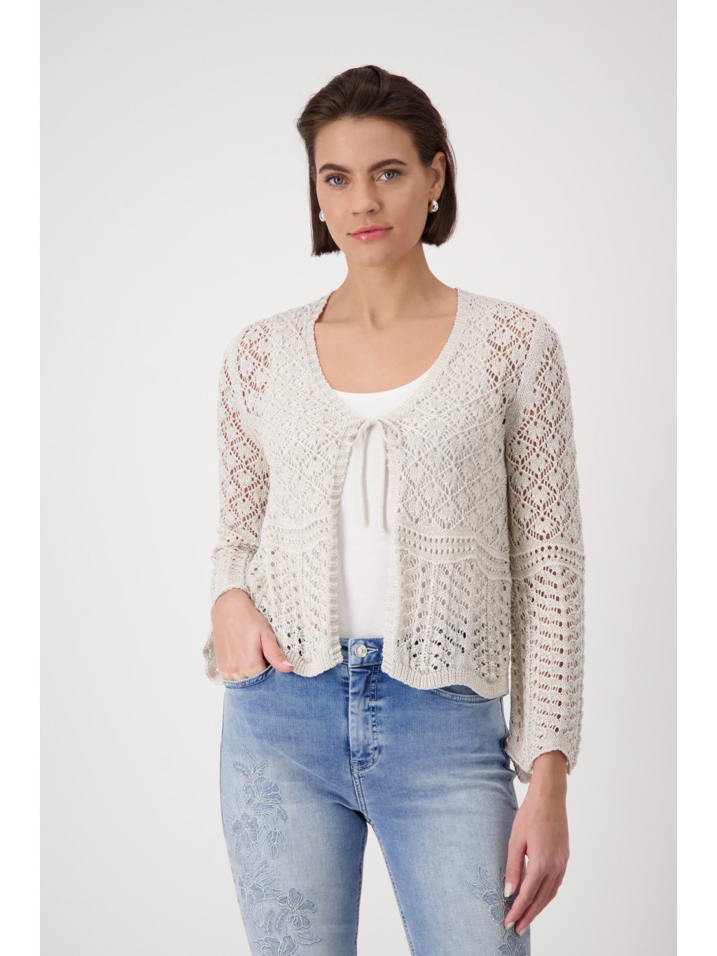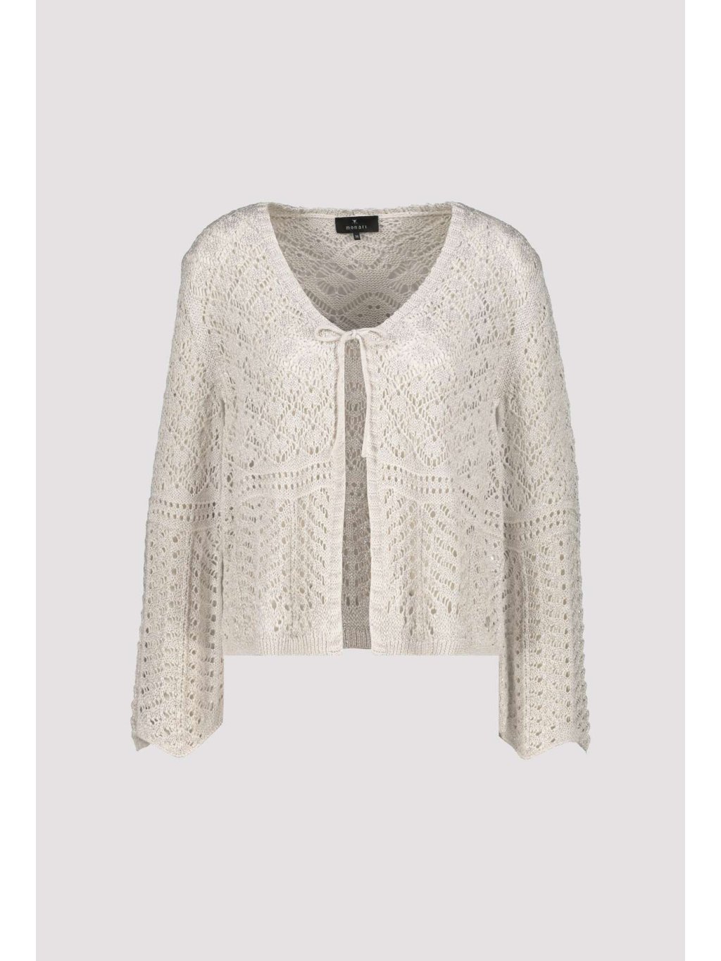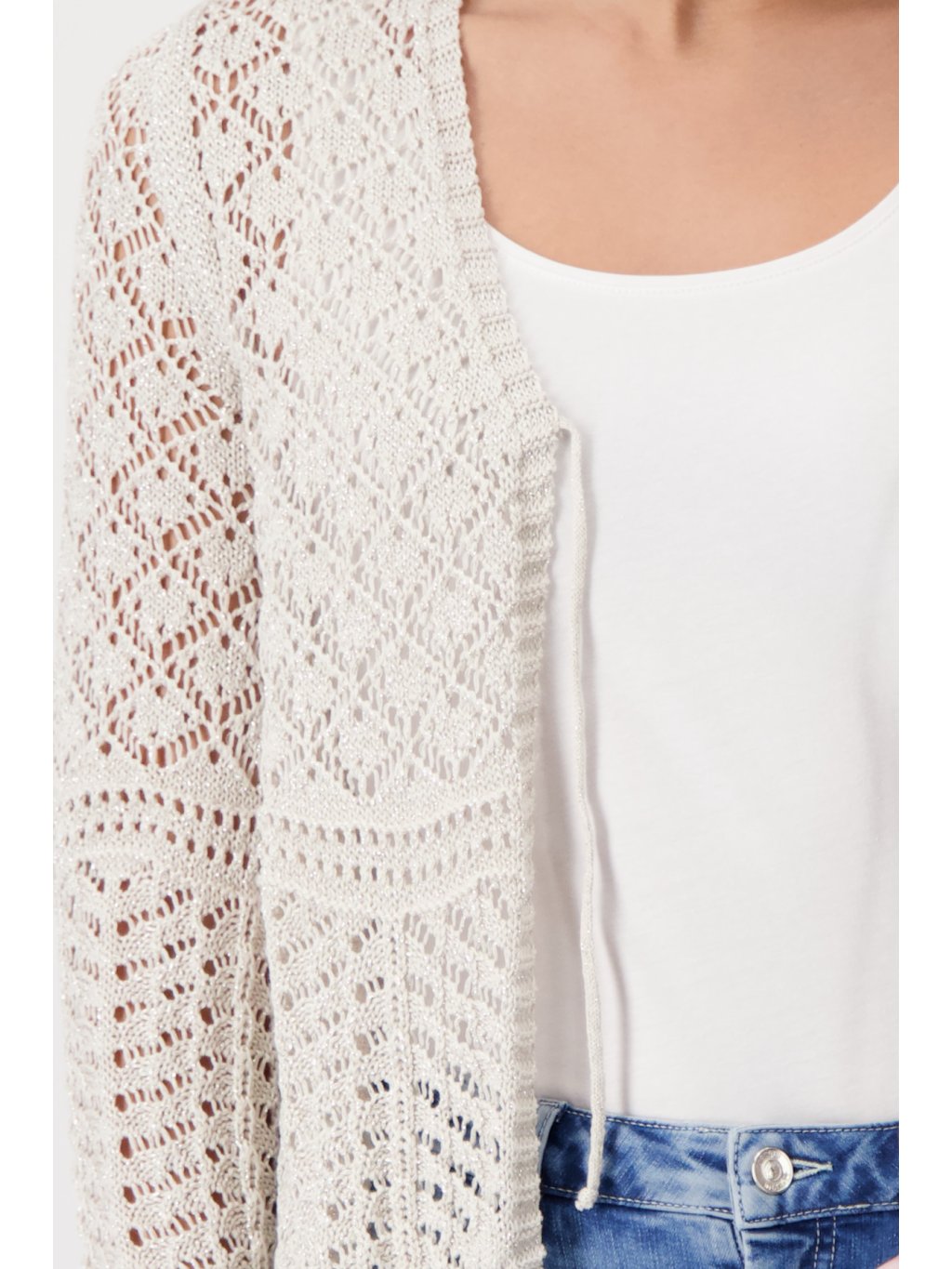 Dámský háčkovaný kardigan s lurexem v krémové barvě. Zavazování u krku, délka do pasu. Jemně třpytivý kousek pro lehký a ženský vzhled.Doplňkové parametry
