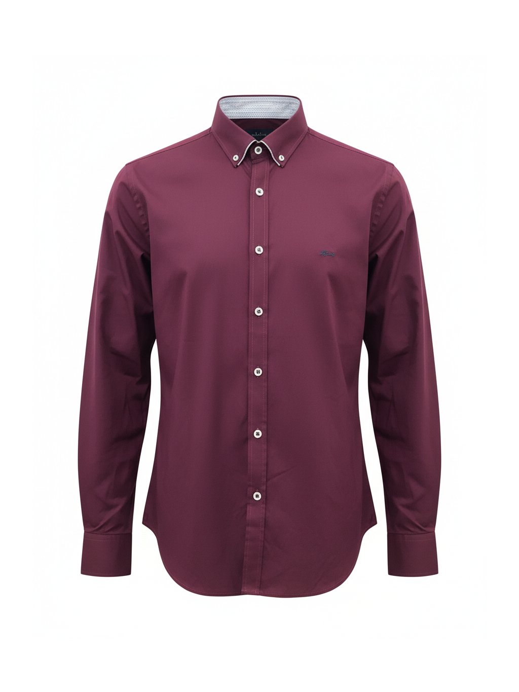 Jednobarevná pánská košile v elegantním vínovém odstínu, kterou zdobí kontrastní bílé knoflíčky a decentně lemovaný límeček. Stejné lemování se opakuje i na manžetách, což podtrhuje precizní zpracování a stylový vzhled. Košile je ušitá z příjemného materiálu, který zajistí komfort po celý den.