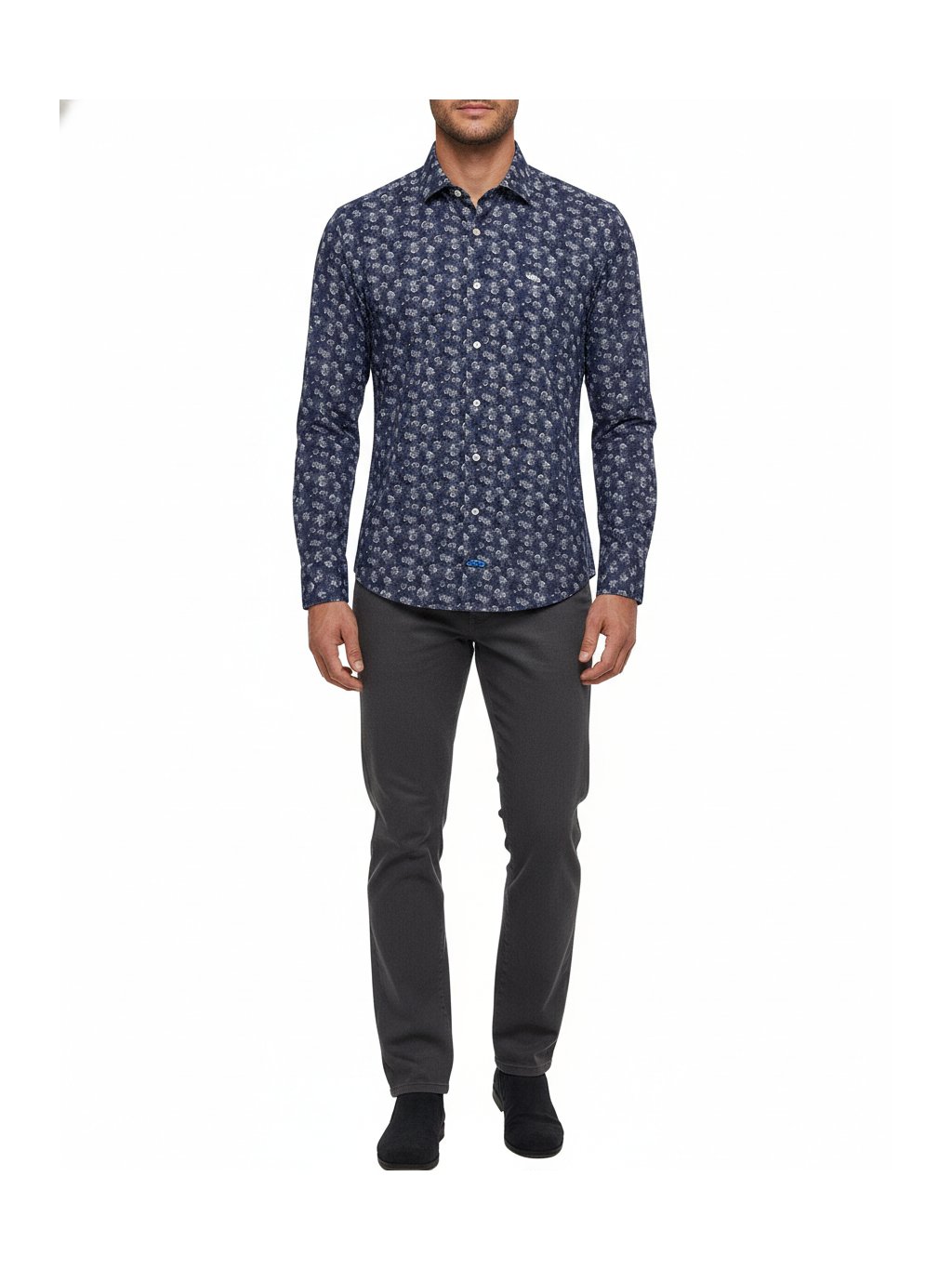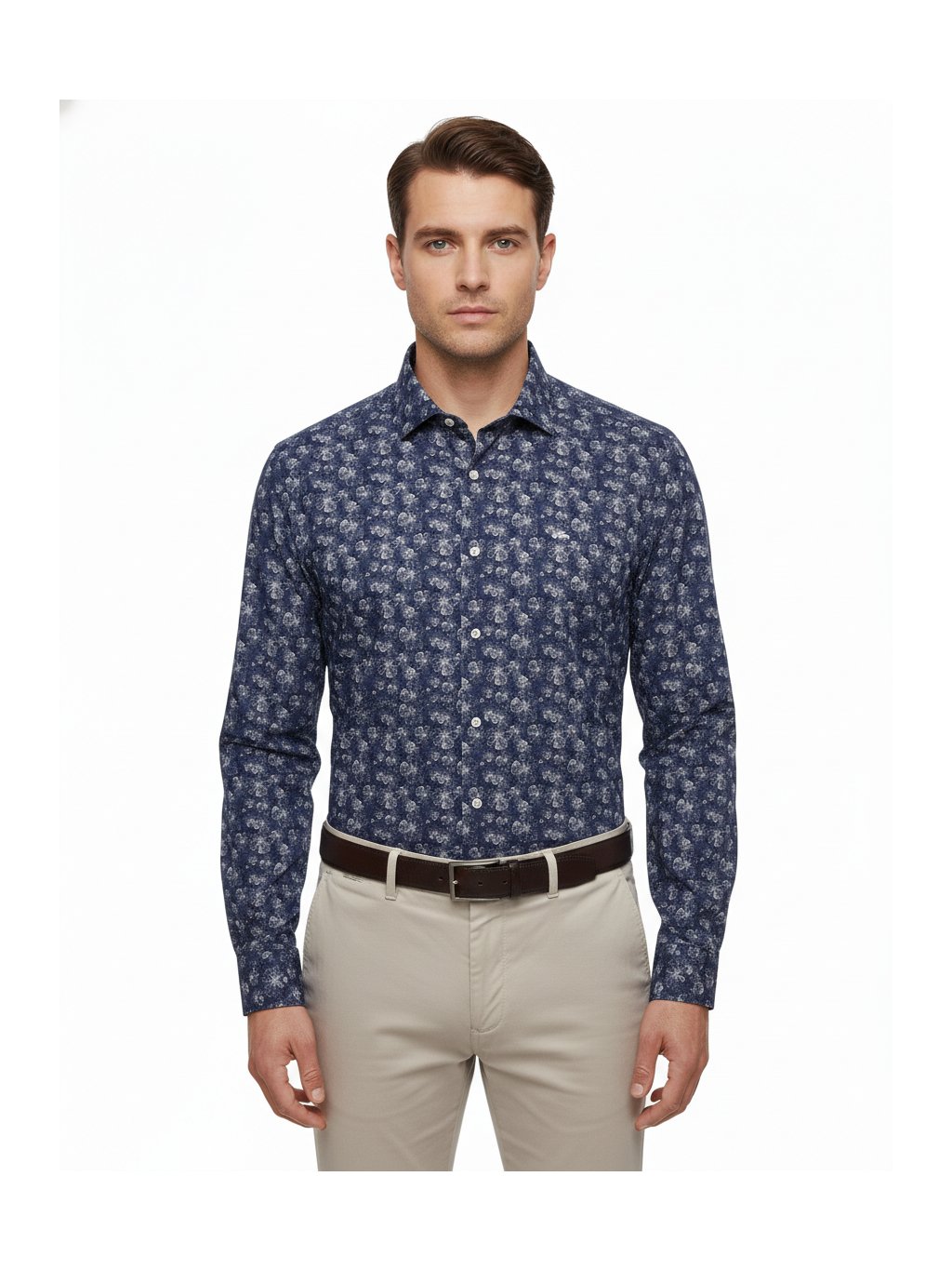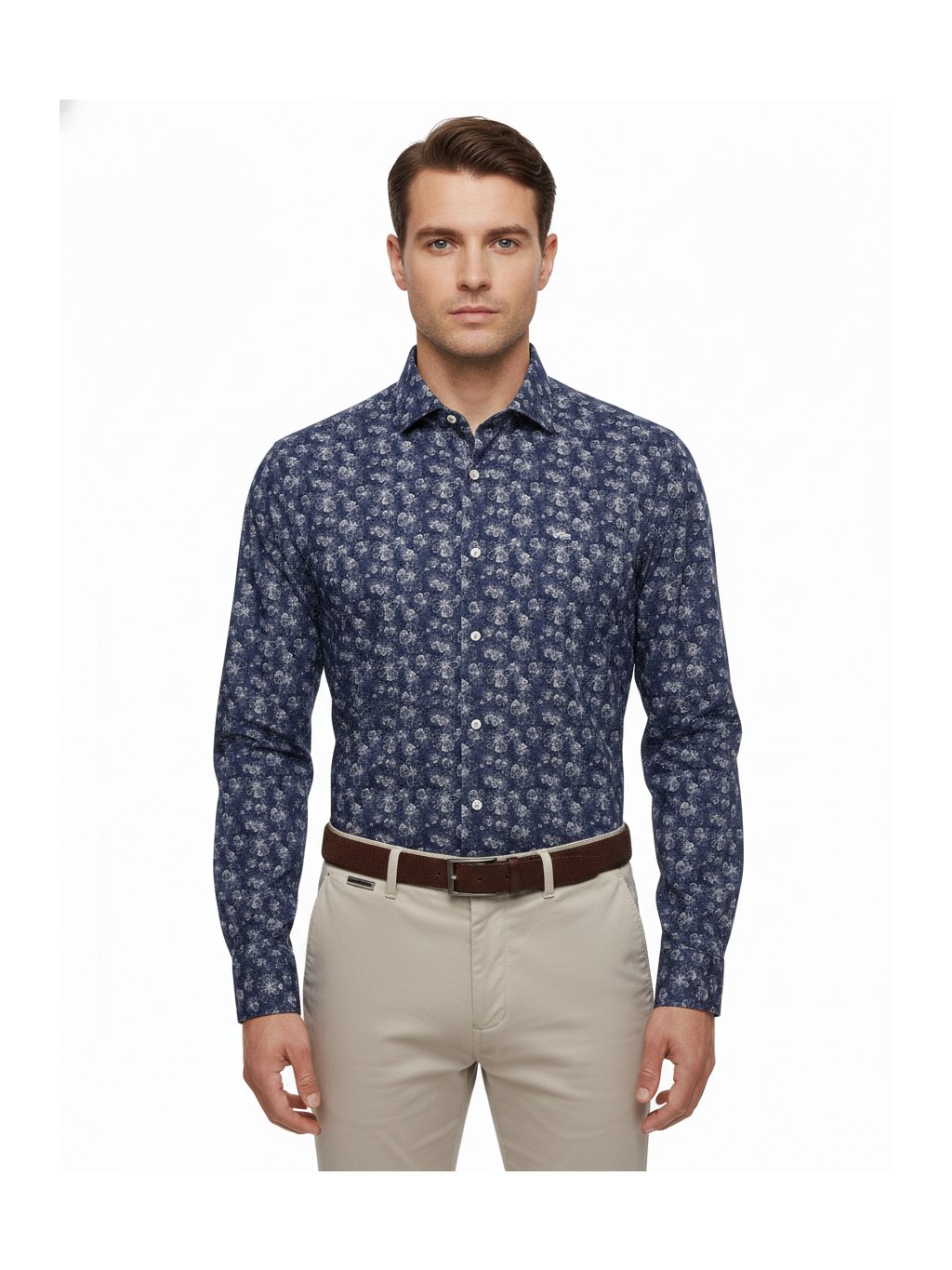 Stylová a elegantní košile s modrým podkladem a jemnými bílými květy, která zaujme na první pohled, ale zůstává vkusná a nositelná. Několikrát upravovaná 100% bavlna zaručuje mimořádně příjemné nošení, měkkost a komfort po celý den. Dlouhý rukáv a klasický límeček podtrhují elegantní charakter košile a dělají z ní univerzální kousek vhodný do práce, na společenské události i večerní setkání.