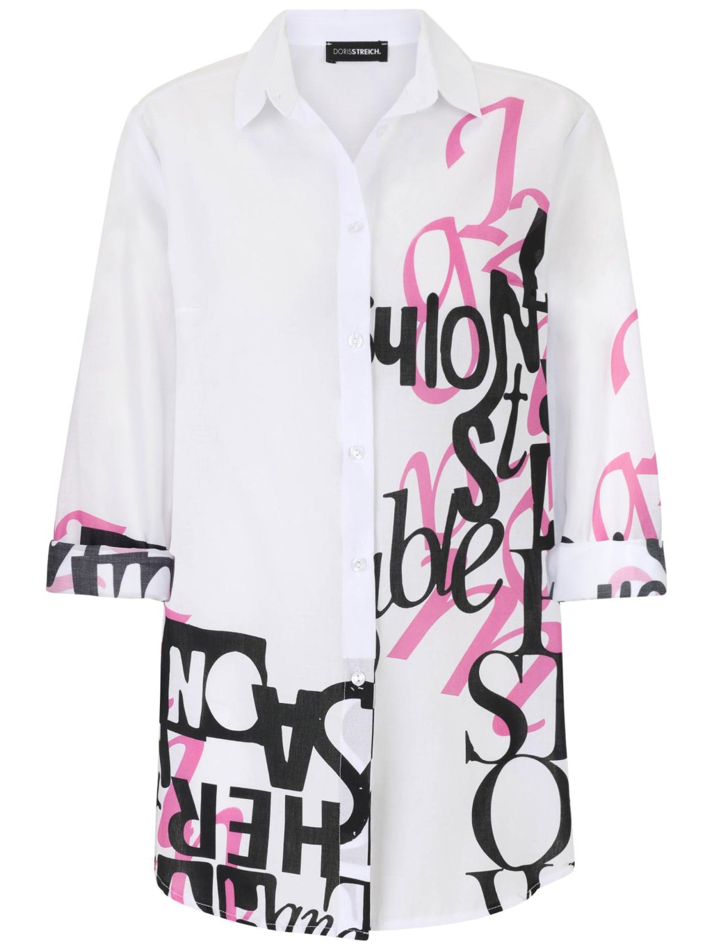 Košile, která mluví za vás. Tento model zaujme čistým bílým základem doplněným výrazným grafickým potiskem v černé a růžové barvě. Kombinace velkých písmen a dynamických linií působí moderně, energicky a dodává outfitu osobitý charakter. Klasický košilový límeček a zapínání na knoflíky vyvažují výrazný design a dodávají modelu elegantní základ. Volnější střih zajišťuje pohodlí při nošení a lichotí postavě. Rukávy lze ohrnout a vytvořit tak ležérnější styl. Délka je ideální i pro nošení přes kalhoty. Košile se skvěle kombinuje s černými kalhotami, bílými džínami i jednoduchými legínami – stačí zvolit minimalistické doplňky a nechat vyniknout samotný potisk. Doris Streich je značka, která propojuje výrazný design s pohodlím a kvalitním zpracováním. Pokud hledáte originální a sebevědomý model do svého šatníku, Doris Streich přináší přesně takový kousek, který upoutá na první pohled.Doplňkové parametry