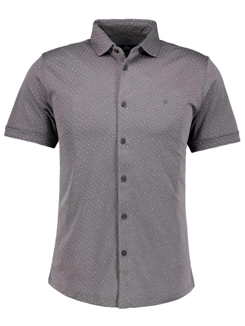 Stylová pánská košile s krátkým rukávem, která spojuje pohodlí a nadčasový vzhled. Šedý odstín doplňuje decentní vzor tvořený drobnými tečkami, který působí elegantně a zároveň nenápadně. Lehký a příjemný materiál zaručuje komfort po celý den.