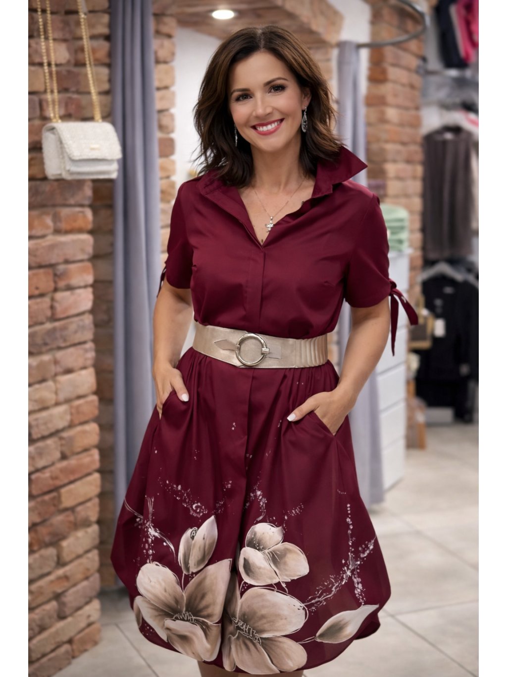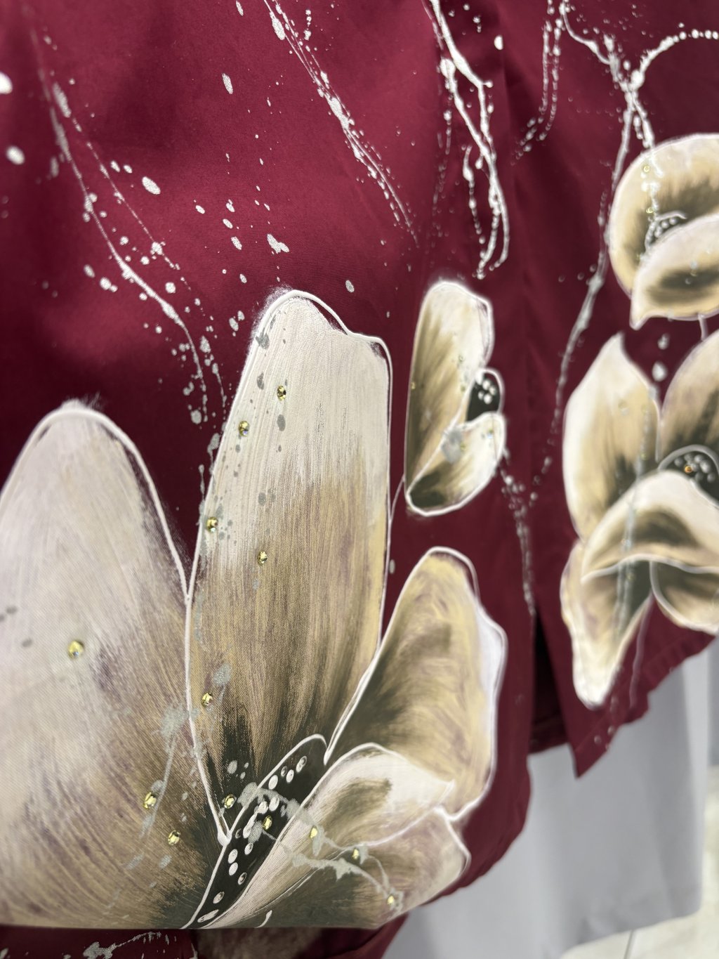 Exkluzivní košilové šaty s uměleckým rukopisem – balonové rukávy se stahováním, ručně malované motivy doplněné originálními kamínky Swarovski® a výrazné květy, které zaručí, že budete středem pozornosti.Doplňkové parametry