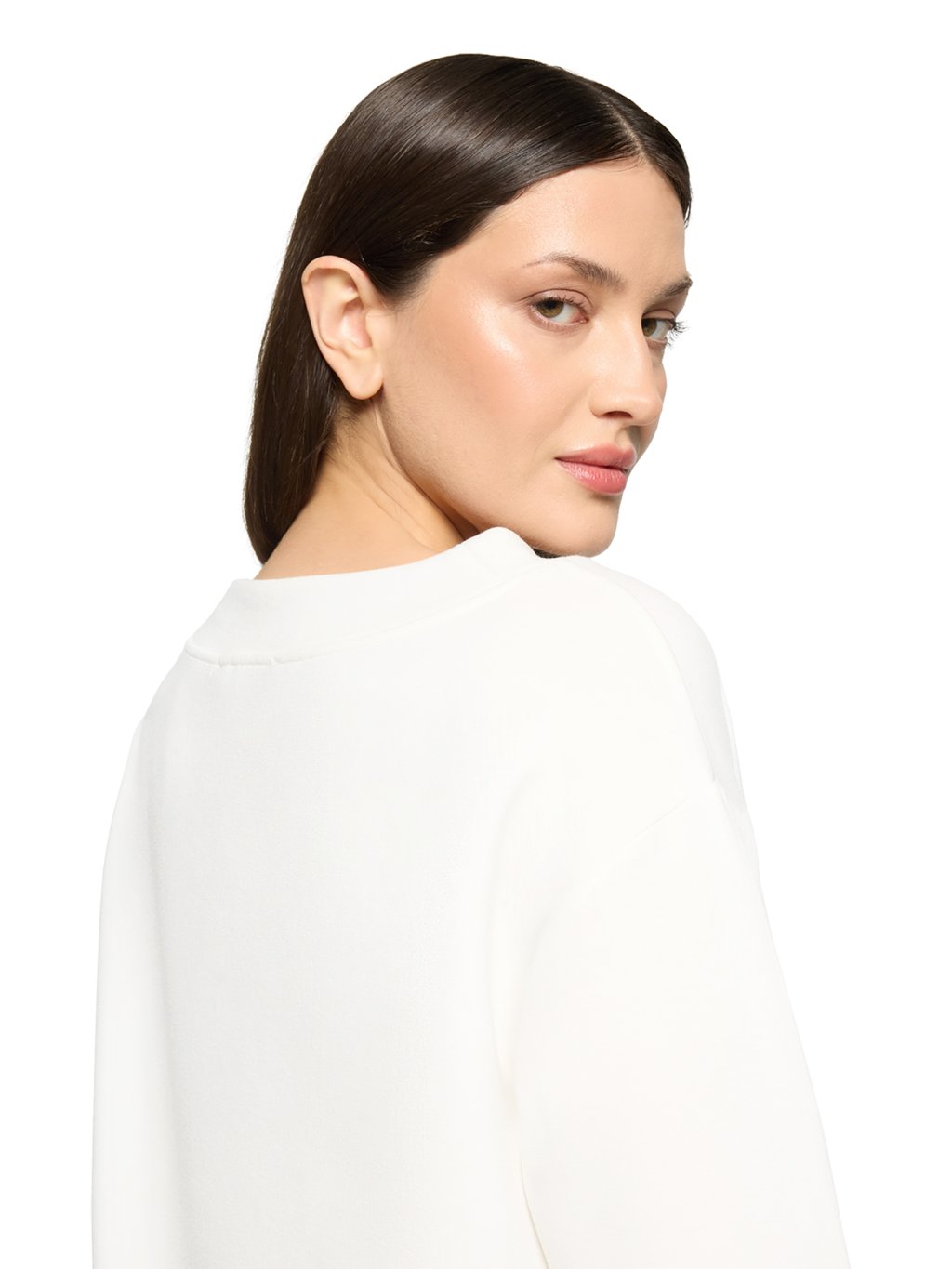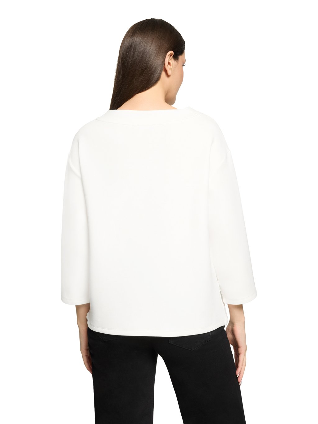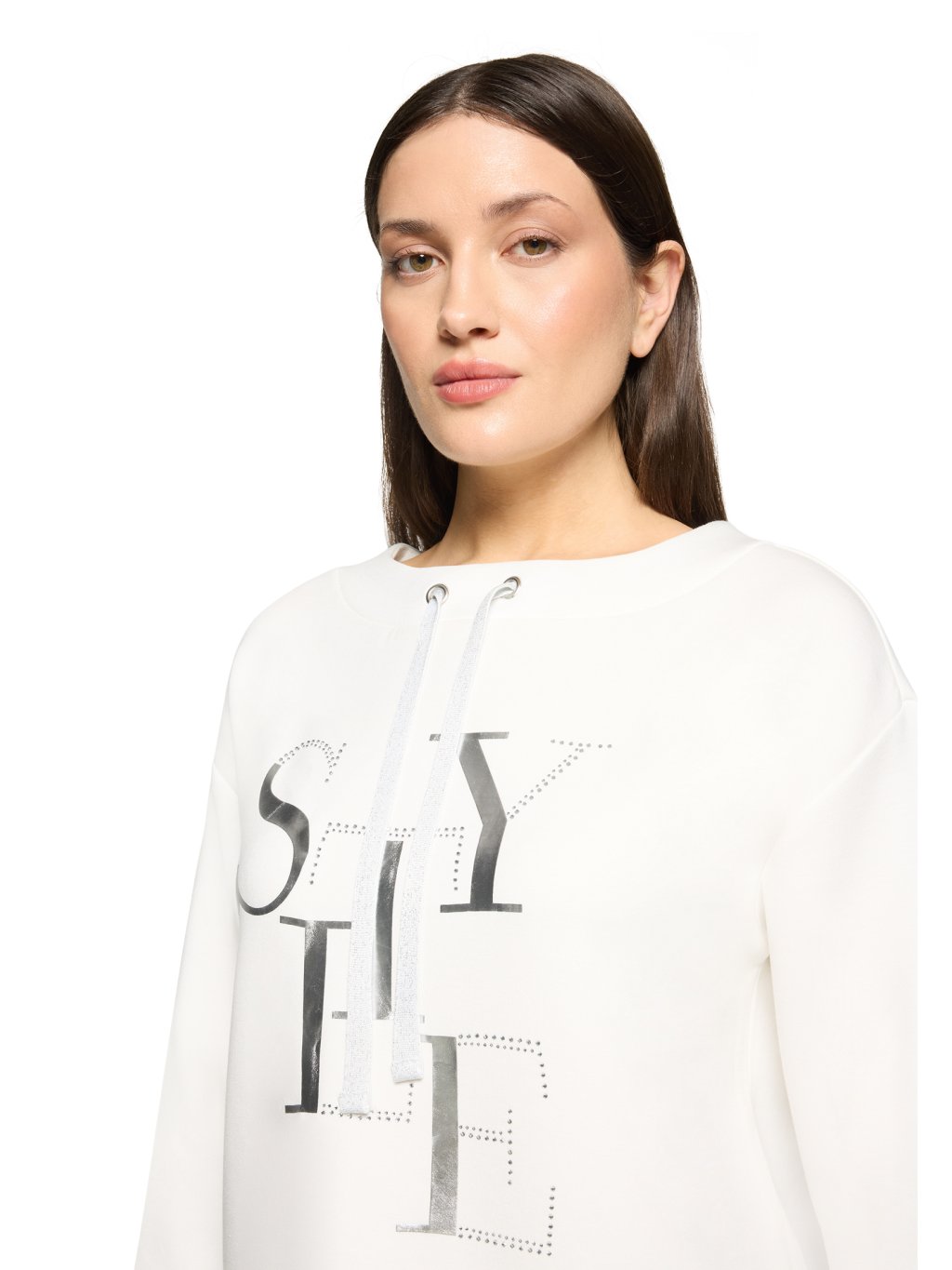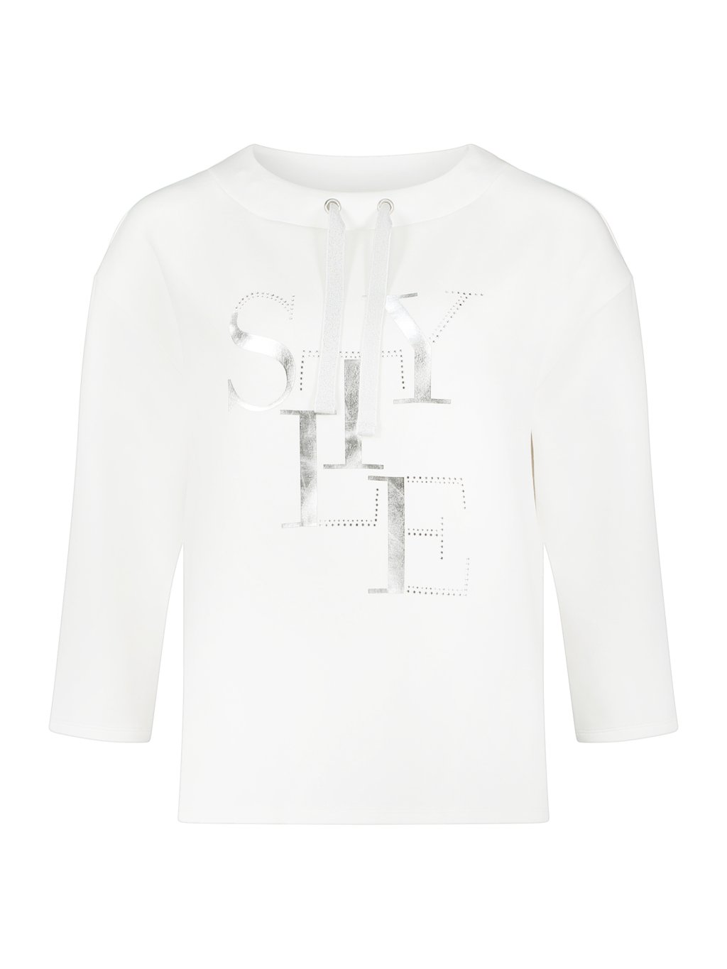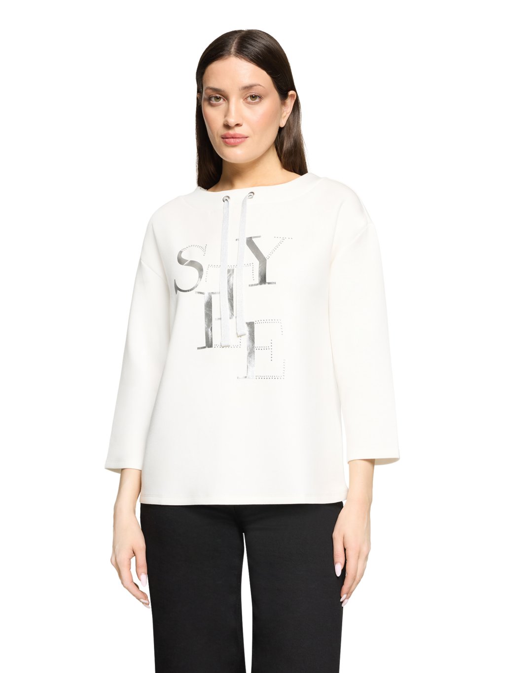 Betty Barclay mikina s moderním potiskem Elegantní mikina Betty Barclay v jemném smetanovém odstínu zaujme minimalistickým potiskem s metalickým efektem. Ležérní střih s tříčtvrtečním rukávem a dekorativní šňůrkou u krku působí moderně a zároveň velmi žensky. Model od Betty Barclay je ideální pro každodenní nošení – snadno jej zkombinujete s kalhotami i sukní pro pohodlný, ale upravený outfit.Doplňkové parametry