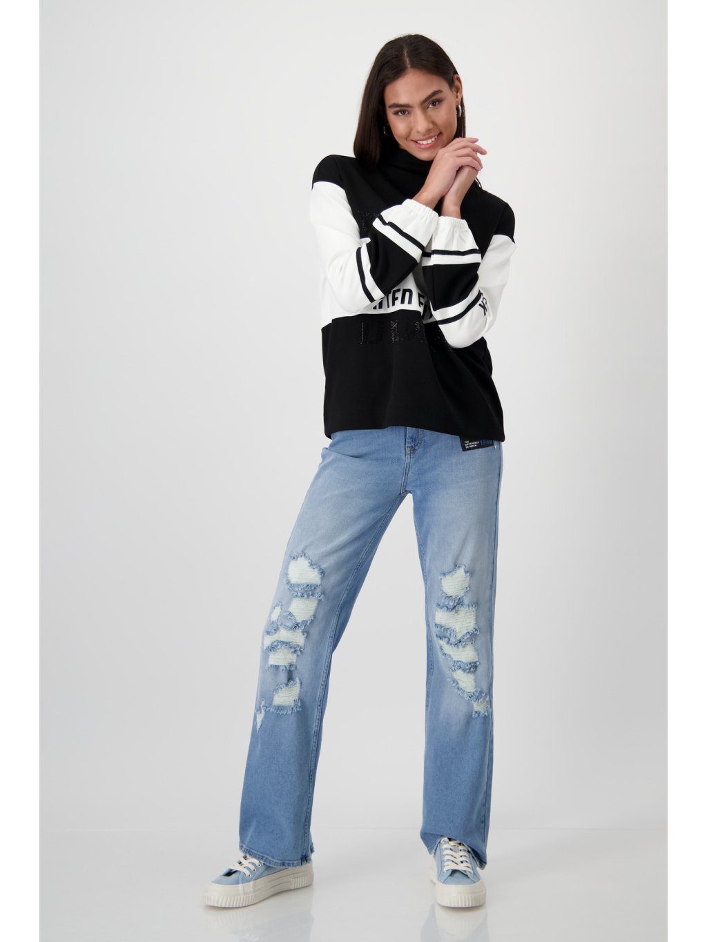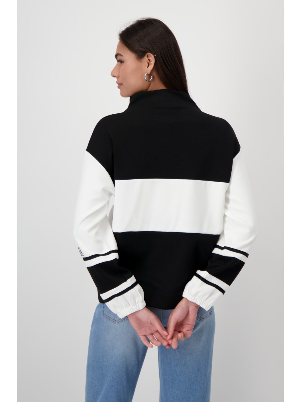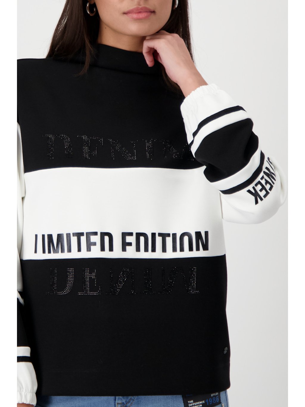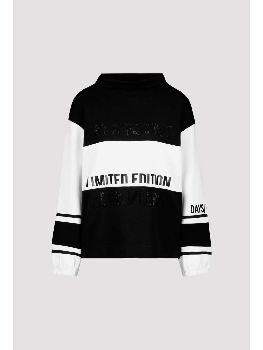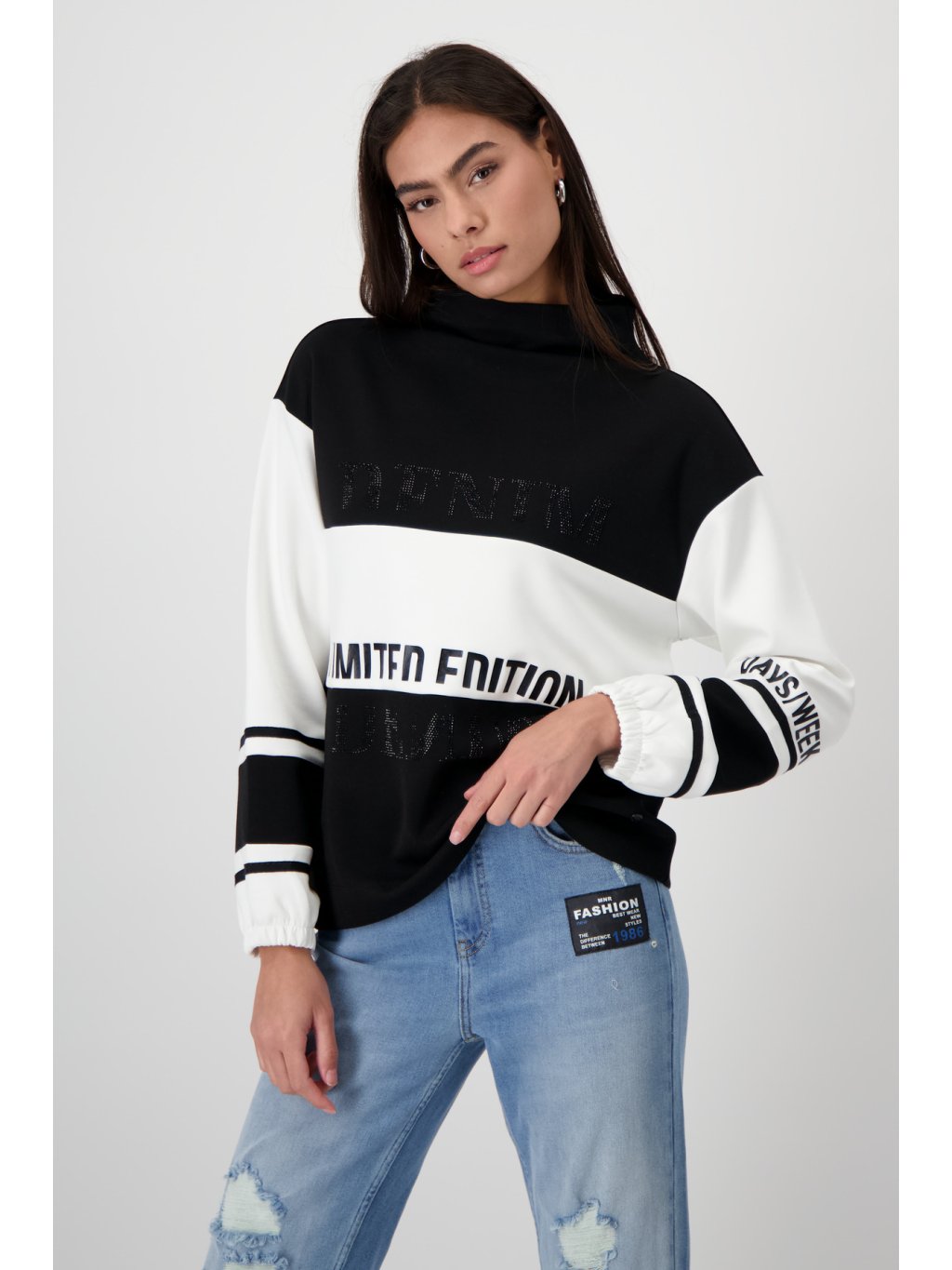 Černobílá mikina se stojáčkem má na rukávech decentní potisk. Přední díl je zdoben kamínky. Konce rukávů jsou staženy do manžety.