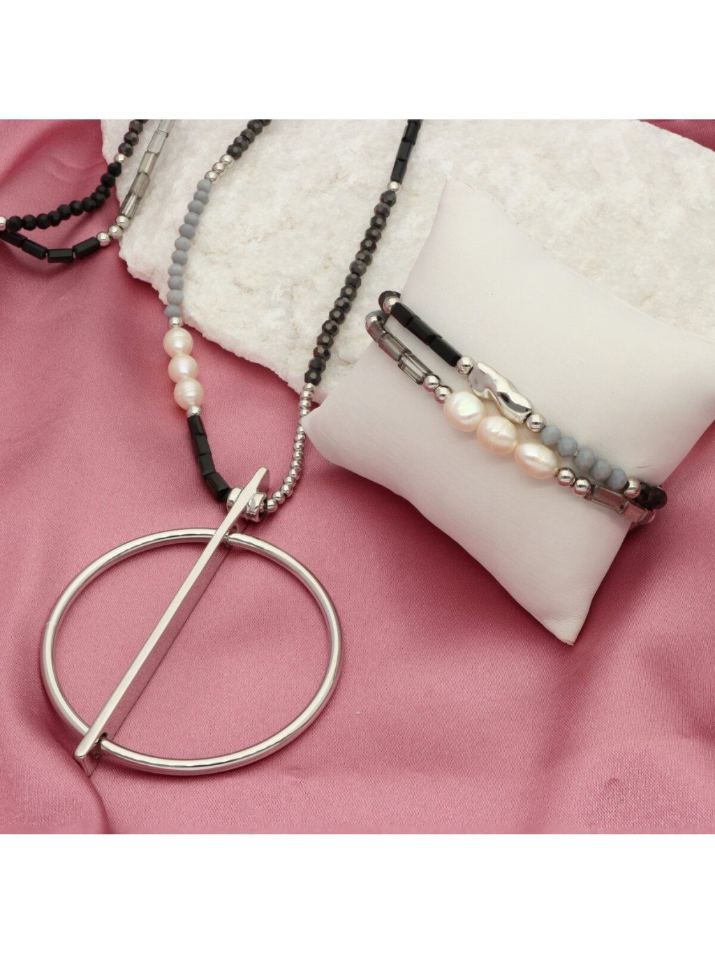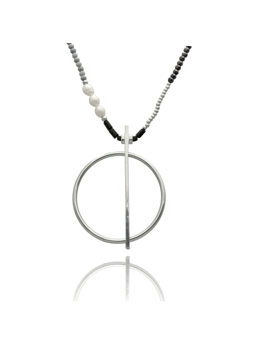 Dámský náhrdelník YVON je elegantní šperk z mosazi, zdobený fazetovaným sklem a jemnými perličkami. YVON vyniká sofistikovanou kombinací stříbrné, šedé a černé barvy, která působí nadčasově a stylově. YVON je ideální doplněk pro ženy, které hledají výraznou, ale zároveň elegantní ozdobu pro každou příležitost.Doplňkové parametry