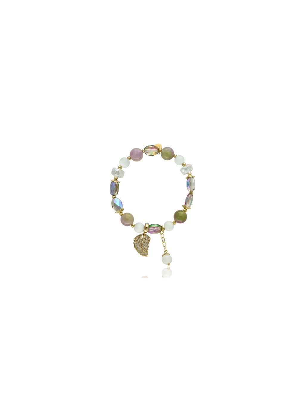 Elegantní dámský náramek YVON z kolekce Lovely Stones je stylovým doplňkem, který zaujme svou jemností a harmonickou kombinací barev. Náramek YVON je tvořen dekorativními korálky v pastelových odstínech zelené, růžové a mléčně bílé barvy, které jsou doplněny lesklými broušenými kameny a drobnými kovovými prvky ve zlatém tónu. Celkový vzhled doplňuje elegantní přívěsek ve tvaru listu s jemným řetízkem a korálkem, který dodává šperku originální a ženský charakter. Dámský náramek YVON se skvěle hodí k elegantním i volnočasovým outfitům a díky svému jemnému designu podtrhne přirozenou ženskost a styl. Náramek YVON je ideální volbou pro každodenní nošení i slavnostní příležitosti a může být také krásným dárkem pro ženy, které milují originální a vkusné šperky.Doplňkové parametry