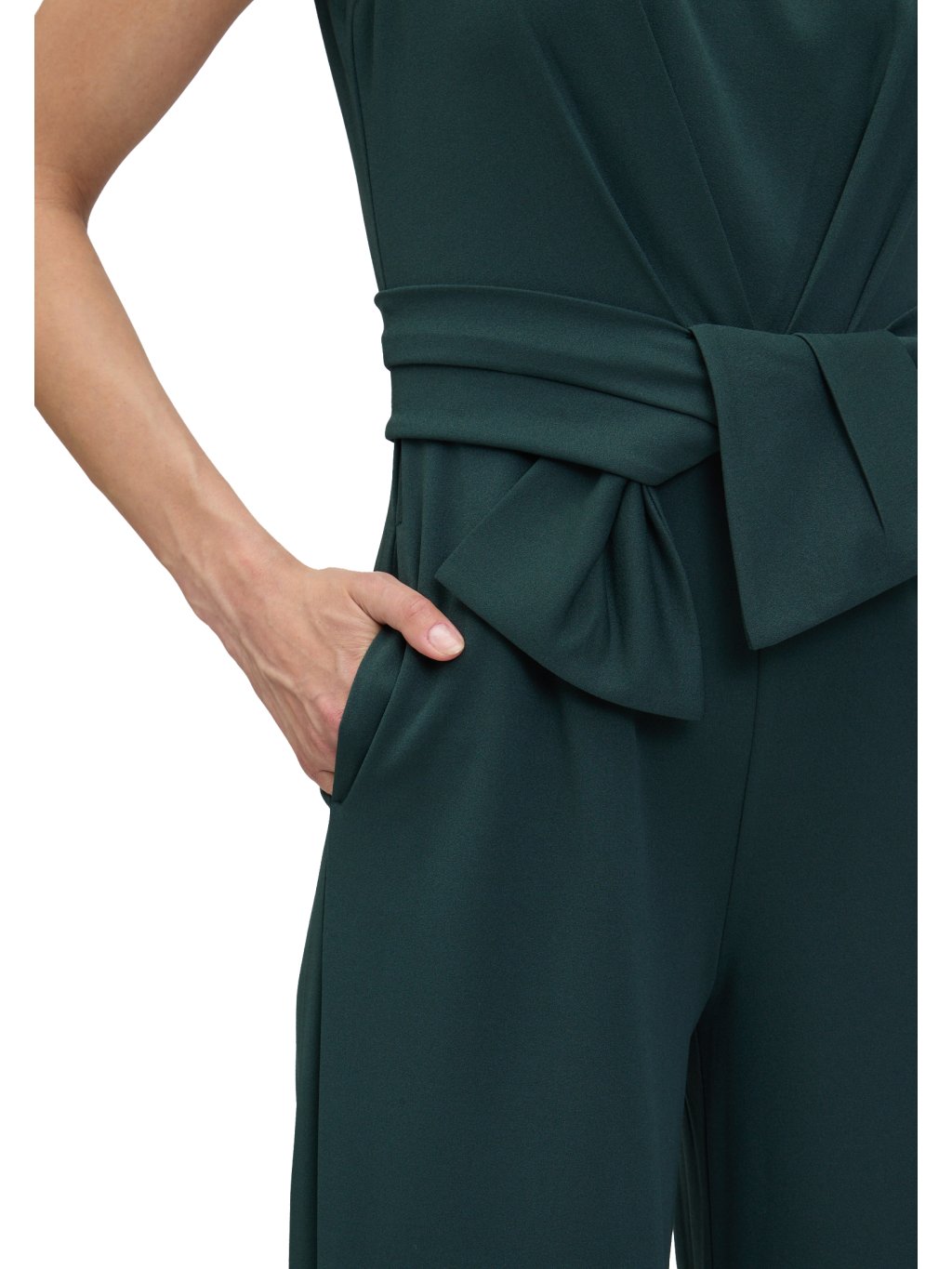 Elegantní, moderní a dokonale ženský. Tento overal v jemném šalvějovém odstínu je ideální volbou pro slavnostní příležitosti, kde chcete působit sofistikovaně a zároveň svěže. Horní díl s lichotivým výstřihem do V opticky prodlužuje krk a zvýrazňuje dekolt s noblesou. Jemné řasení v oblasti pasu krásně modeluje siluetu a vázačka vytváří efekt zvýrazněného pasu. Široké, splývavé nohavice dodávají modelu lehkost a prodlužují postavu.