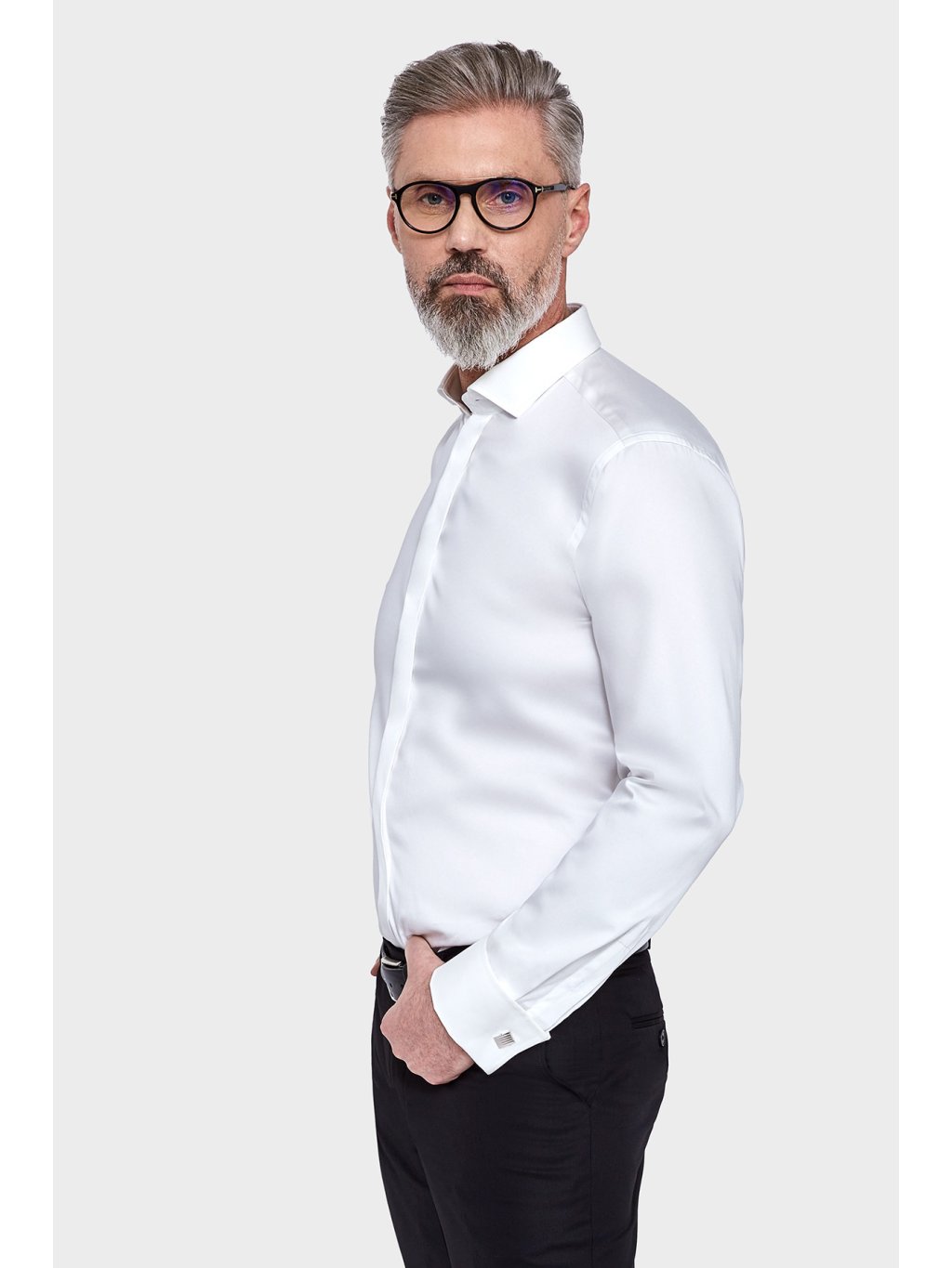 Bílá pánská košile s dlouhým rukávem.