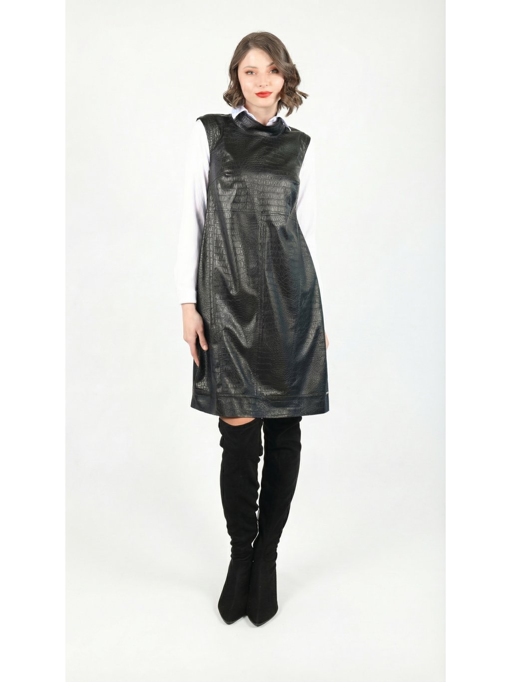 Stylové dámské šaty v černé barvě s efektem koženého vzhledu zaujmou moderním a sebevědomým stylem. Mají stojáček, bezrukávový střih a zapínání vzadu na zip, které podtrhuje jejich minimalistický design. Díky propracovanému střihu skvěle sedí a vytvářejí elegantní siluetu. Ideální volba pro večerní příležitosti i módní denní outfit.
