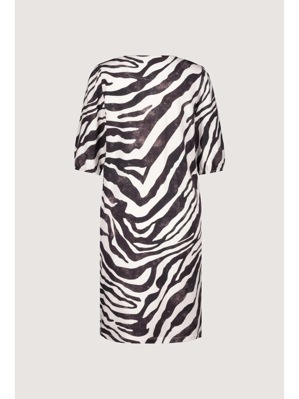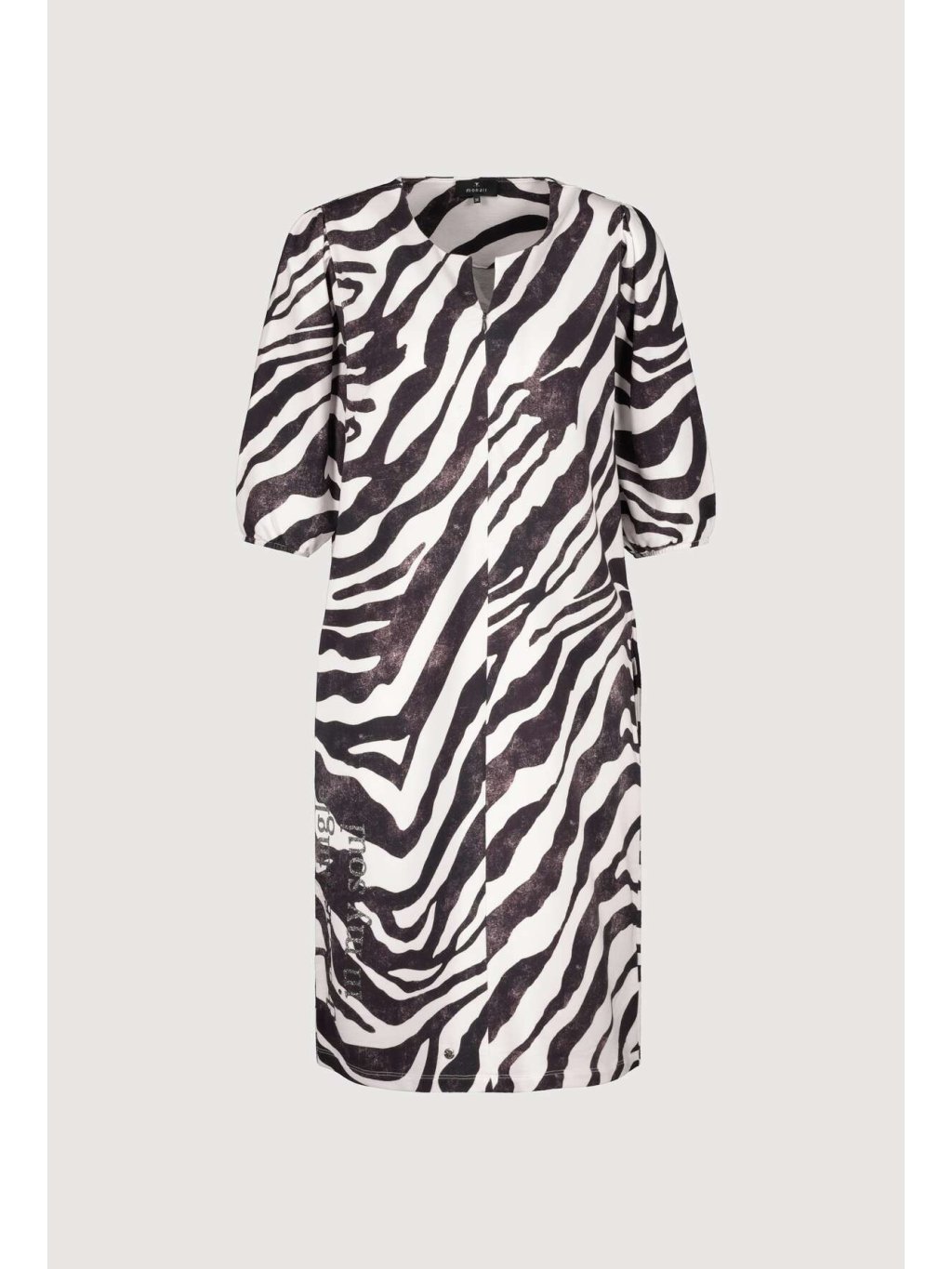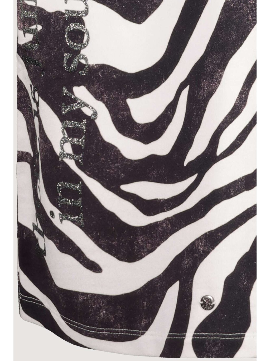 Elegantní šaty rovného střihu s polovičními rukávy ve stylovém, černobílém, zebřím designu. Midi šaty s kulatým výstřihem, rozparkem a zipem. Šaty jsou zdobeny třpytivým písmem.Doplňkové parametry