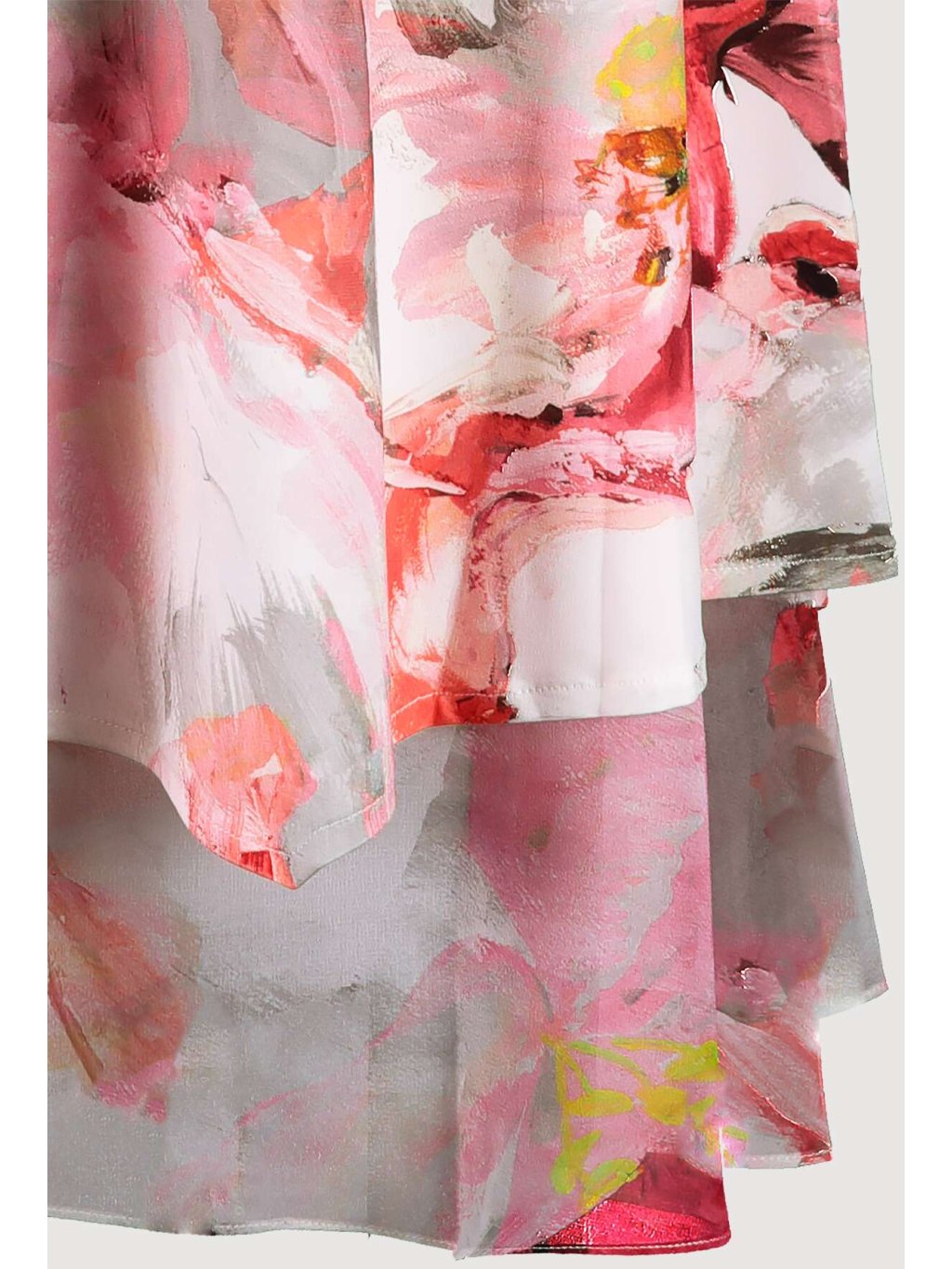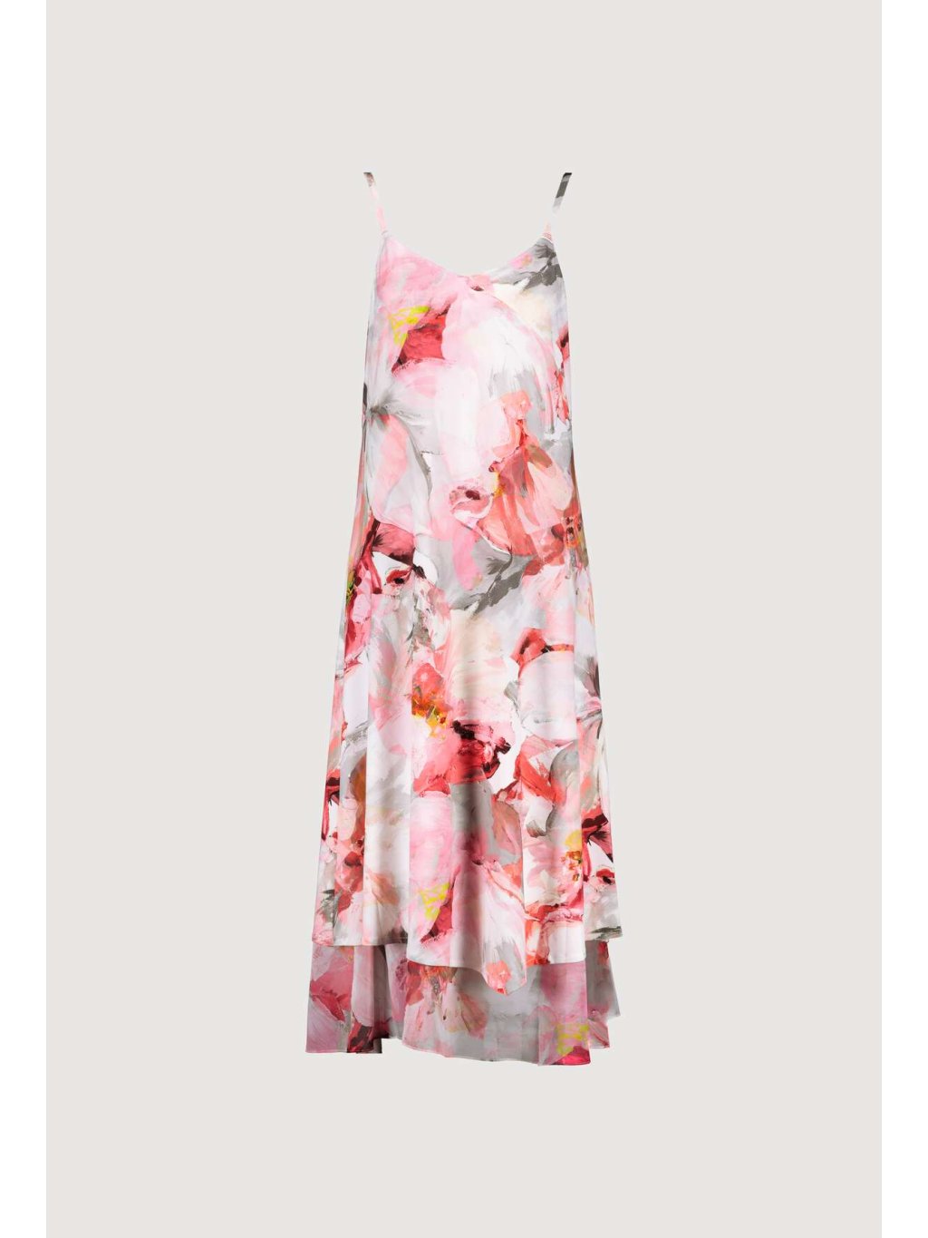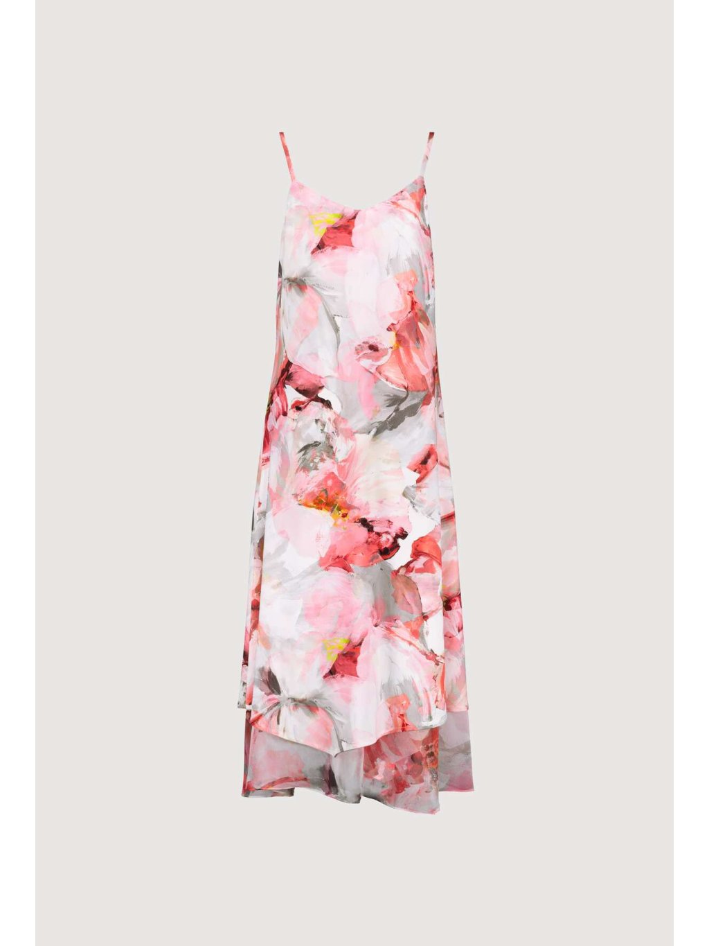 Šaty s celoplošným, květinovým potiskem. Jsou ze strečového materiálu, mají úzká ramínka a výstřih do písmene V. Díky materiálu jsou vhodné pro horké letní dny.