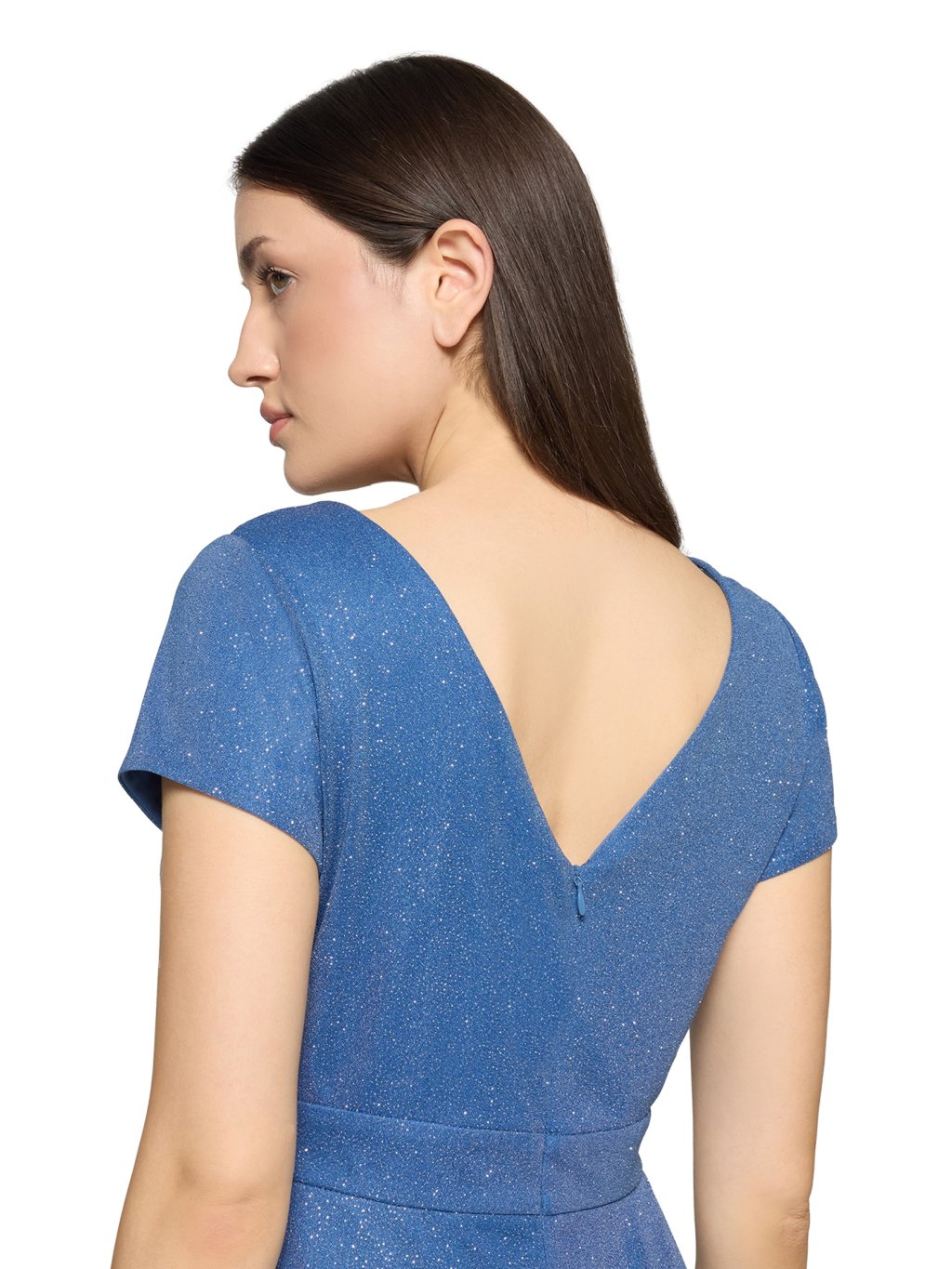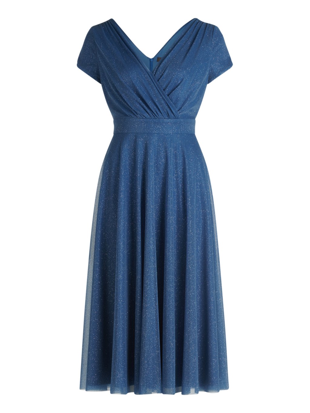 Modré šaty s jemným třpytem působí klidně, žensky a velmi sofistikovaně. Barva evokuje hloubku, jistotu a eleganci, zatímco decentní lesk dodává slavnostní nádech bez přehnané okázalosti. Zavinovací výstřih krásně tvaruje dekolt a opticky prodlužuje horní část postavy. Vypasovaný pas zvýrazňuje siluetu a splývavá sukně se při chůzi jemně vlní, čímž vytváří lehký a elegantní pohyb. Krátké rukávky zajišťují pohodlí i pocit jistoty během celého dne. Model, který se přizpůsobí ženě – ne naopak.Doplňkové parametry