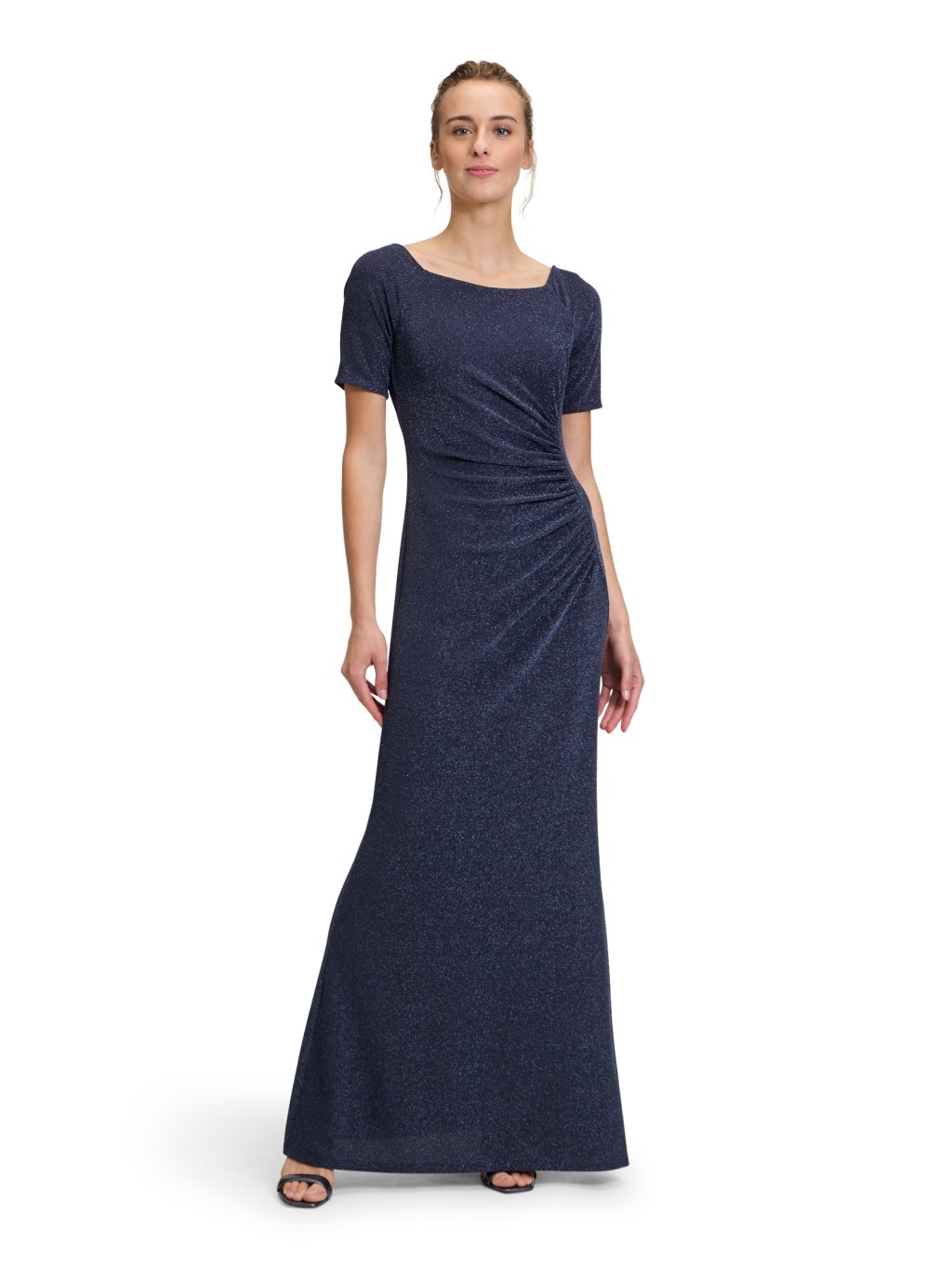 Tyto dlouhé šaty jsou ztělesněním ženské elegance a sofistikovanosti. Jemně třpytivý materiál působí luxusně, aniž by byl okázalý, a krásně odráží světlo při každém pohybu. Promyšlené řasení v oblasti pasu opticky tvaruje siluetu, zvýrazňuje ženské křivky a zároveň lichotí postavě. Krátký rukáv a čistý, nadčasový střih dělají z těchto šatů ideální volbu pro společenské události, večerní oslavy, plesy i slavnostní večeře. Jsou elegantní, pohodlné a dodají vám pocit sebejistoty po celý večer. Stačí doplnit decentními šperky a lodičkami – a dokonalý outfit je na světě.Doplňkové parametry