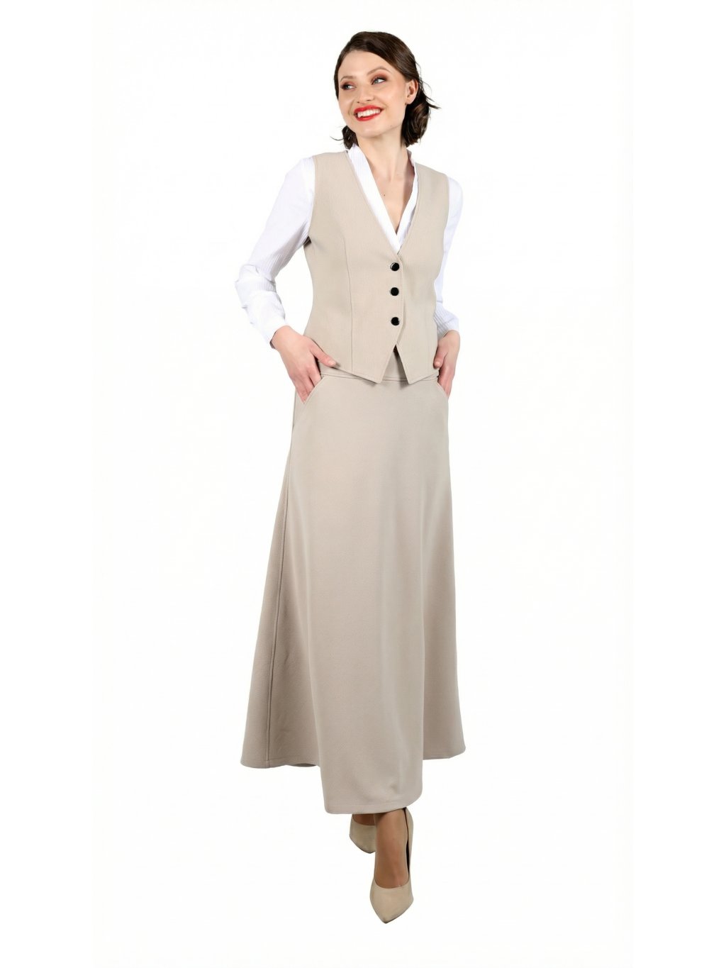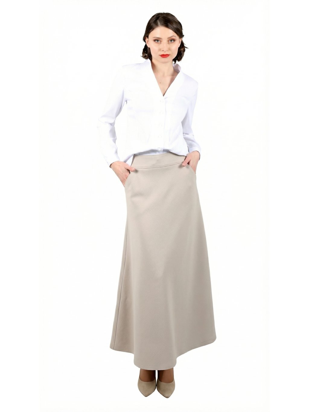 Stylová dámská sukně v prodloužené délce, která spojuje nadčasovou eleganci a komfort. V pase je opatřena širším páskem, který krásně tvaruje postavu, a v zadní části má praktické zapínání na zip. Díky klínovým kapsám je nejen módní, ale i funkční.