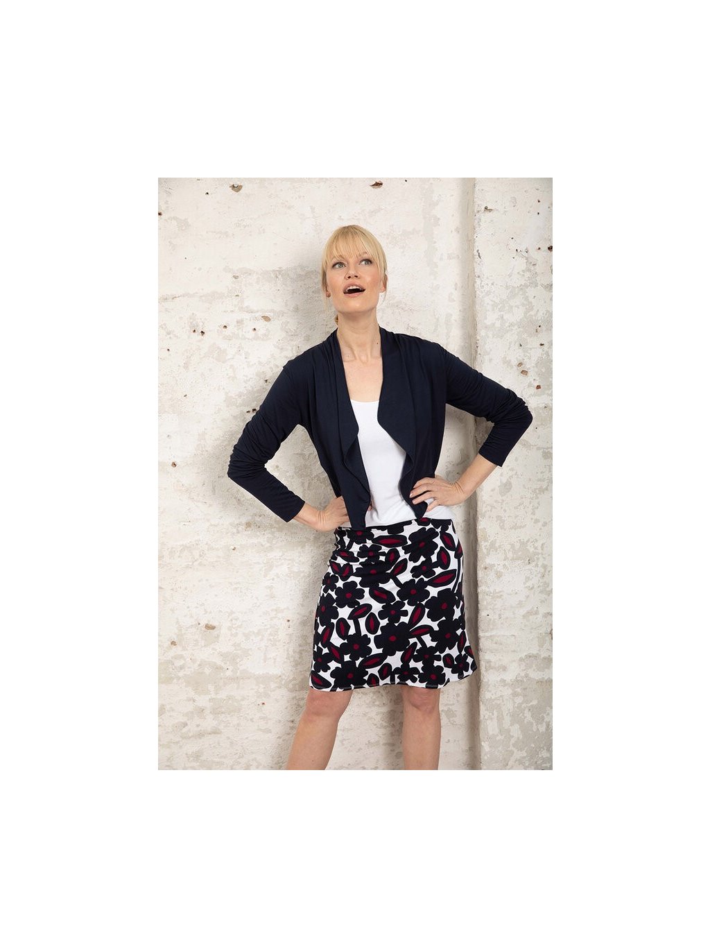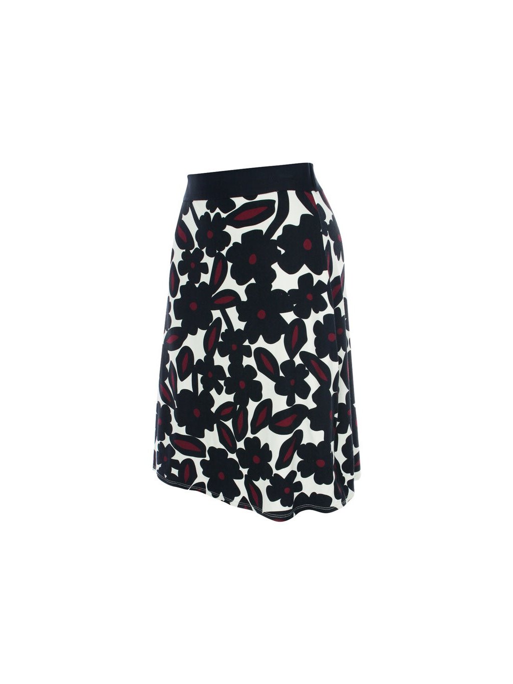 Letní, žerzejová sukně s celoplošným potiskem květin. Sukně má sportovní, elastický pas, a je v délce ke kolenům.