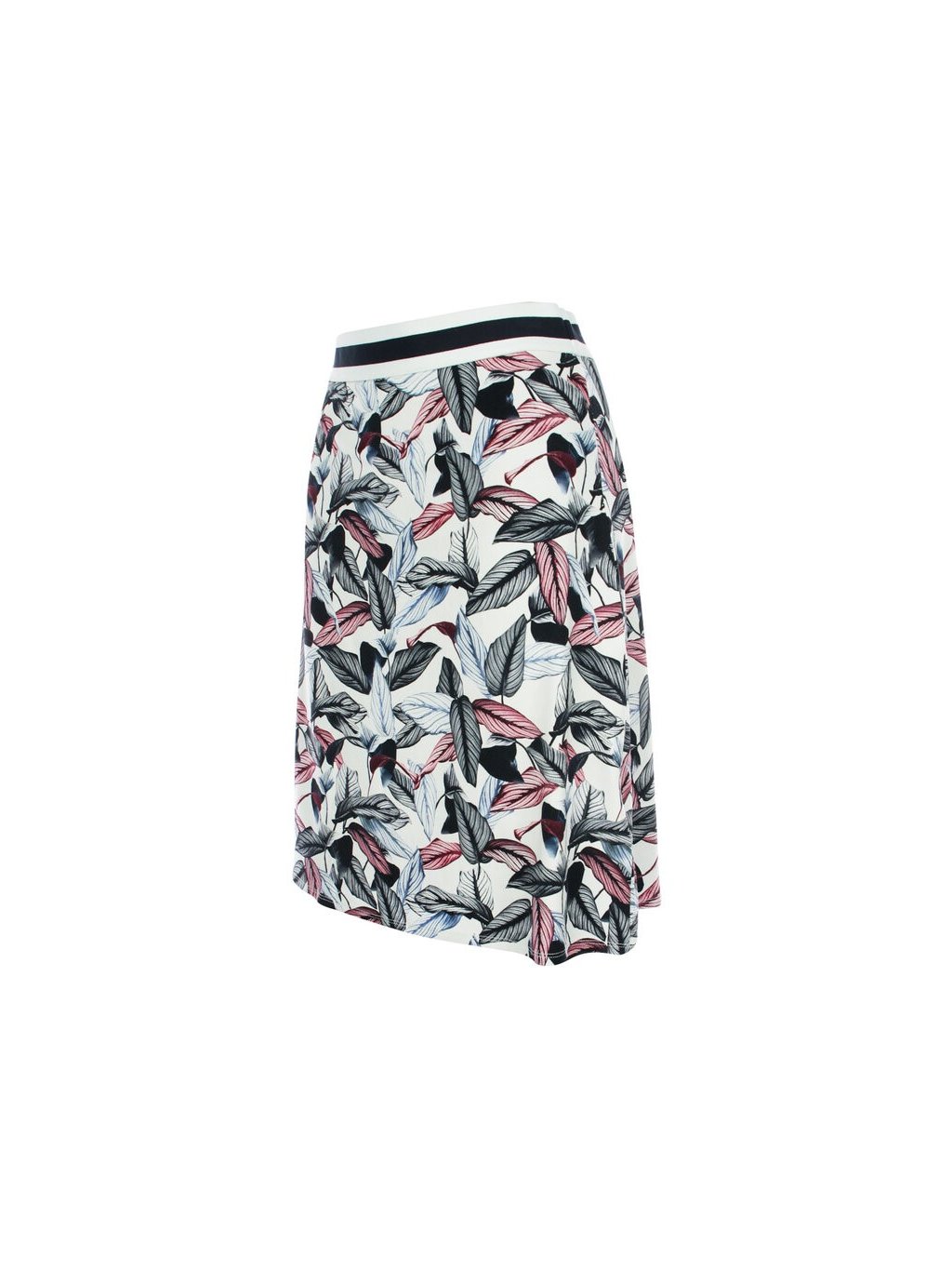 Letní, žerzejová sukně s celoplošným potiskem peří. Sukně má sportovní, elastický pas. Sukně je v délce ke kolenům.