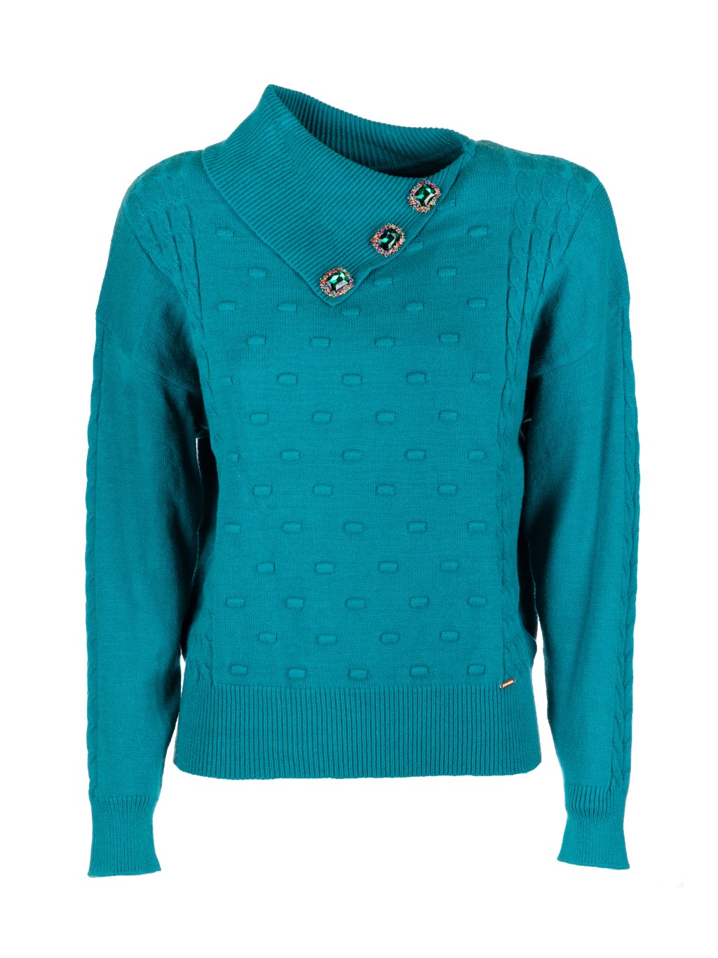 Pletený svetr se stojáčkem, který je ozdoben šperky. Na přední straně je pletené zdobení, rukávy a spodní část svetru je stažena do manžety.
