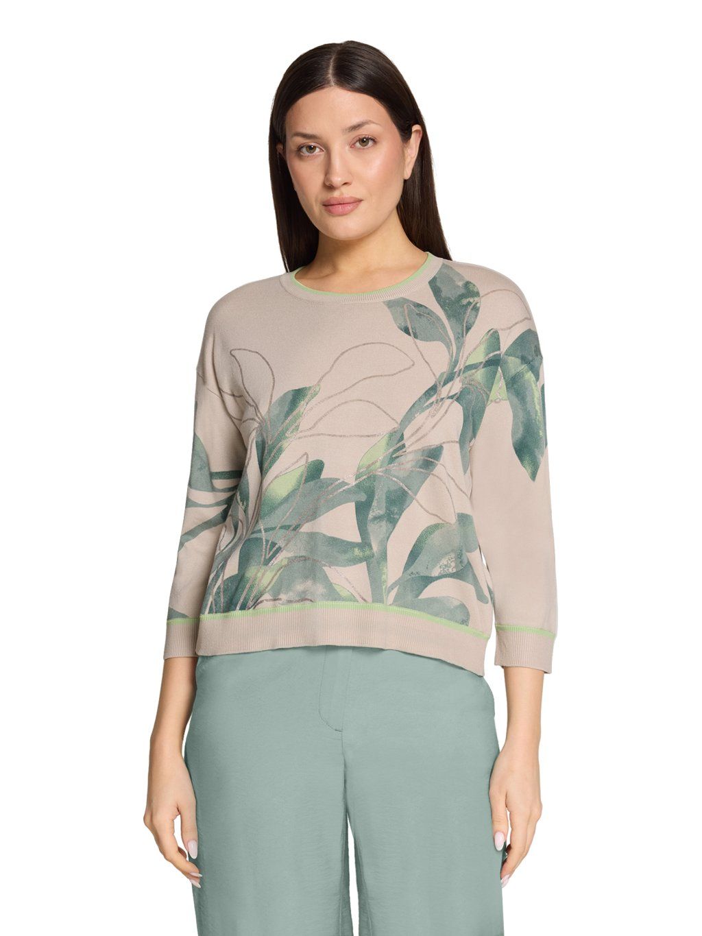Dámský svetr Betty Barclay v jemném béžovém odstínu zaujme moderním botanickým potiskem v zelených tónech, který působí svěže a elegantně. Tento svetr Betty Barclay má kulatý výstřih, dlouhý rukáv a příjemný měkký materiál, který zajistí pohodlí při každodenním nošení. Stylový model od značky Betty Barclay se skvěle kombinuje s kalhotami i džínami a vytvoří nadčasový outfit pro práci i volný čas.Doplňkové parametry