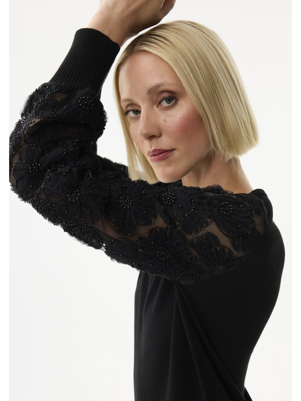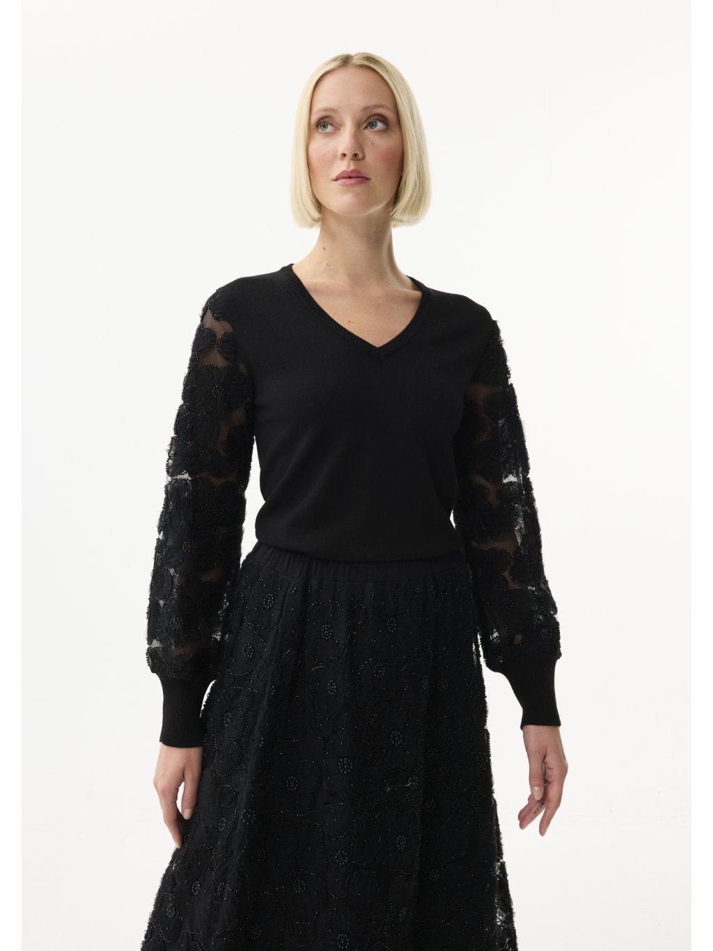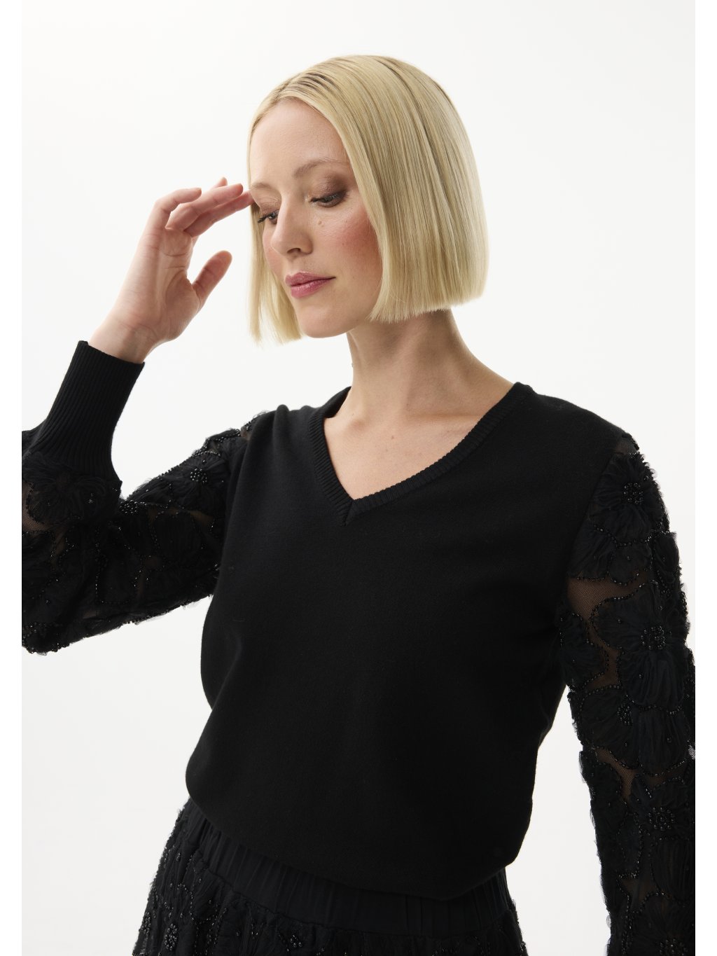 Dámský svetr s véčkovým výstřihem – stylový kousek, který zaujme zdobenými rukávy s korálky a perličkami v podobě květů. Originální design dodává outfitu eleganci i jedinečnost.Doplňkové parametry