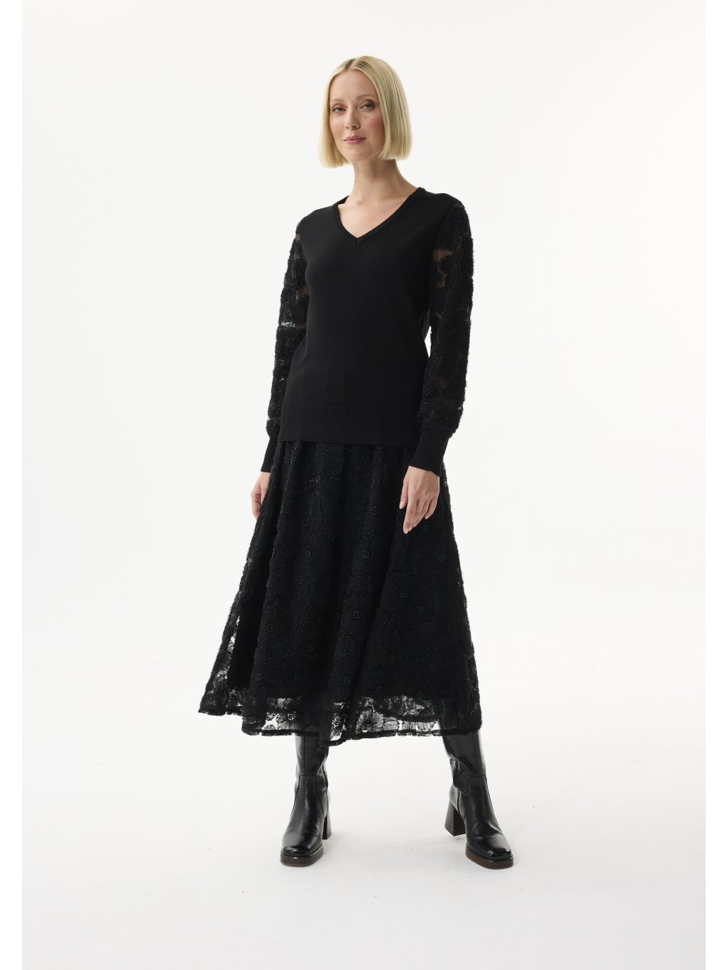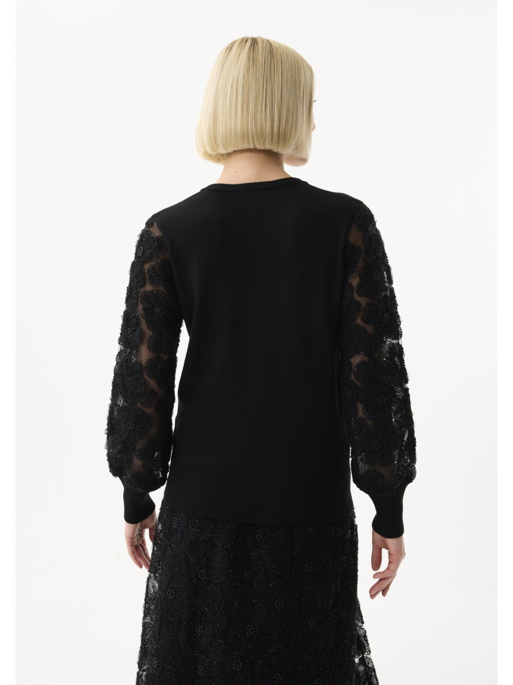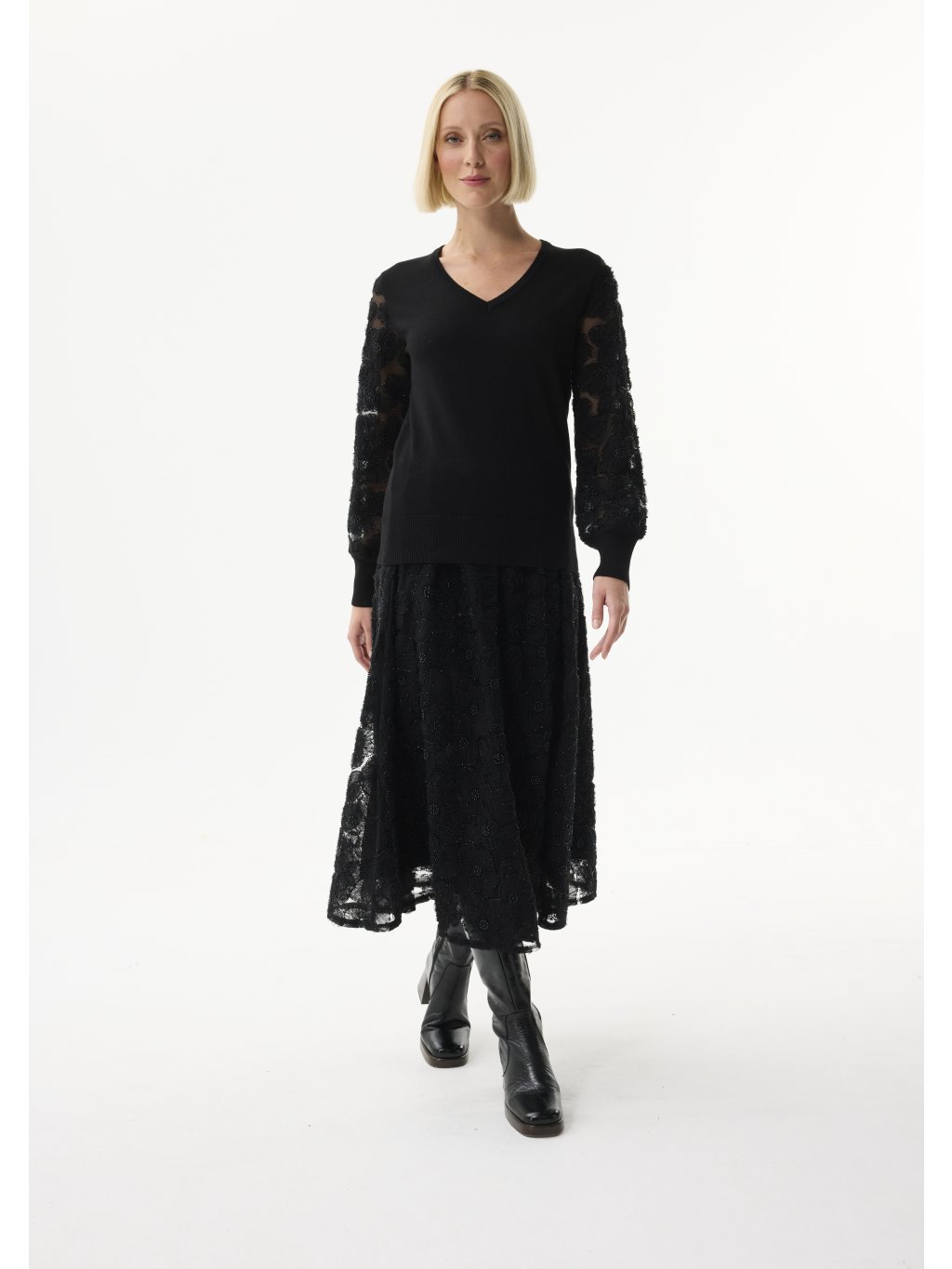 Dámský svetr s véčkovým výstřihem – stylový kousek, který zaujme zdobenými rukávy s korálky a perličkami v podobě květů. Originální design dodává outfitu eleganci i jedinečnost.Doplňkové parametry