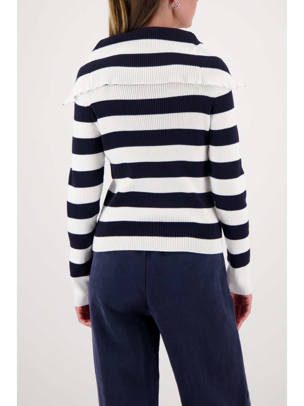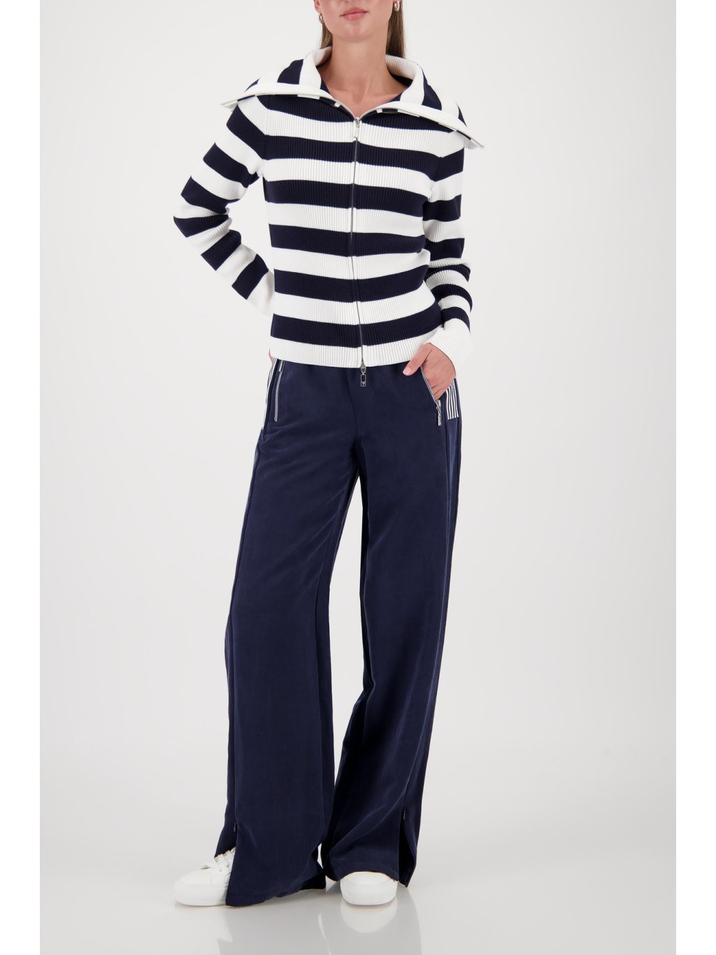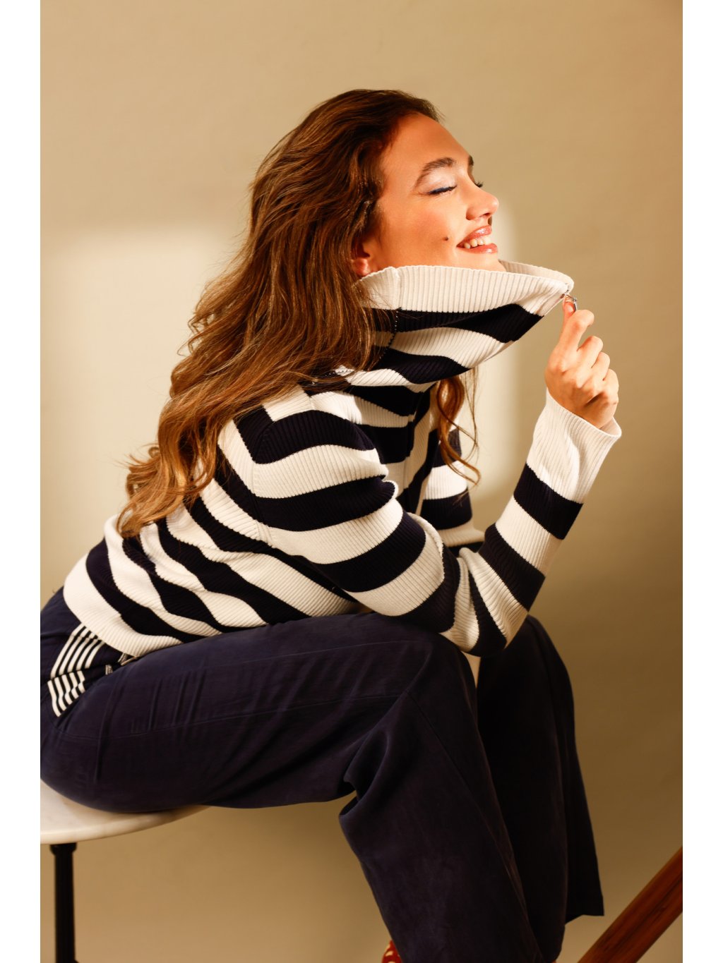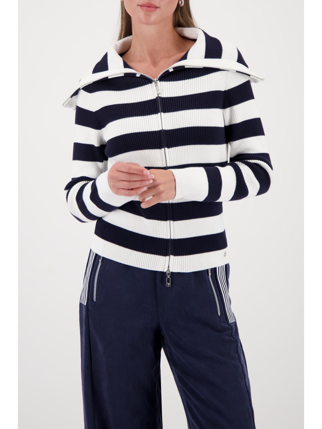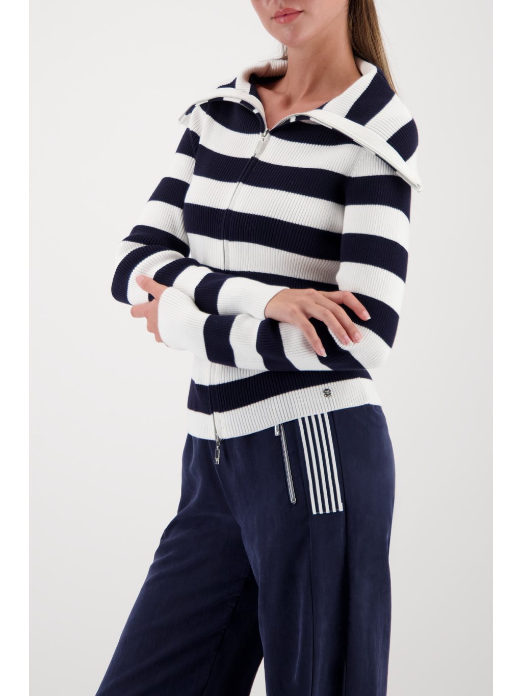 Pruhovaný svetr Monari v kombinaci smetanové a tmavě modré je elegantní klasikou s moderním nádechem. Jemně žebrovaný úplet krásně drží tvar, lichotí postavě a zároveň je příjemný na nošení po celý den. Zip po celé délce a výraznější límec dodávají svetru sportovně-elegantní charakter – můžeš ho nosit zapnutý jako top nebo rozepnutý přes tričko či šaty. Styl, který se přizpůsobí tobě i tempu dne. ? nadčasový pruhovaný design ? kvalitní úplet s jemnou strukturou ? variabilní nošení – do práce i na volný čas ? perfektní k džínům, bílým kalhotám i sukniDoplňkové parametry