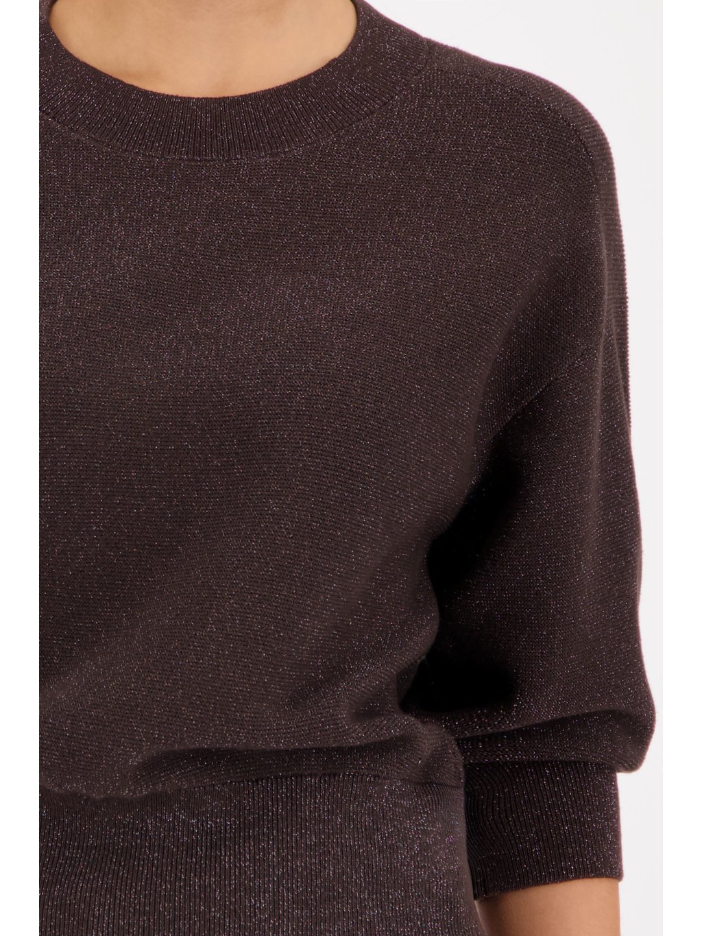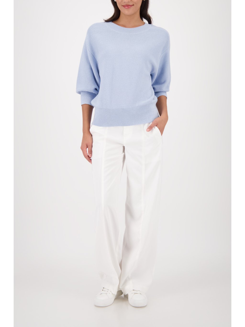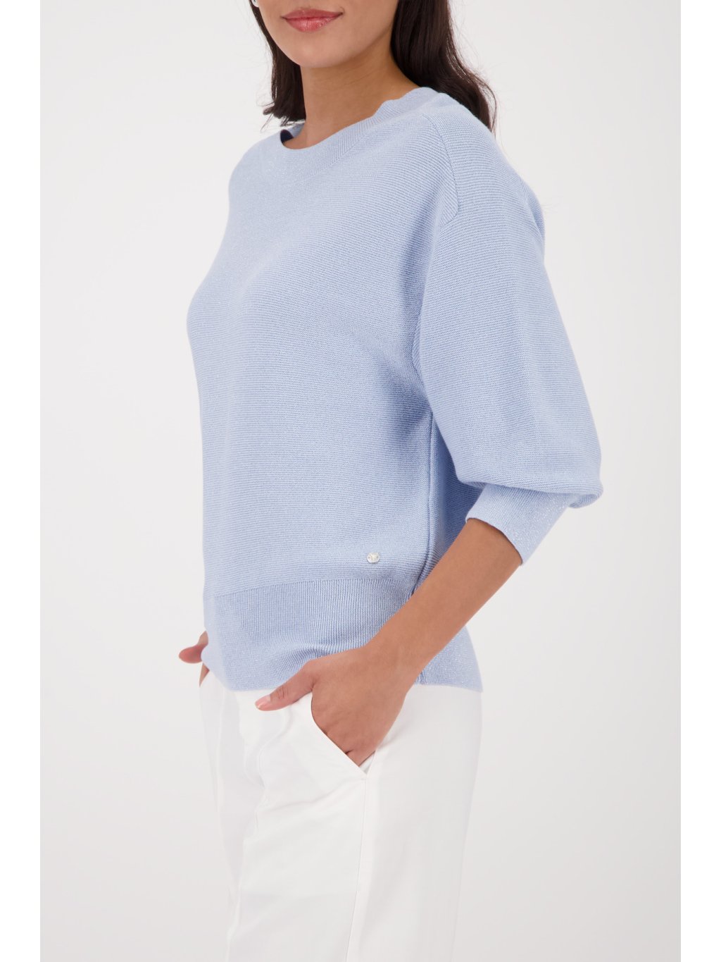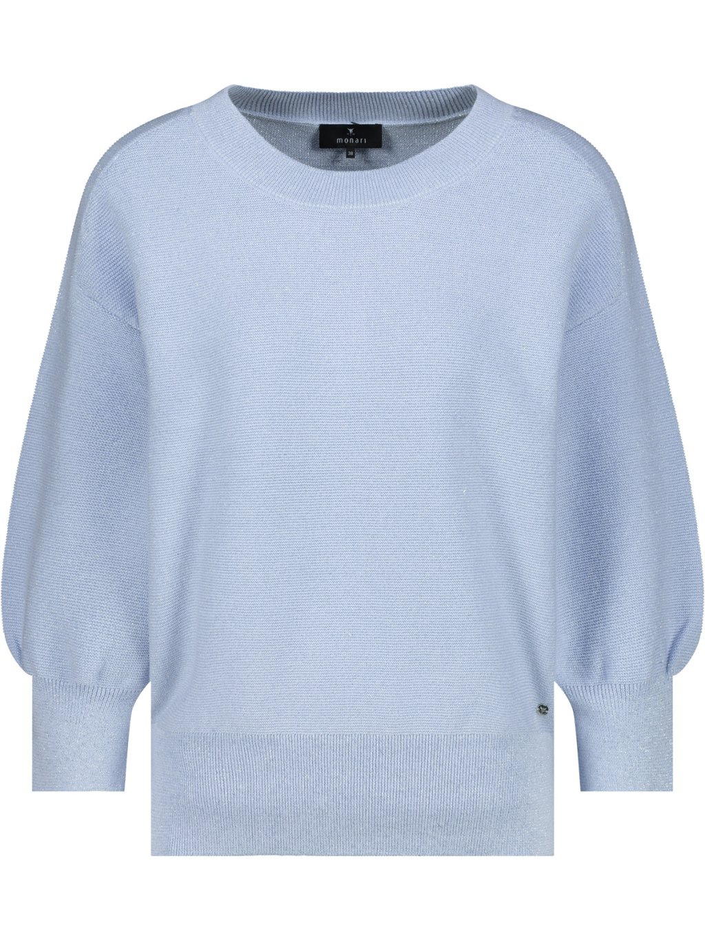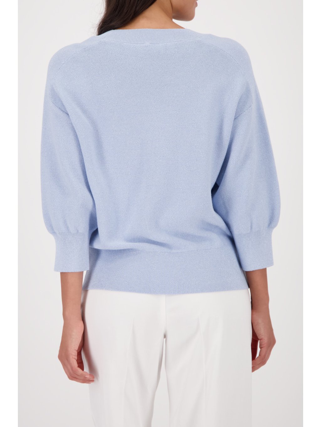 Elegantní dámský svetřík s kulatým límečkem a tříčtvrtečním spadlým rukávem působí velmi žensky a nadčasově. Límeček, rukávy i spodní lem jsou zakončeny jemnou manžetou a modrá barva se stříbrným lurexem dodává modelu decentní lesk. Skvěle se kombinuje s kalhotami i sukní a hodí se jak pro elegantní denní nošení, tak pro společenštější příležitosti.