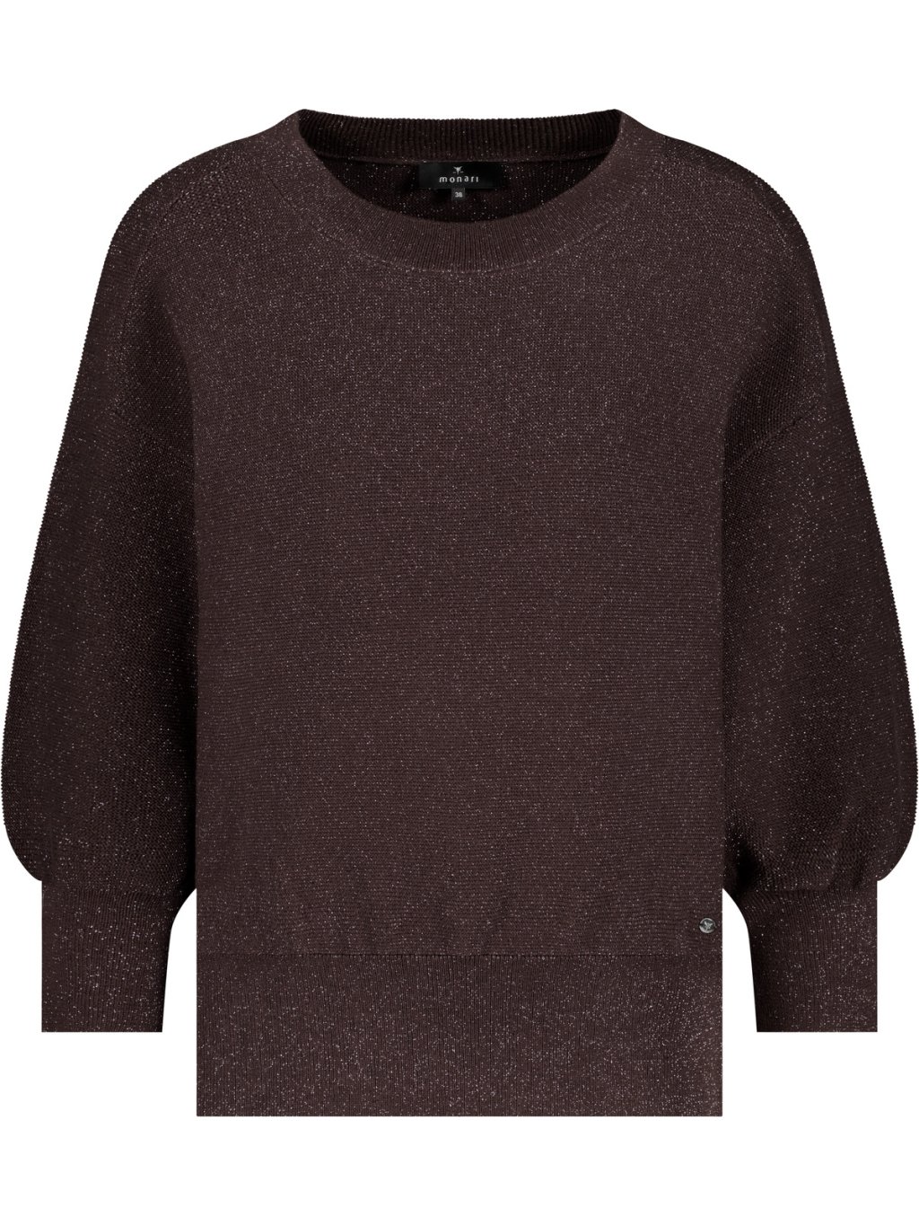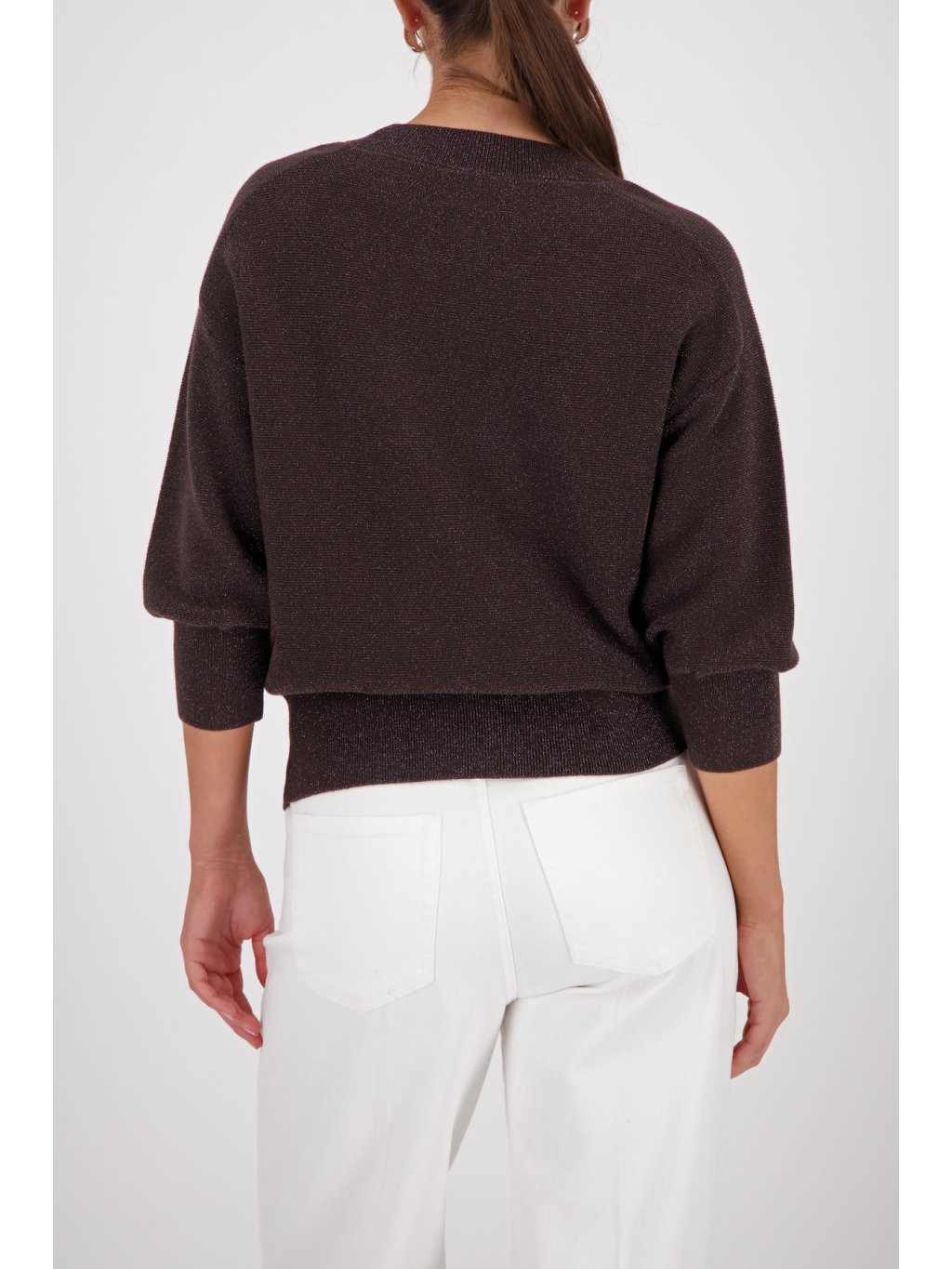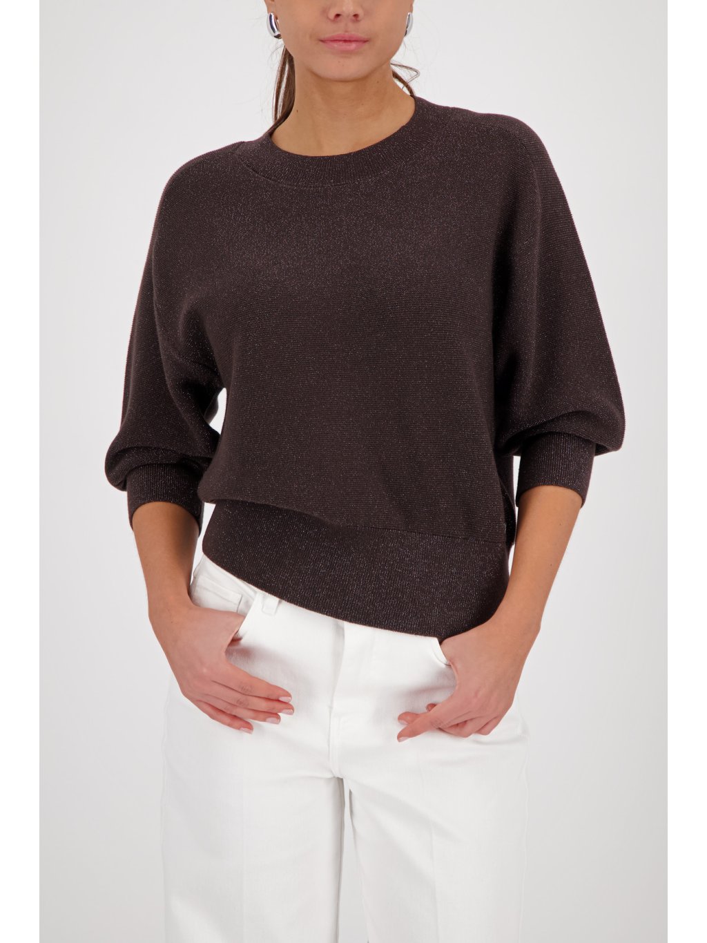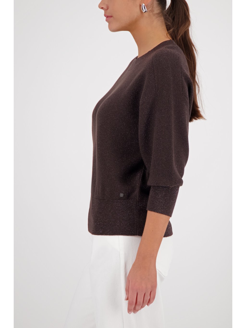 Elegantní dámský svetřík s kulatým límečkem a tříčtvrtečním spadlým rukávem působí velmi žensky a nadčasově. Límeček, rukávy i spodní lem jsou zakončeny jemnou manžetou a hnědá barva se stříbrným lurexem dodává modelu decentní lesk. Skvěle se kombinuje s kalhotami i sukní a hodí se jak pro elegantní denní nošení, tak pro společenštější příležitosti.