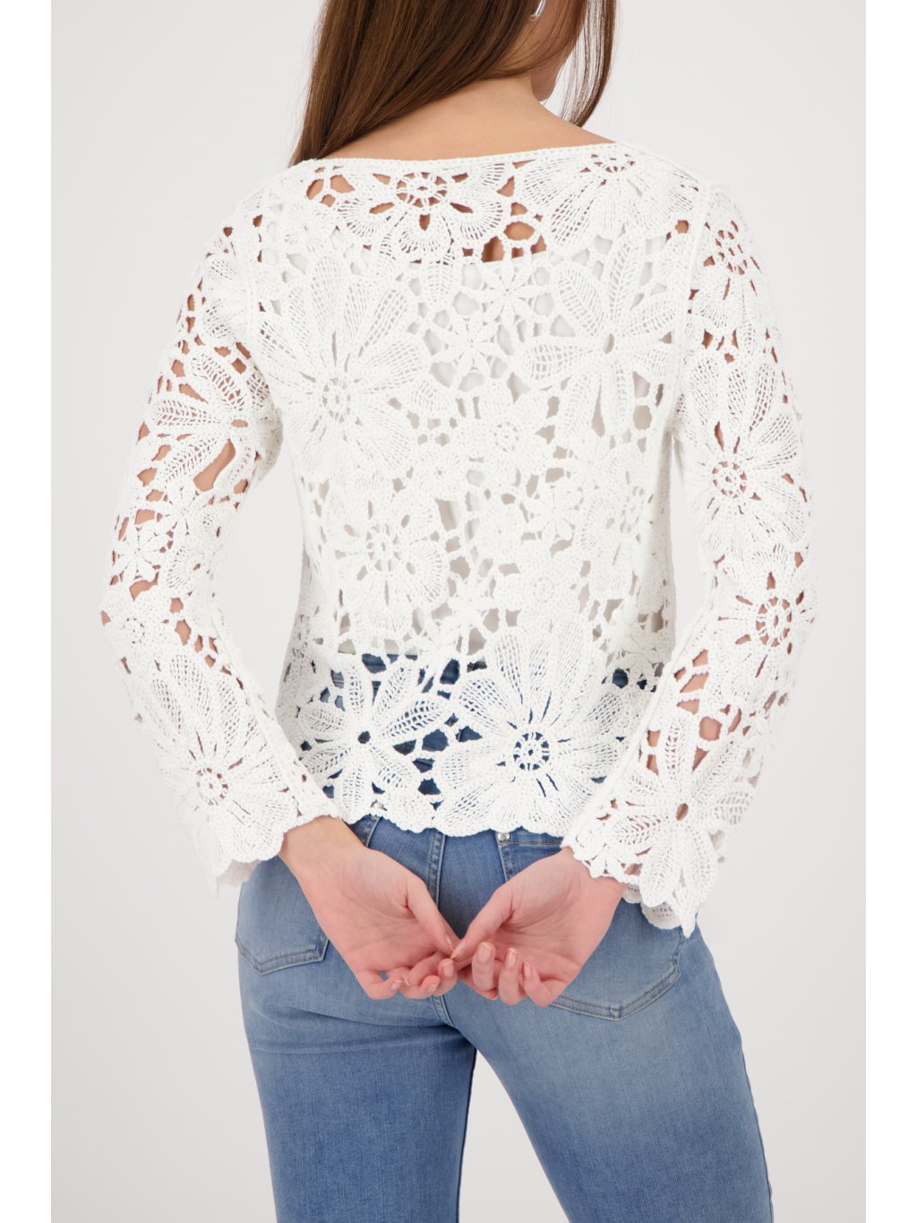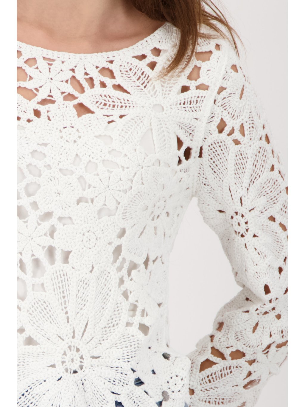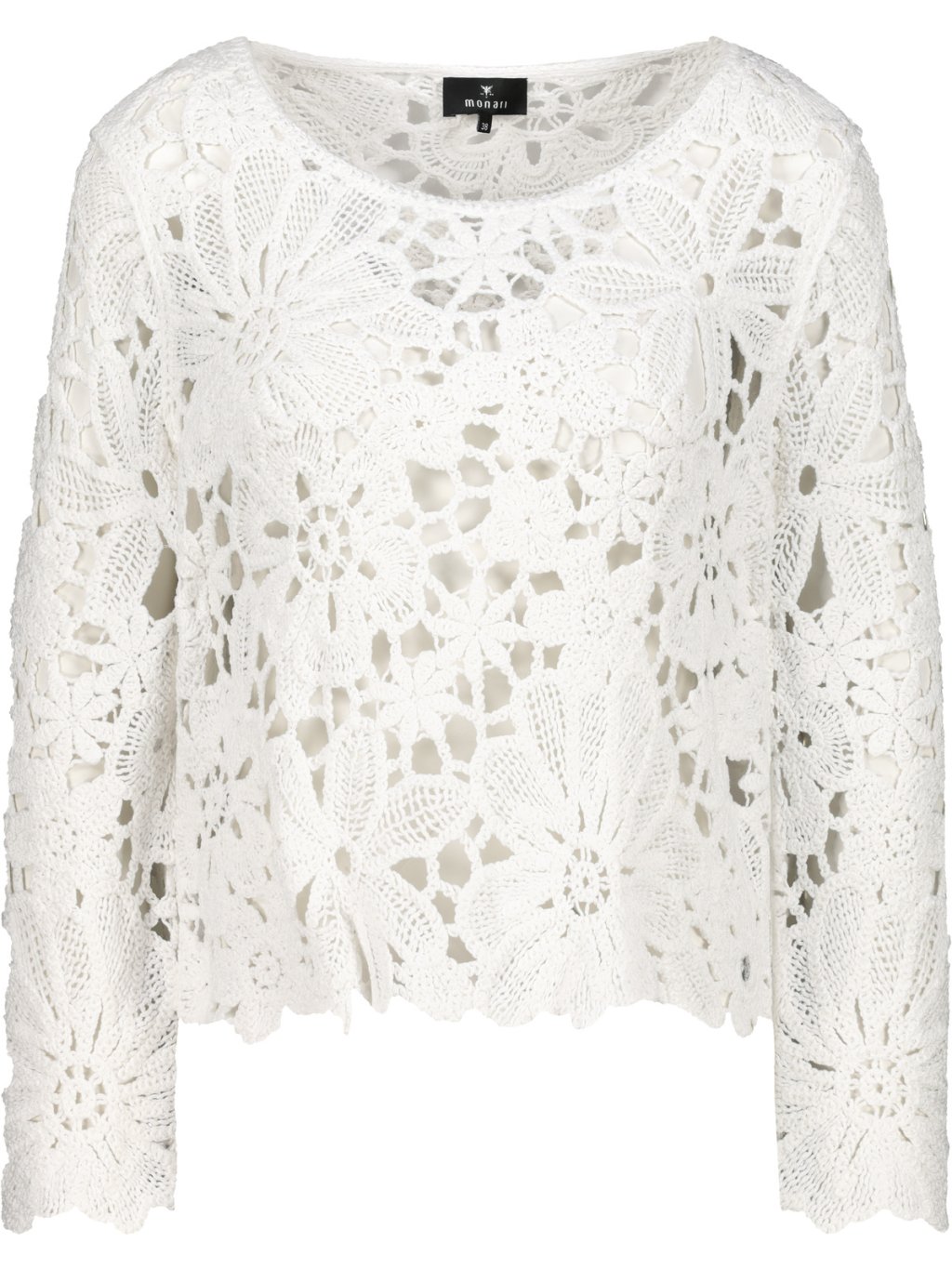 Dámský krajkový svetr Monari Elegantní dámský svetr Monari zaujme na první pohled svým jemným a velmi ženským designem. Svetr Monari je vyroben z výrazné krajkové struktury s květinovým motivem, která dodává modelu lehkost, vzdušnost a romantický vzhled. Model má kulatý výstřih a dlouhé rukávy, které jsou stejně jako celý svetr zdobené bohatým krajkovým vzorem. Díky propracovaným detailům působí svetr velmi elegantně a zároveň moderně. Spodní lem je zakončen jemným krajkovým okrajem, který podtrhuje jeho ženský styl. Svetr Monari se skvěle kombinuje s džínami, elegantními kalhotami i sukní a je ideální volbou pro ženy, které mají rády stylovou a originální módu německé značky Monari.Doplňkové parametry