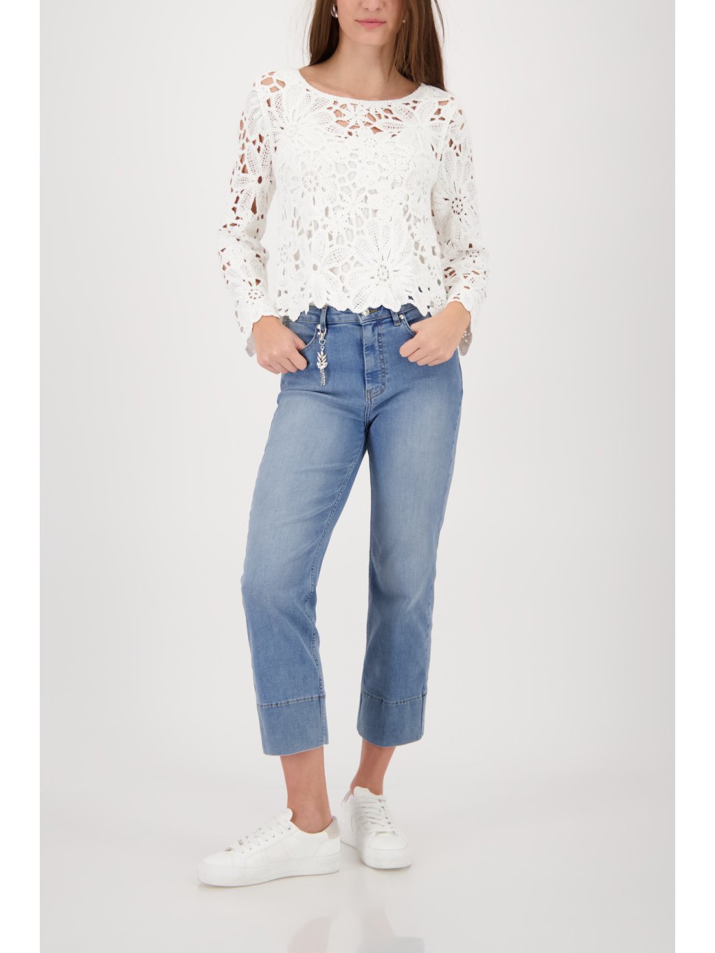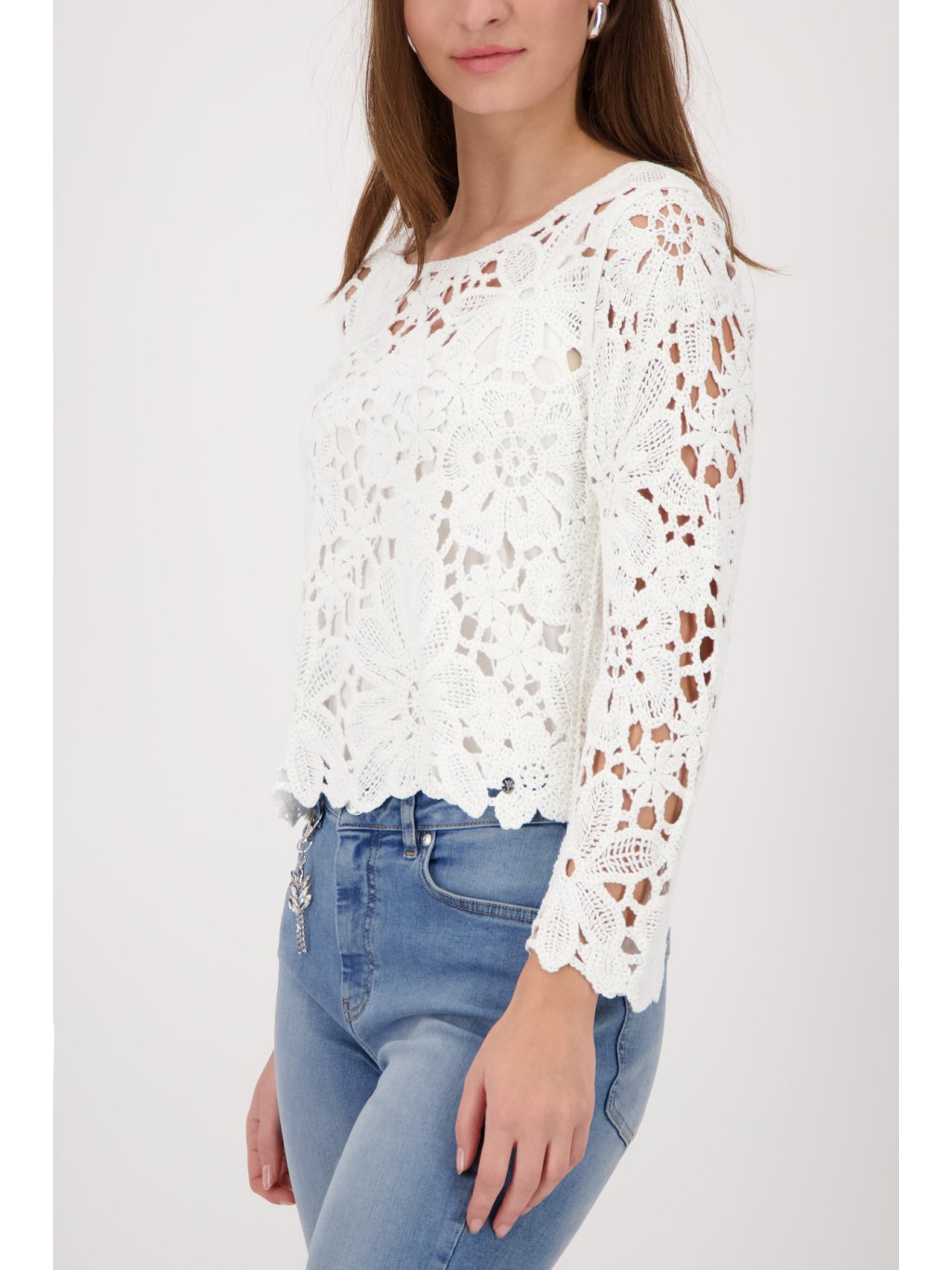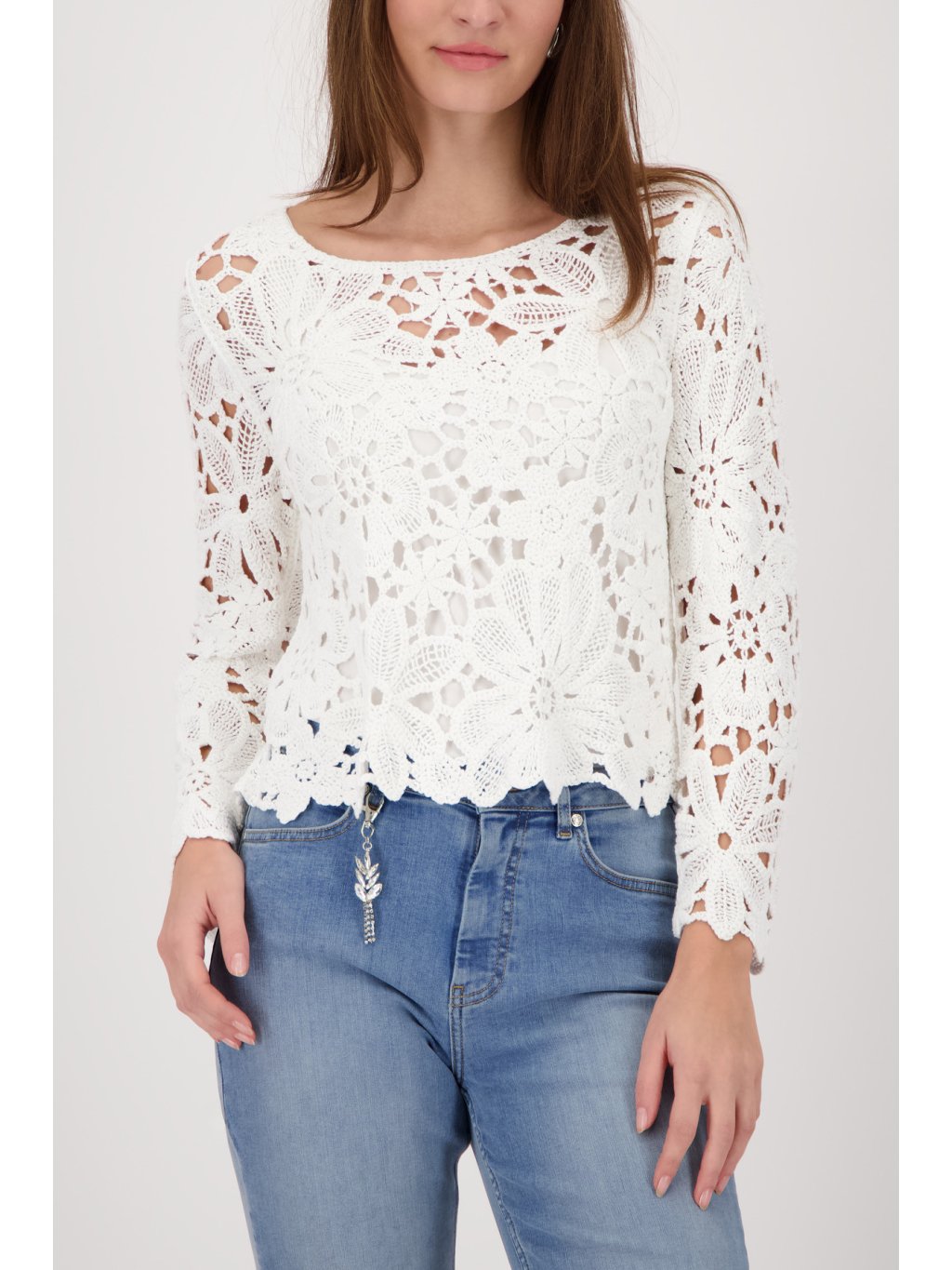 Dámský krajkový svetr Monari Elegantní dámský svetr Monari zaujme na první pohled svým jemným a velmi ženským designem. Svetr Monari je vyroben z výrazné krajkové struktury s květinovým motivem, která dodává modelu lehkost, vzdušnost a romantický vzhled. Model má kulatý výstřih a dlouhé rukávy, které jsou stejně jako celý svetr zdobené bohatým krajkovým vzorem. Díky propracovaným detailům působí svetr velmi elegantně a zároveň moderně. Spodní lem je zakončen jemným krajkovým okrajem, který podtrhuje jeho ženský styl. Svetr Monari se skvěle kombinuje s džínami, elegantními kalhotami i sukní a je ideální volbou pro ženy, které mají rády stylovou a originální módu německé značky Monari.Doplňkové parametry