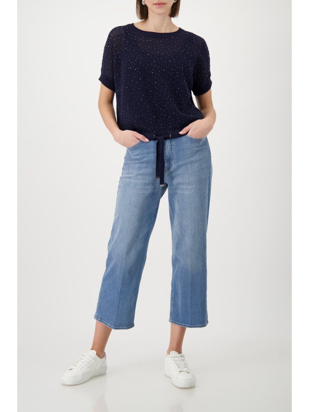 Tenhle svetr od značky Monari je přesně ten typ kousku, který oblékneš a okamžitě víš, že vypadáš dobře. Bez složitého kombinování, bez přemýšlení. Svetr Monari v tmavě modré barvě působí elegantně a nadčasově, zatímco jemně třpytivý efekt dodává outfitu nenápadný, ale luxusní nádech. Volnější střih ti zajistí maximální pohodlí a spodní stažení na šňůrku umožní upravit siluetu přesně podle nálady i postavy. Tohle je kousek, který funguje přes den i večer. Stačí změnit doplňky – a máš úplně jiný look. Pokud chceš mít ve skříni jistotu, po které sáhneš vždy, svetr Monari je přesně ten typ investice, co se ti vrátí. Tip na styling: Kombinuj s úzkými kalhotami nebo džínami, přidej jednoduché boty a nech vyniknout jeho jemný třpyt – efekt „méně je víc“ tady funguje na 100 %.Doplňkové parametry