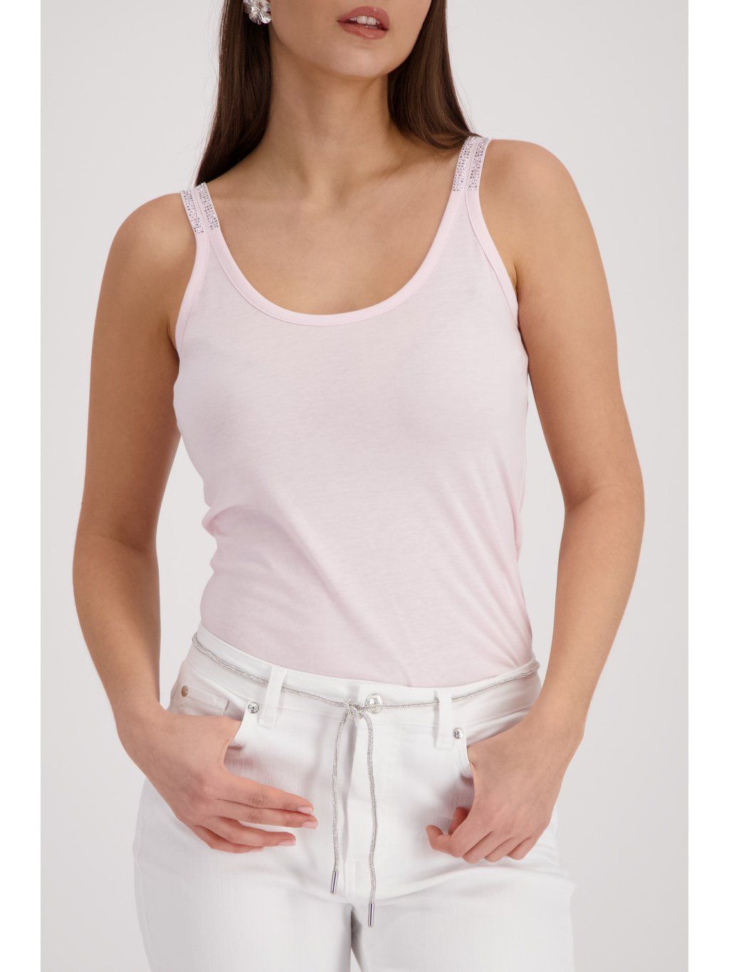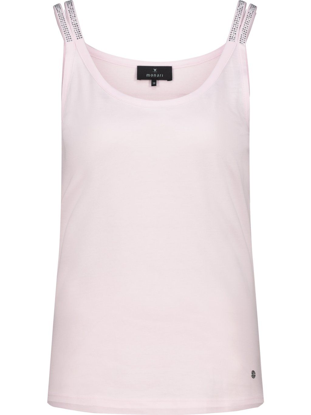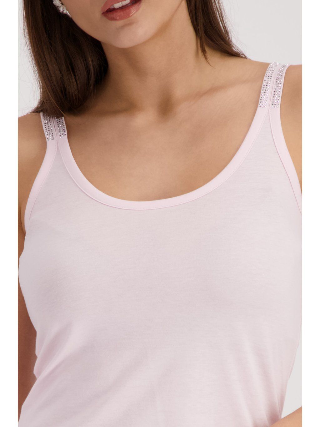 Jednoduché, ale rozhodně ne obyčejné. Toto tílko od značky Monari je přesně ten kousek, který pozvedne i ten nejzákladnější outfit. Tílko Monari v jemné světle růžové barvě působí něžně, svěže a velmi žensky. Hlavním prvkem jsou zdobená ramínka s třpytivými kamínky, která dodávají modelu elegantní a lehce luxusní nádech. Příjemný materiál a pohodlný střih zajistí maximální komfort po celý den. Tohle je přesně ten kousek, který funguje samostatně i jako stylový základ pod sako nebo košili. Pokud chceš něco jednoduchého, ale s efektem, který zaujme, tílko Monari je jasná volba. Tip na styling: Noste samostatně k džínám nebo sukni, případně pod sako – ramínka krásně vyniknou a dodají outfitu šmrnc.Doplňkové parametry