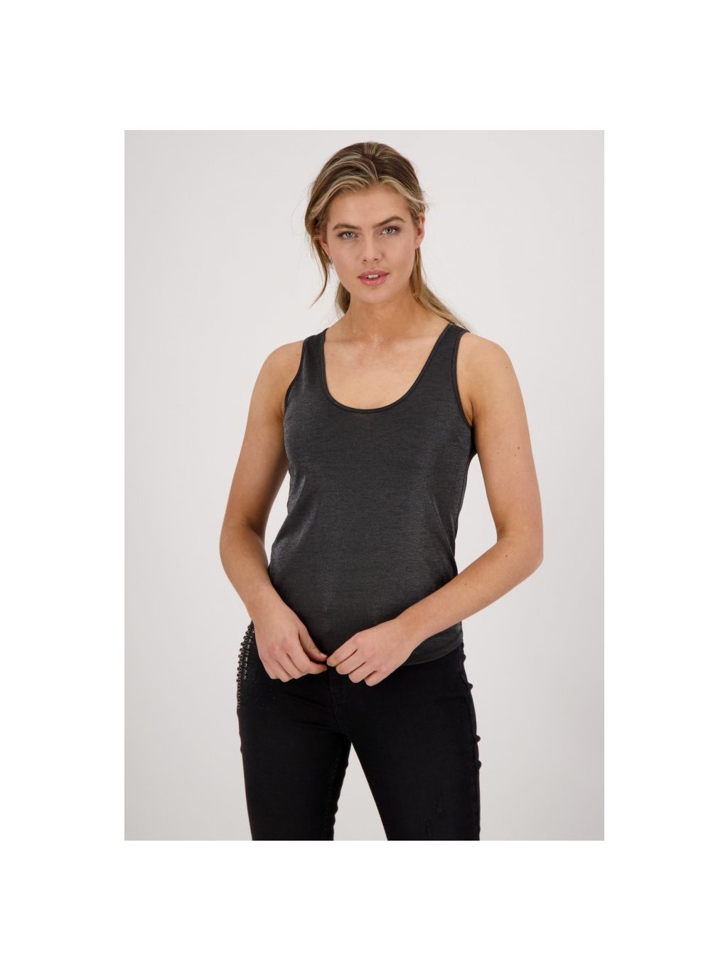 Dámské tílko s lesklou stříbrnou nitkou, kulatý výstřih, mírně projmutá střihově. Kvalitní a příjemný materiál je zárukou značky MONARI.