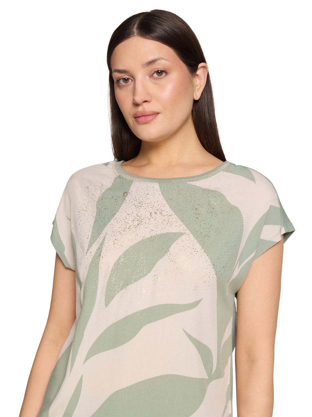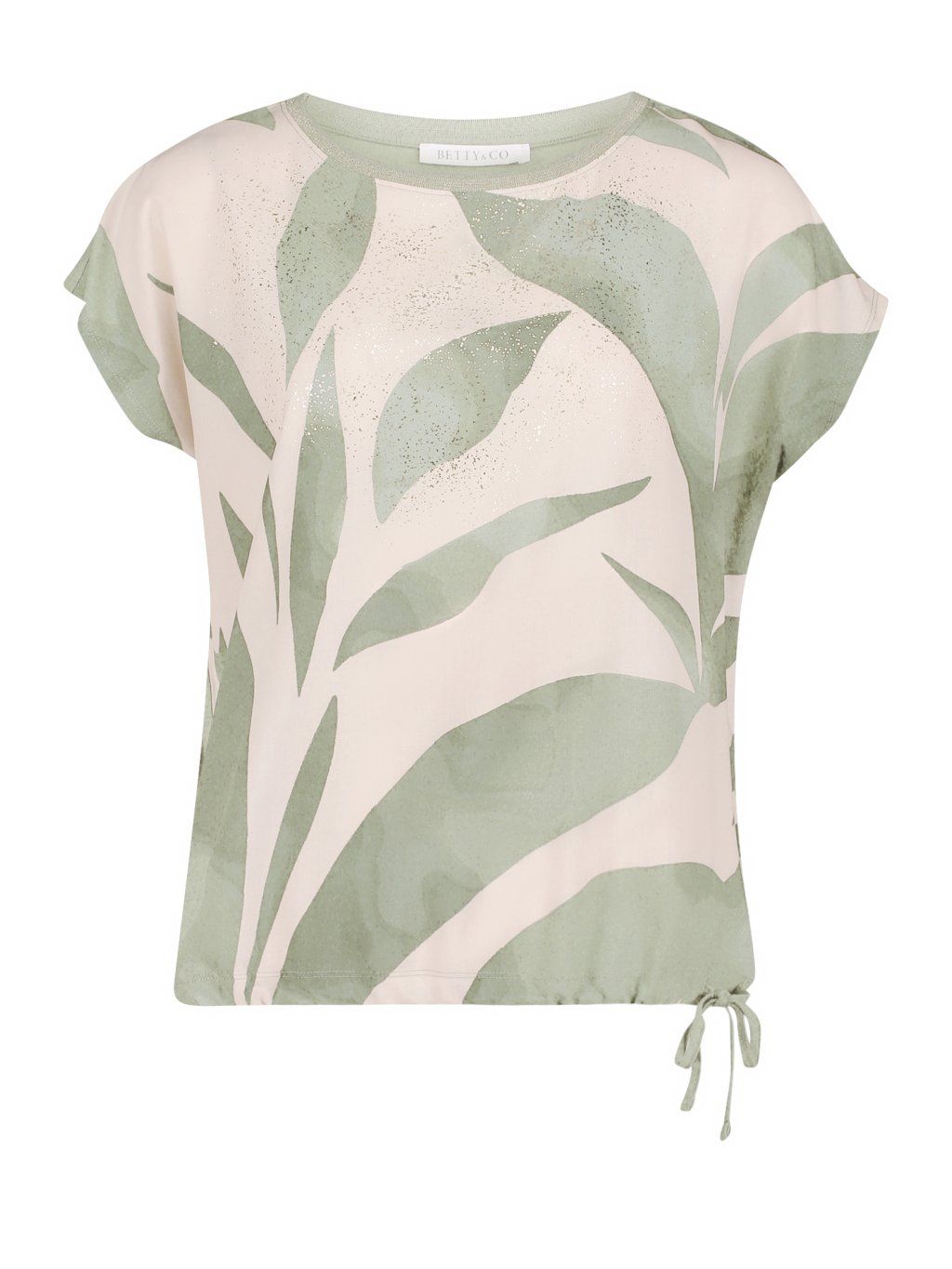 Dámské tričko od Betty & Co zaujme na první pohled svěžím přírodním potiskem v jemných zelených tónech, který působí velmi moderně a zároveň žensky. Tričko Betty & Co má volnější střih, krátké rukávy a praktické stažení na šňůrku ve spodní části, díky kterému si snadno upravíte siluetu podle své postavy. Lehký a příjemný materiál trička Betty & Co zaručuje komfort při nošení a dělá z něj ideální kousek pro každodenní outfit i letní dny.Doplňkové parametry