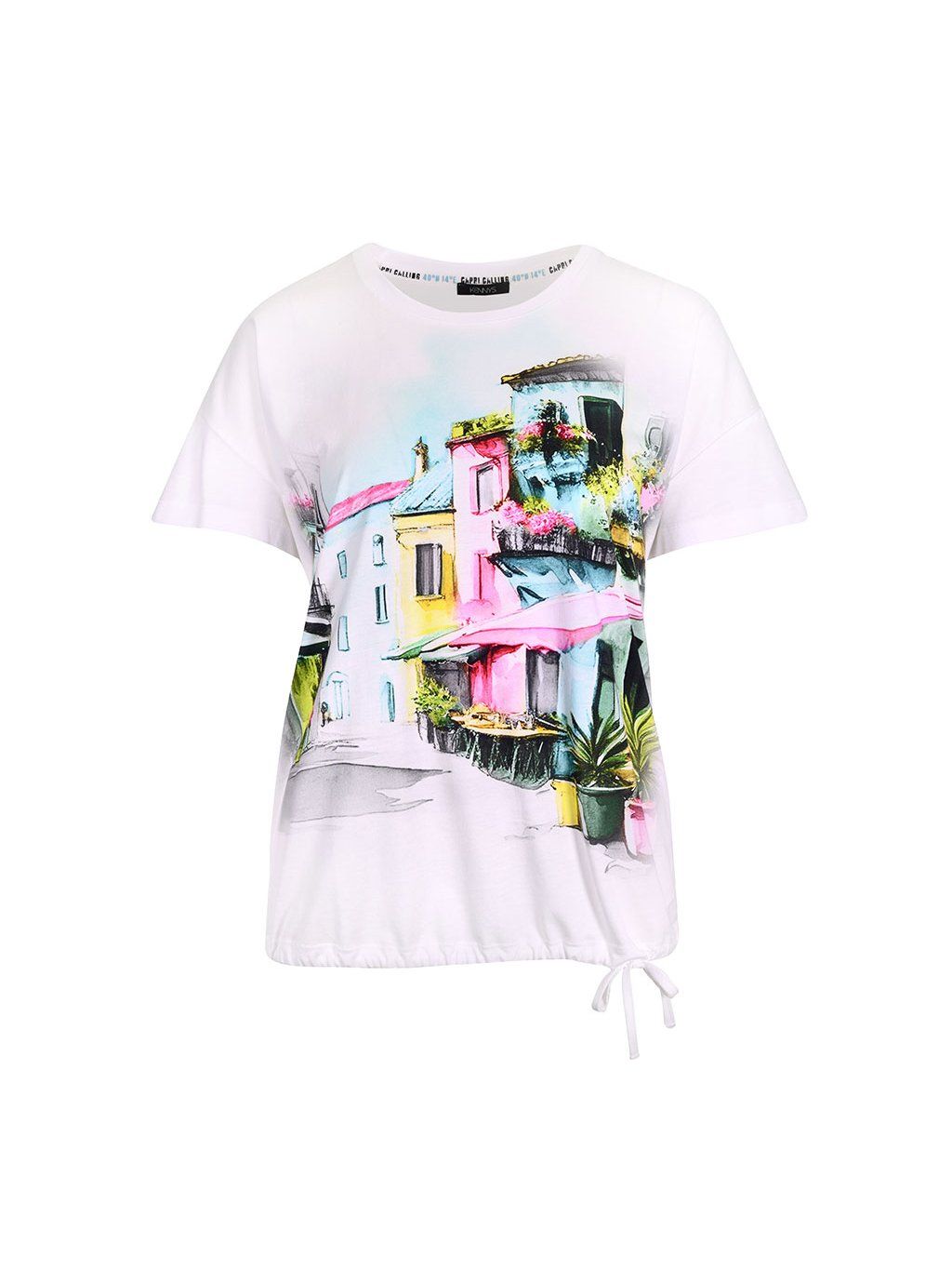 Dámské tričko KENNY S s kulatým výstřihem a krátkým rukávem zaujme moderním barevným potiskem na přední straně, který dodává modelu svěží a stylový vzhled, typický pro KENNY S. Tričko KENNY S je vyrobeno ze směsi bavlny a modalu, díky čemuž je mimořádně příjemné na nošení, lehké a perfektně se přizpůsobí postavě, jak je u KENNY S standardem. Spodní díl se šňůrkou umožňuje úpravu siluety podle potřeby, což dělá z trička KENNY S praktický a zároveň módní kousek pro každodenní nošení od KENNY S.