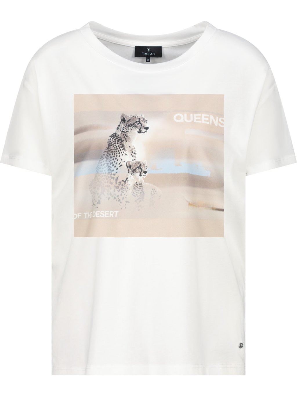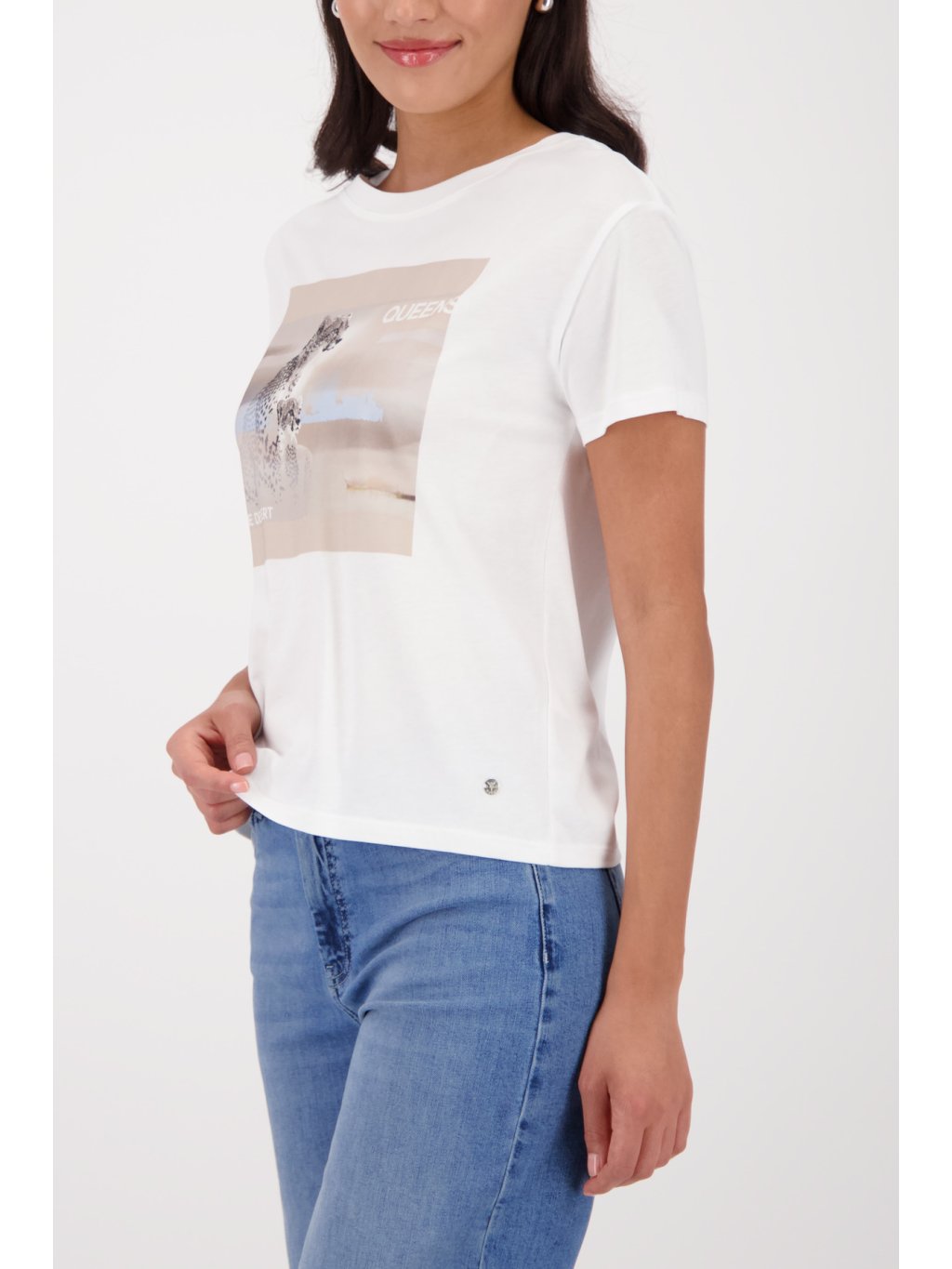 Stylové bílé dámské tričko Monari s moderním potiskem leoparda a nápisem. Příjemný materiál a pohodlný střih z něj dělají ideální kousek pro každodenní nošení – skvělé k džínům i k saku.Doplňkové parametry