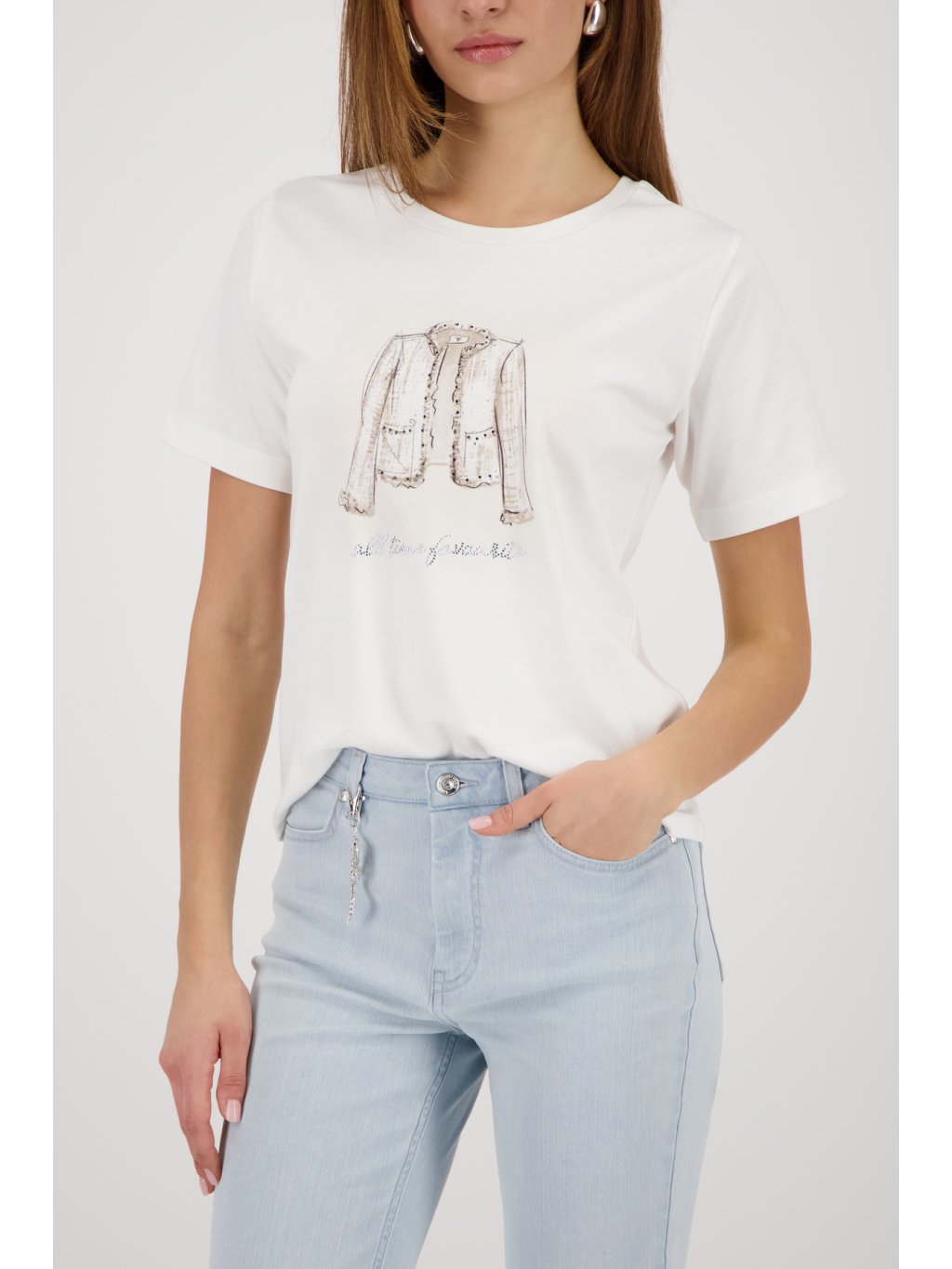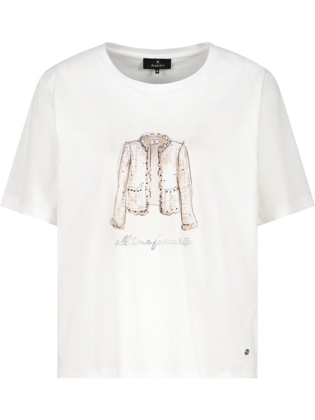 Bílé dámské tričko Monari s krátkým rukávem zaujme na první pohled elegantním potiskem módního saka na přední straně. Jemná ilustrace je doplněná decentními třpytivými detaily, které dodávají modelu luxusní nádech – přesně v duchu značky Monari. Tričko Monari má pohodlný, rovnější střih a příjemný materiál, díky kterému se skvěle nosí po celý den. Snadno ho zkombinujete s džínami pro ležérní outfit i se sakem pro sofistikovanější vzhled. Nadčasový kousek, který oživí každý šatník.Doplňkové parametry