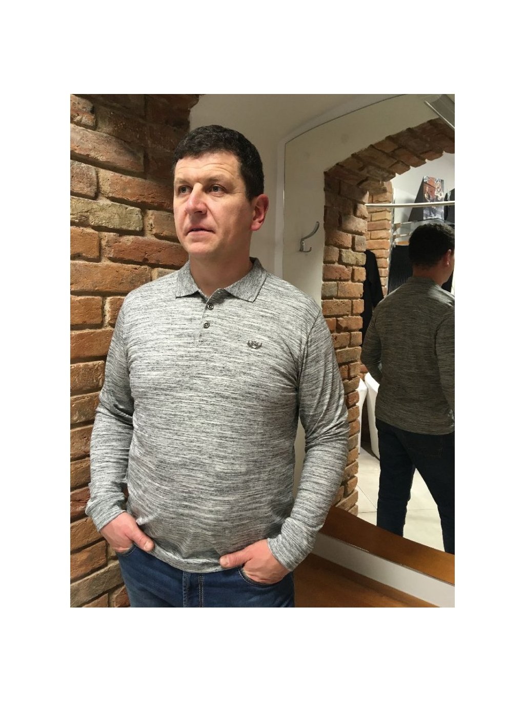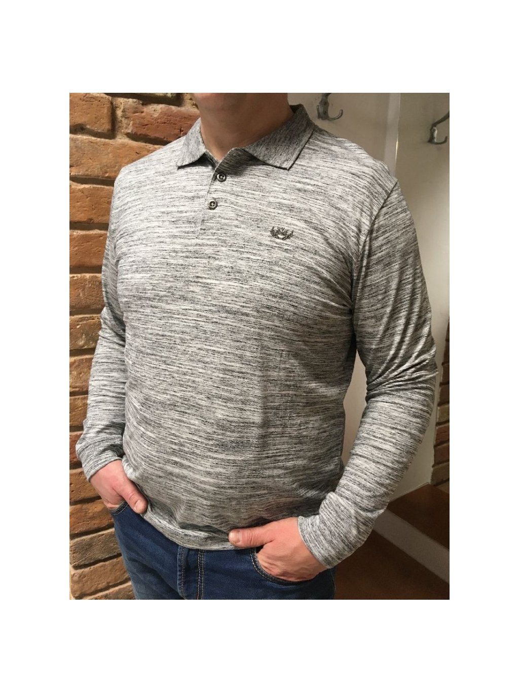 Pánské šedé bavlněné triko, jemný melírek, zapínání na tři knoflíky, navlékání přes hlavu. Velmi elegantní s dlouhým rukávem, příjemný materiál, hebký na omak.