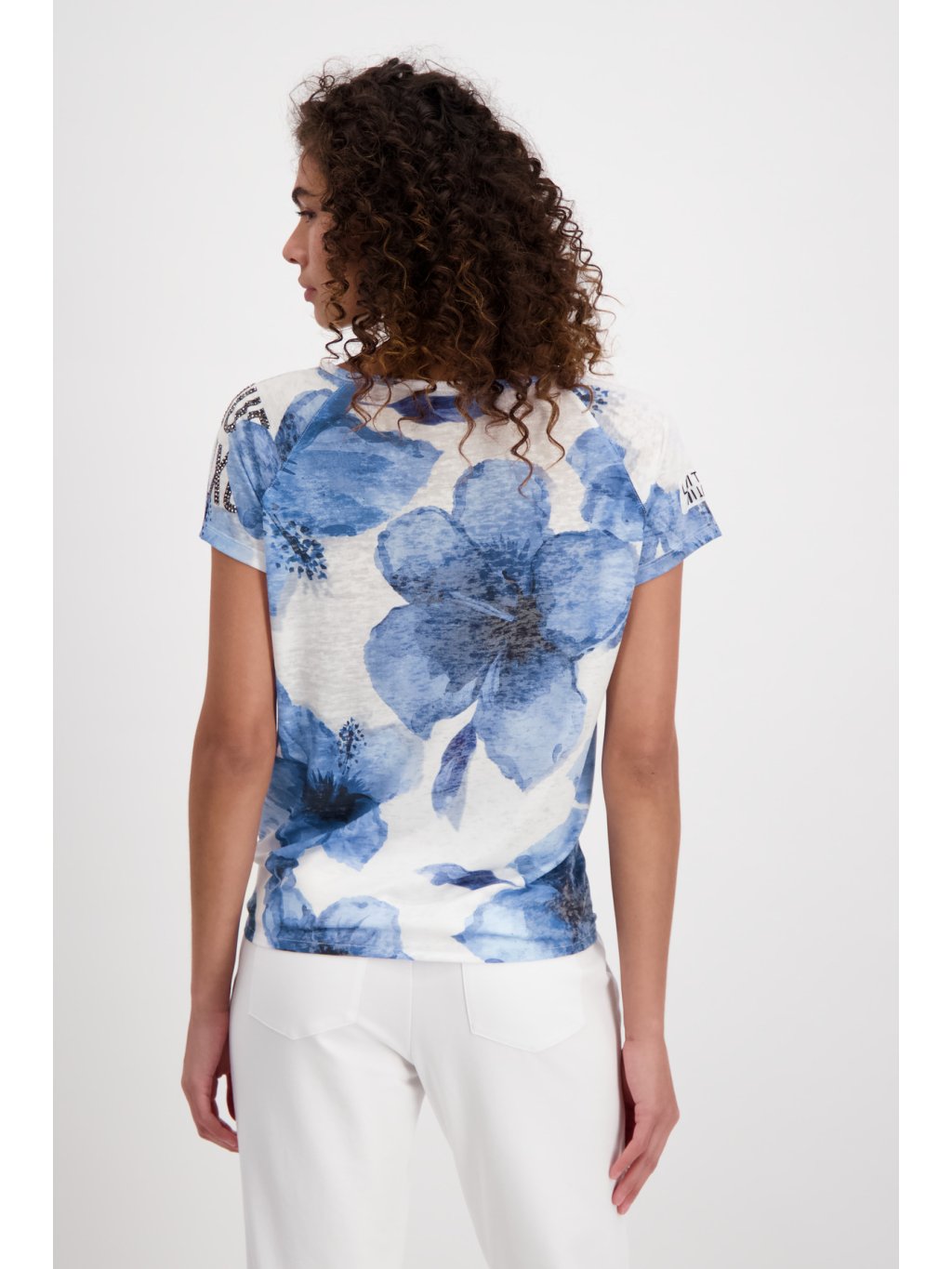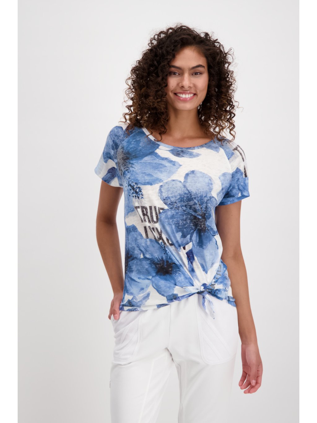 Krásné elegantní triko od MONARI s květinovým vzorem. Triko zdobí rozparek s uzlíkem a kamínkový nápis na levém rukávu. Toto triko je skvělé na letní, horké dny.