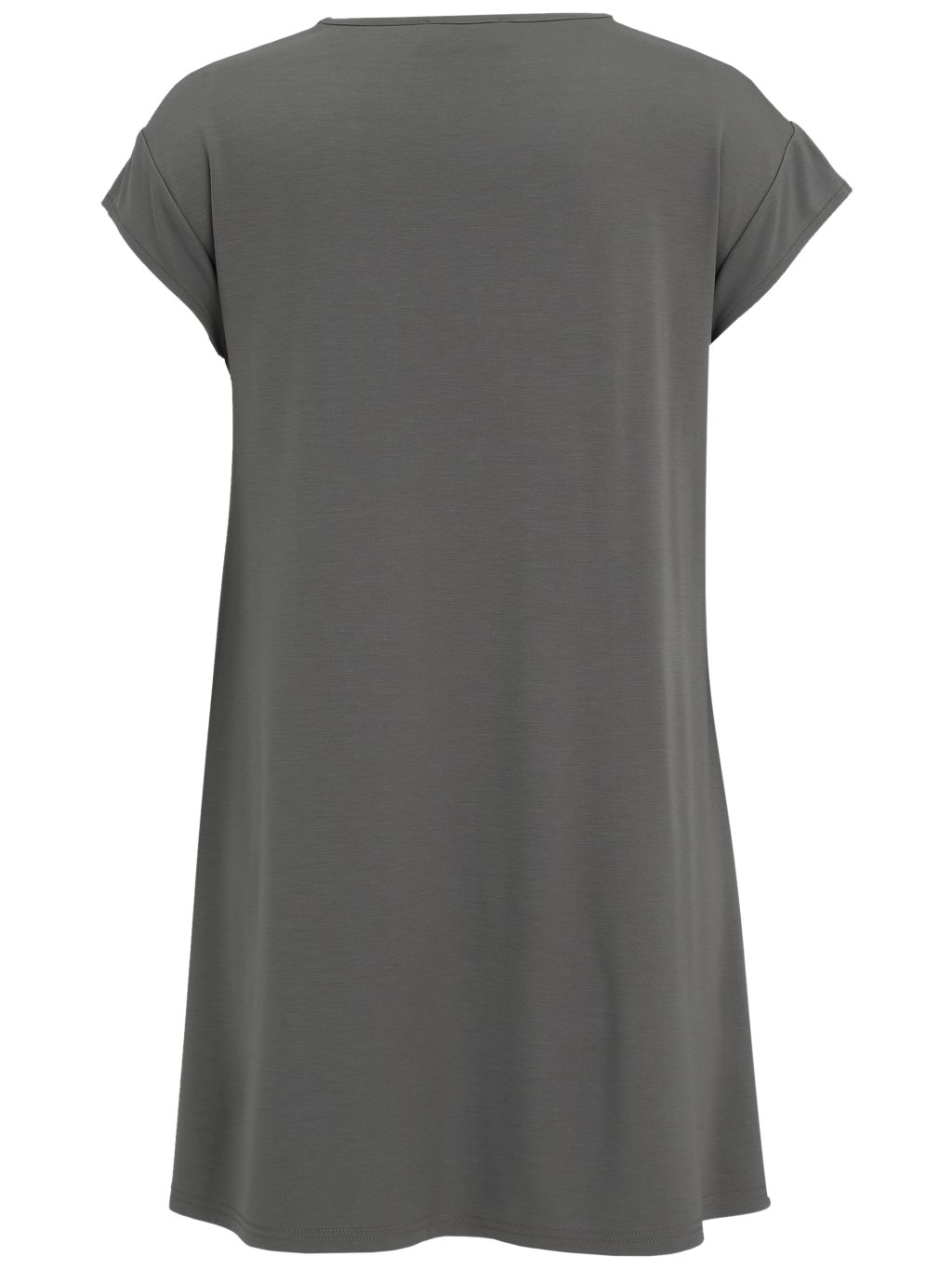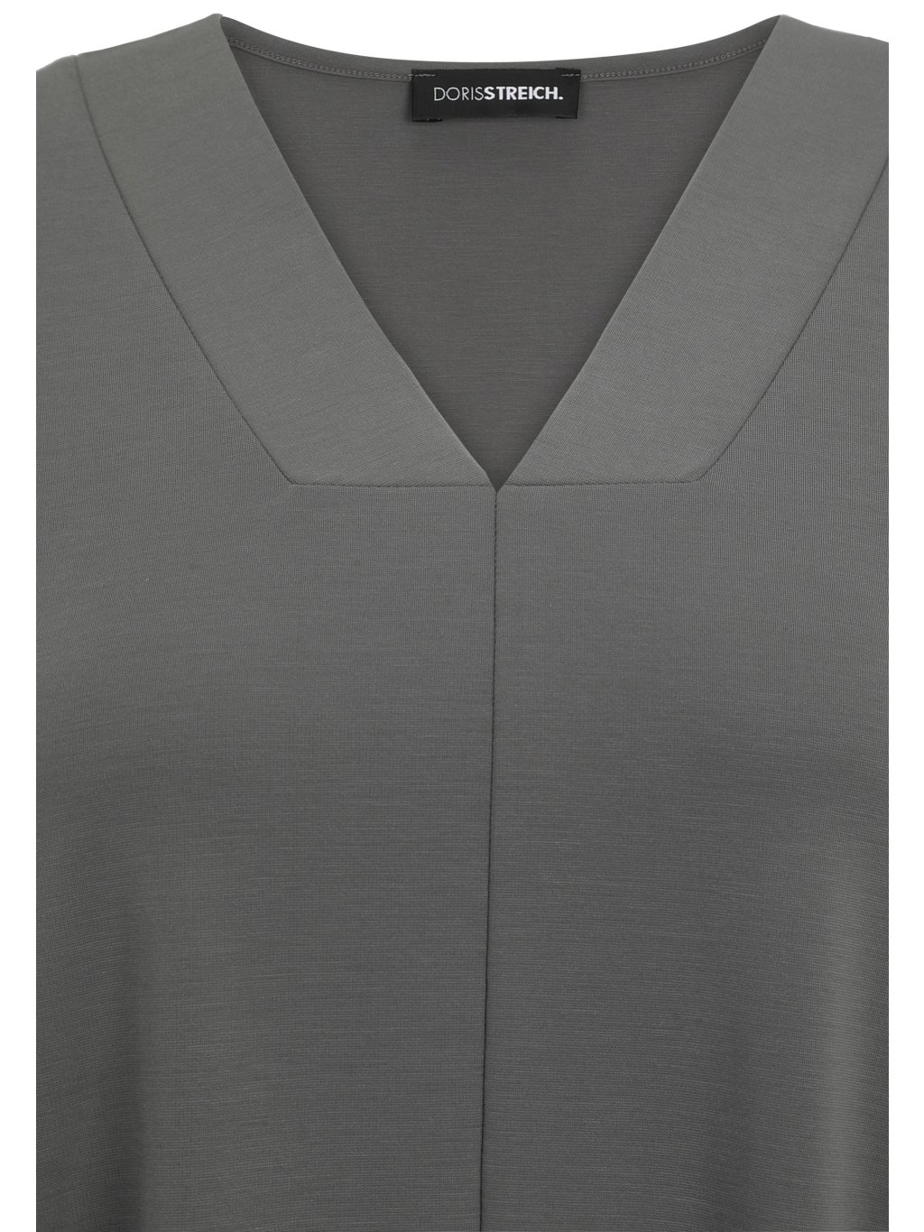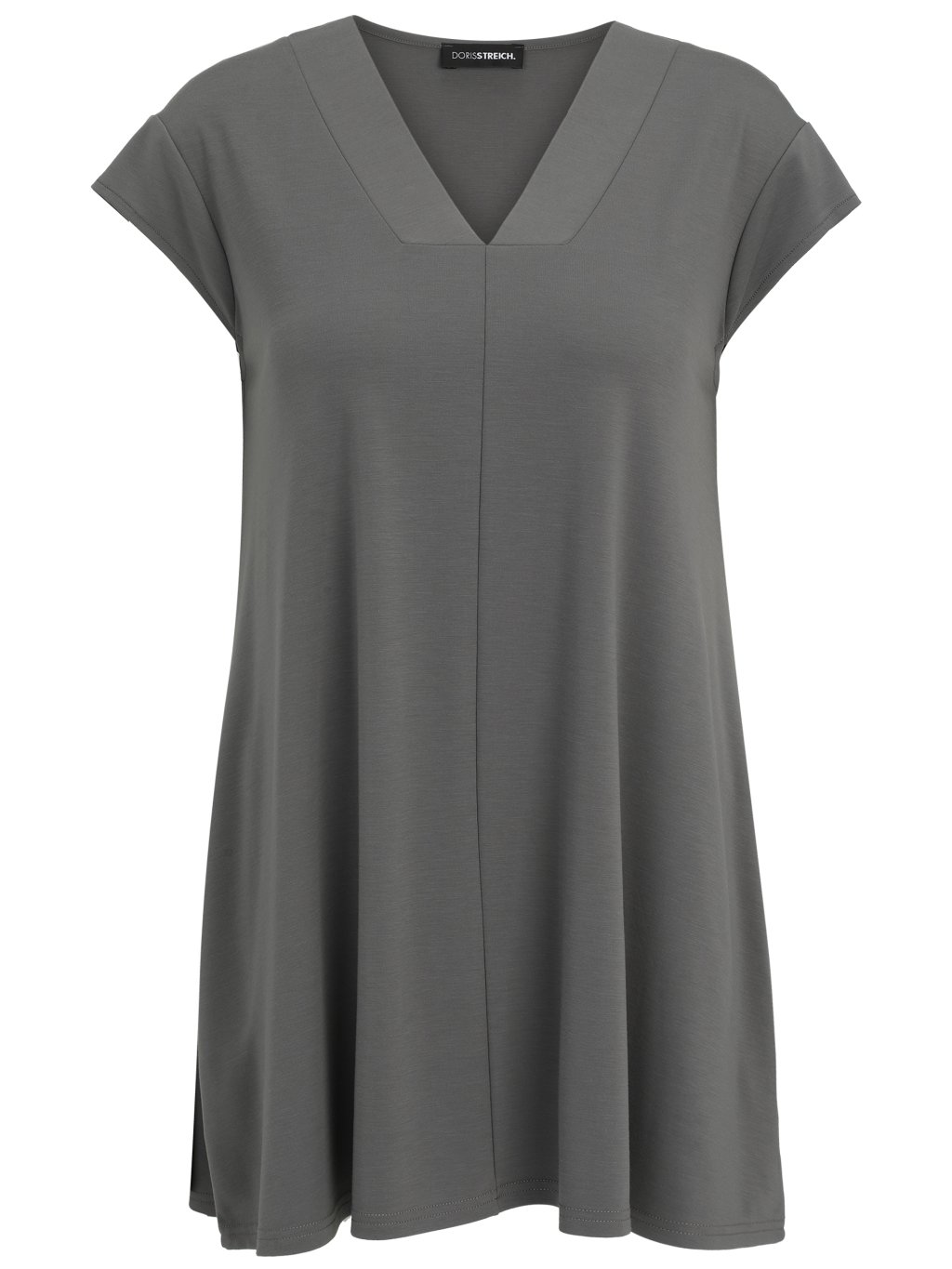 Jednoduchost, která funguje. Tato tunika v elegantním tmavě šedém odstínu zaujme čistými liniemi a moderním, uvolněným střihem. Minimalistický design dává vyniknout kvalitě materiálu i preciznímu zpracování. Volnější áčkový střih krásně splývá a lichotí postavě, aniž by omezoval v pohybu. Výstřih do „V“ opticky prodlužuje siluetu a dodává modelu ženský nádech. Krátké rukávy působí lehce a dělají z tuniky ideální volbu pro každodenní nošení i vrstvení. Příjemný, splývavý materiál zajišťuje celodenní komfort. Tunika se skvěle kombinuje s úzkými kalhotami, legínami i džínami a vytvoří elegantní i ležérní outfit podle zvolených doplňků. Model od Doris Streich je důkazem, že v jednoduchosti je síla. Pokud hledáte univerzální kousek, který využijete do práce i na volný čas, Doris Streich nabízí styl, pohodlí a nadčasový design v jednom.