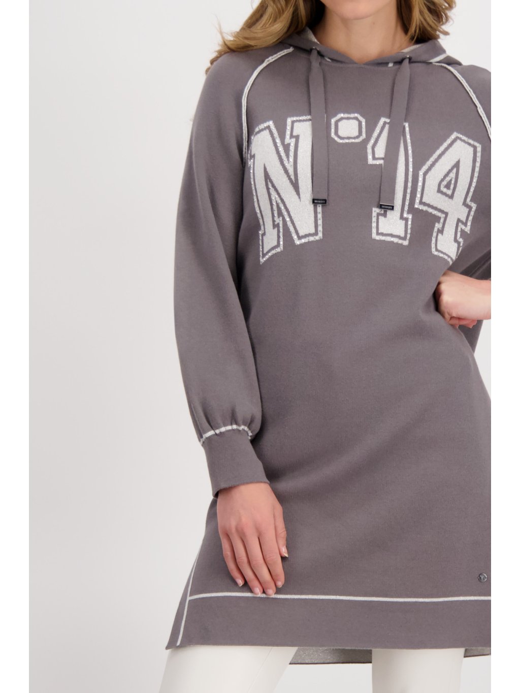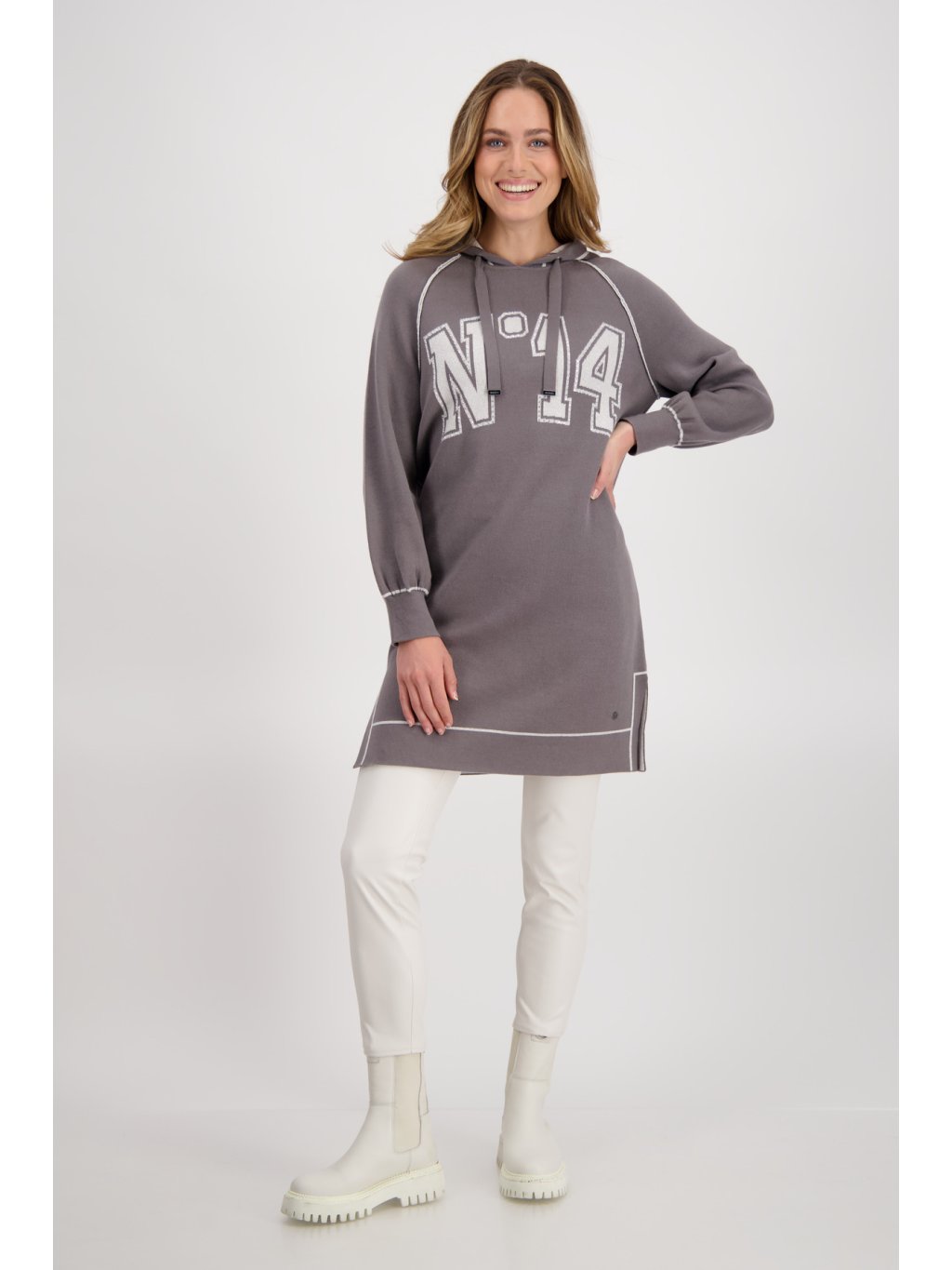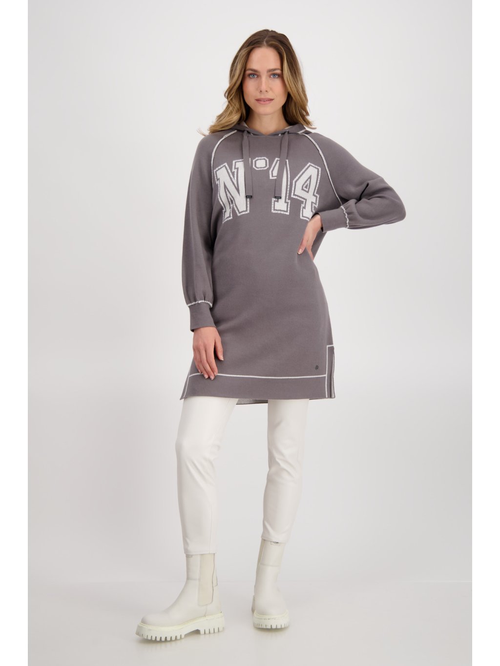 Úpletové šaty s kapucí a stříbrným nápisem na přední části. Šaty mají dlouhý rukáv a po obou stranách vkusný rozparek. Jsou vhodné pro podzimní dny.