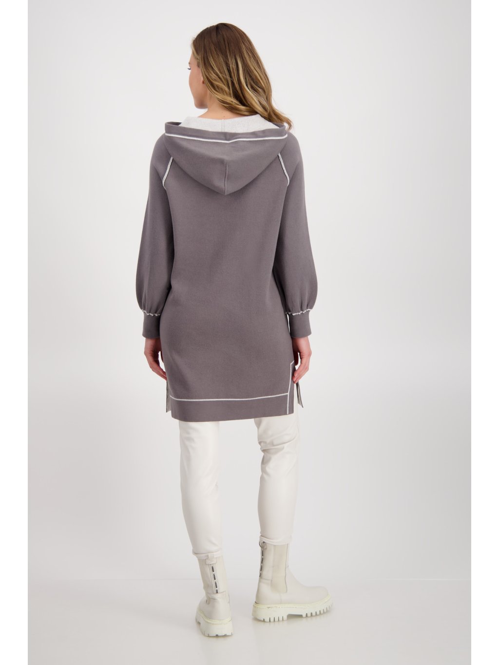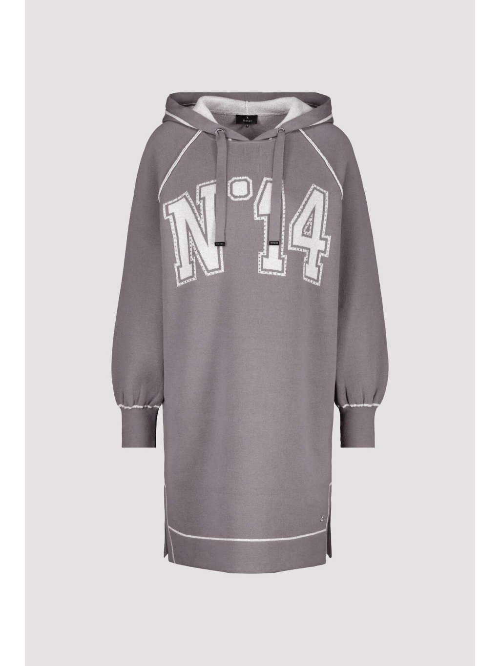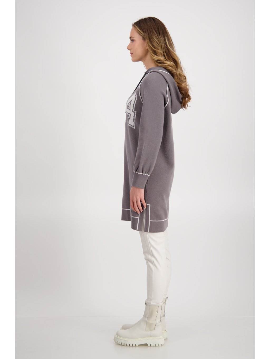 Úpletové šaty s kapucí a stříbrným nápisem na přední části. Šaty mají dlouhý rukáv a po obou stranách vkusný rozparek. Jsou vhodné pro podzimní dny.